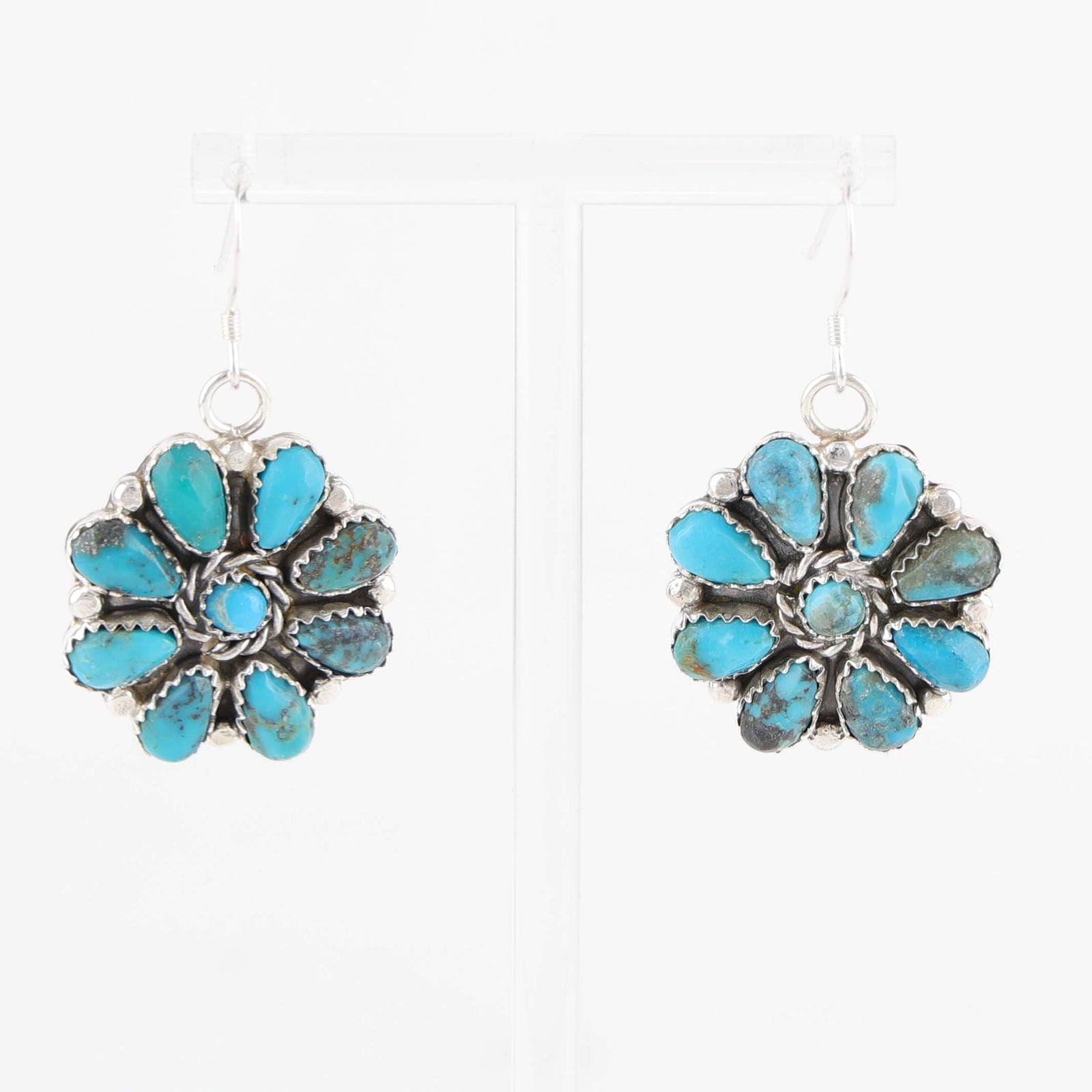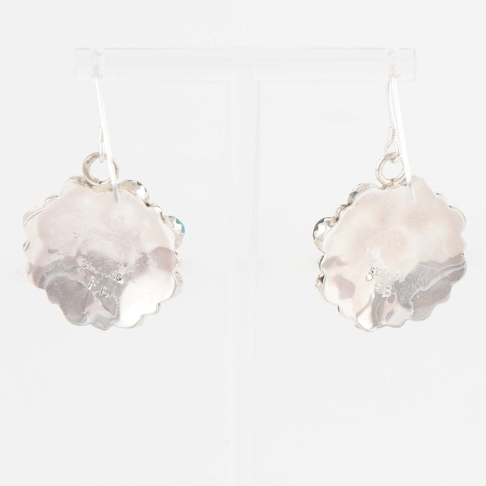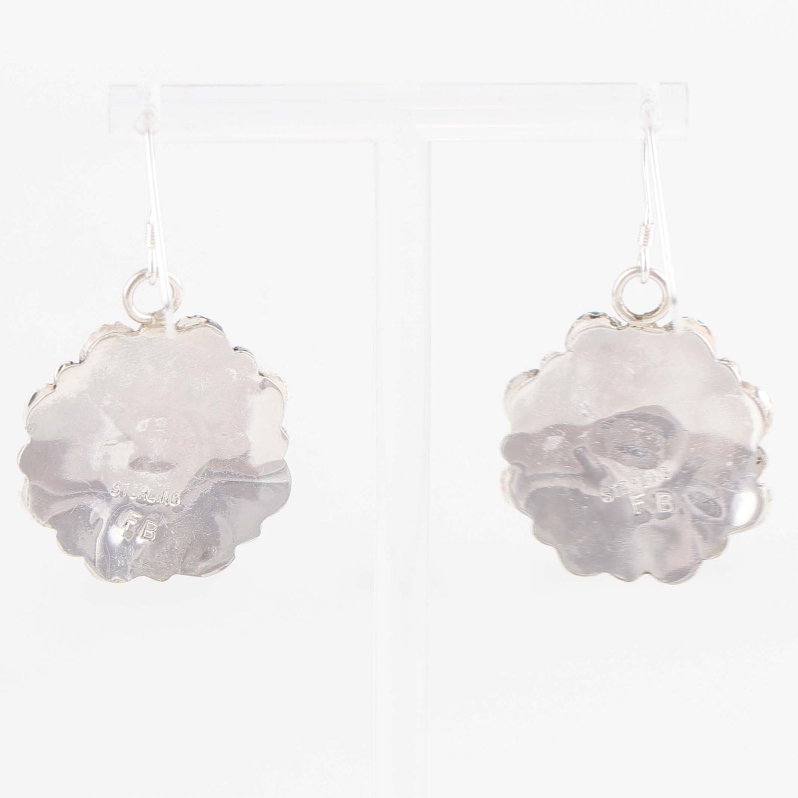 Sterling Silver French Hook Earrings Featuring a Sun and Mountain Design with Turquoise Chip Inlay.