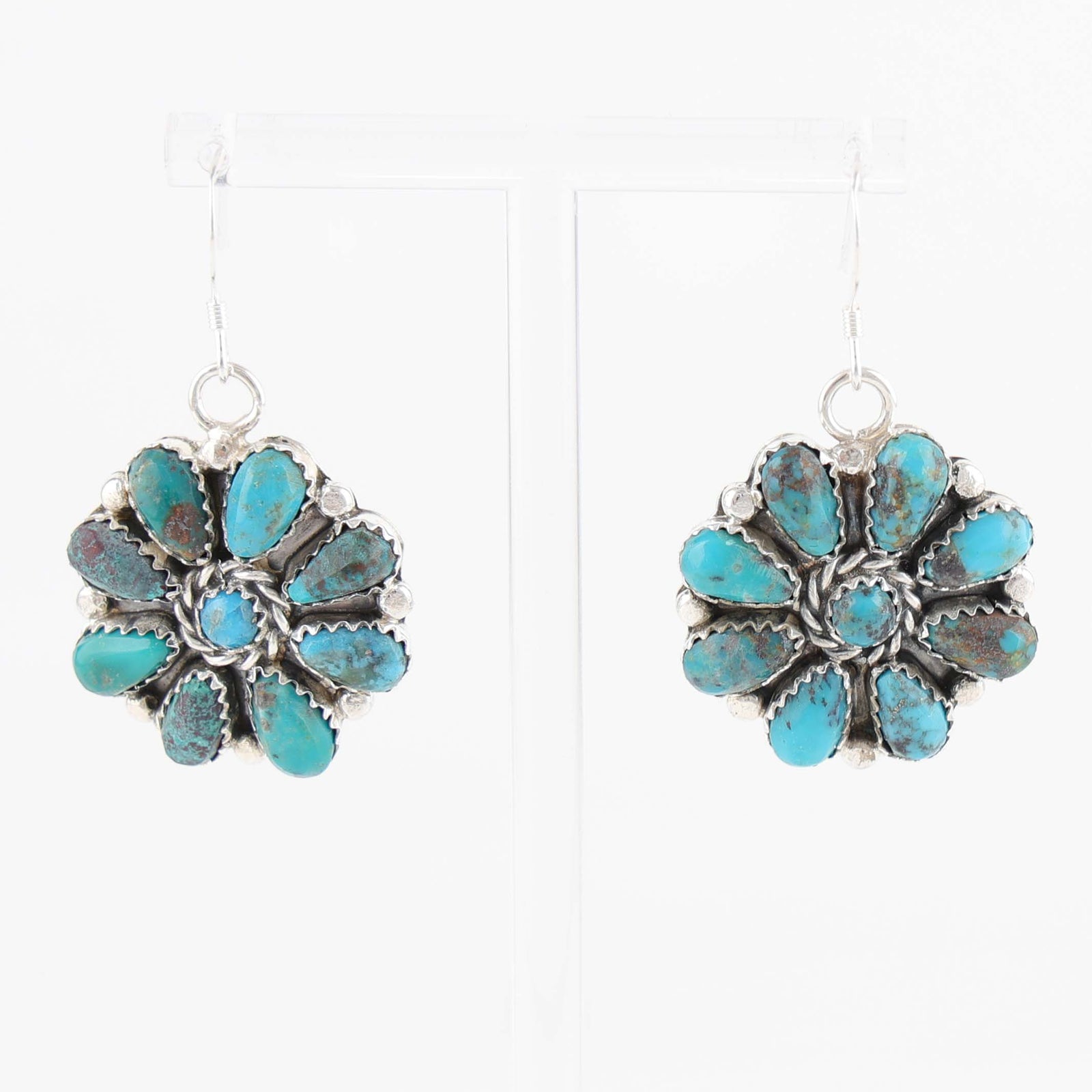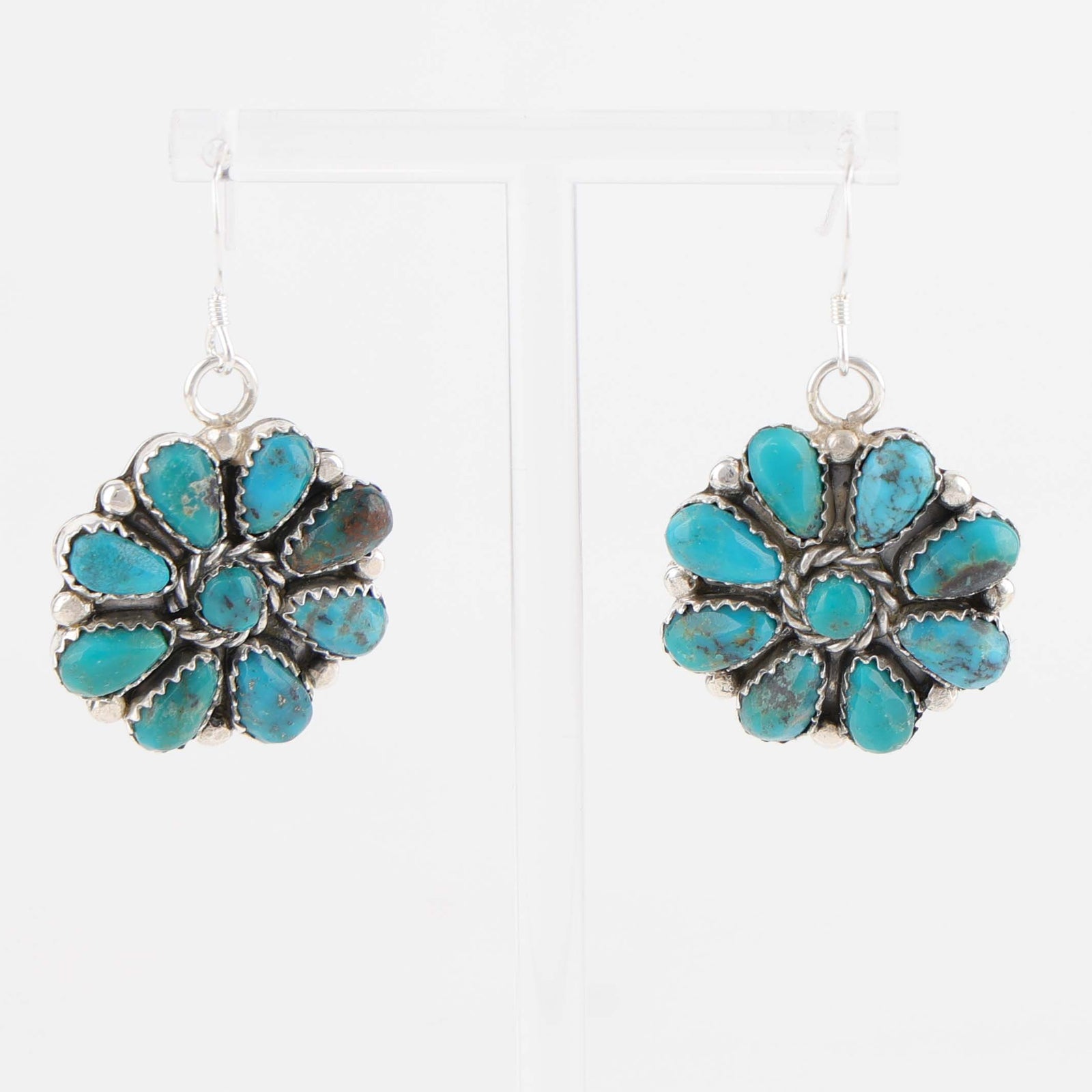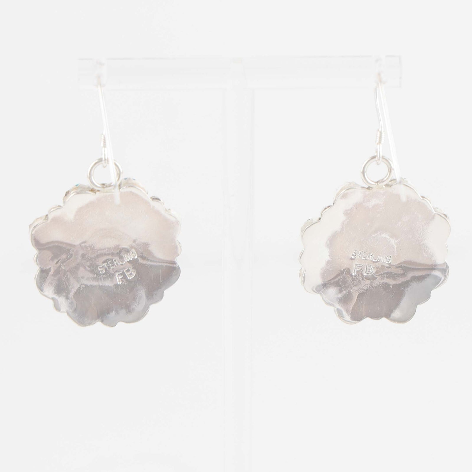 Sterling Silver French Hook Earrings Featuring a Sun and Mountain Design with Turquoise Chip Inlay.