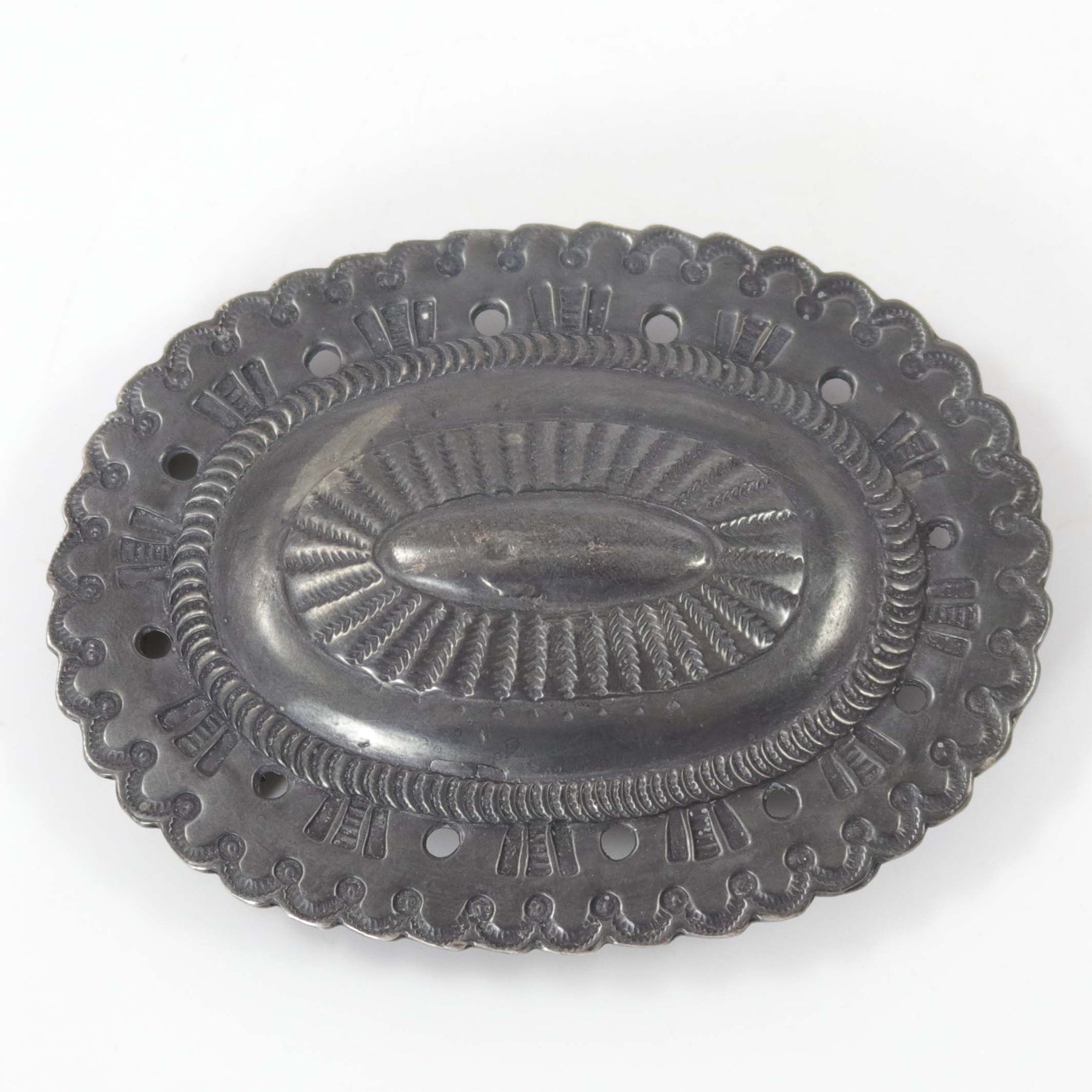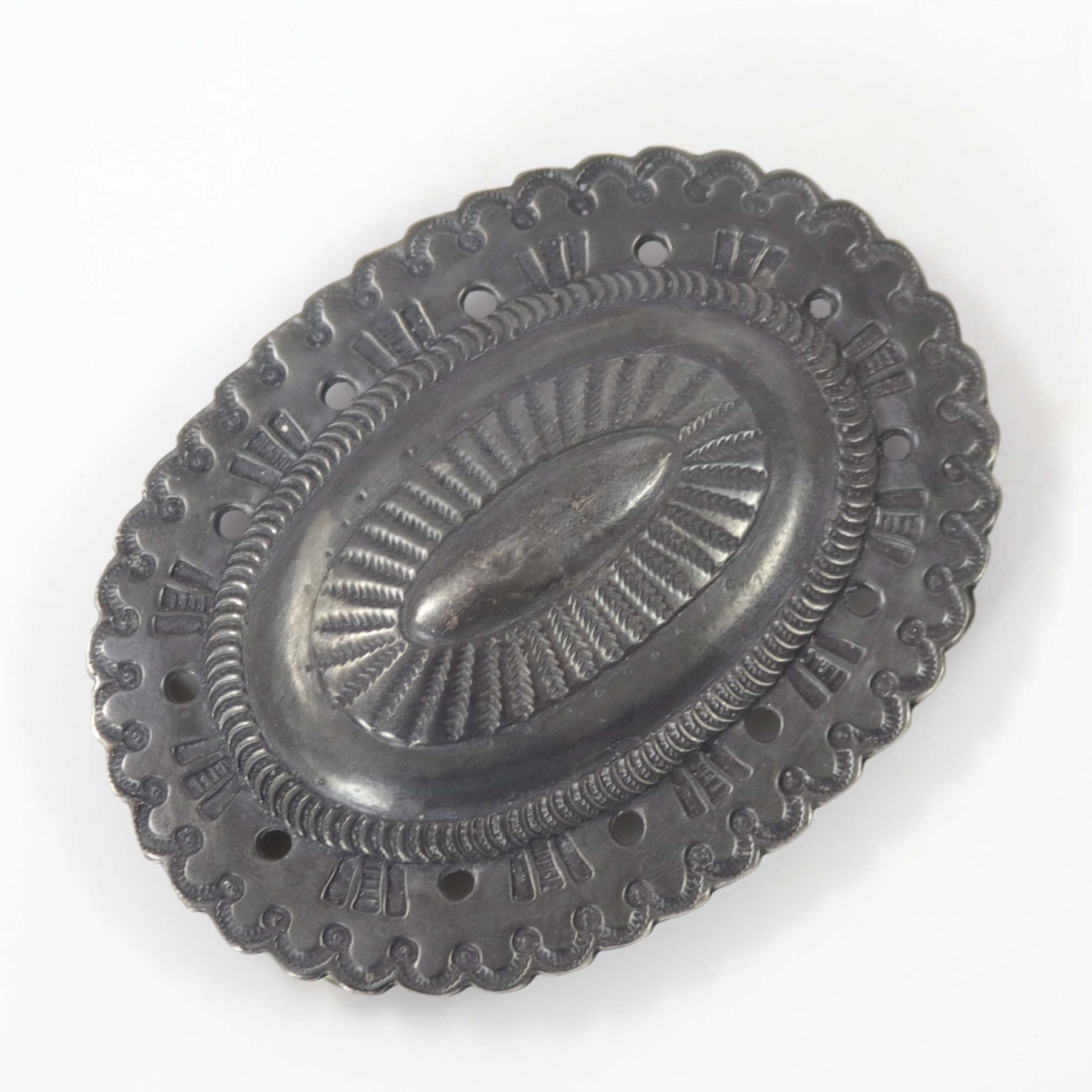 Antique Navajo Sterling Silver Belt Buckle in the style of a Second Phase Concho Belt. Likely made in the early 20th century (circa 1920s–1930s), this buckle was originally a Second Phase-style concho featuring scalloped edges, repousse work, and hand-stamped designs. Unlike First Phase conchos with open slots, Second Phase conchos typically had copper loops or slotted bars on the reverse to pass the leather strap behind the concho. The original copper loops were removed, and belt buckle hardware was added, making it a functional and historically significant accessory.