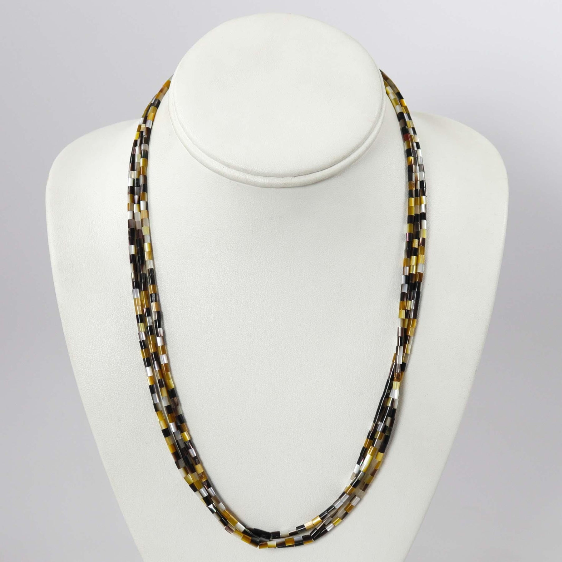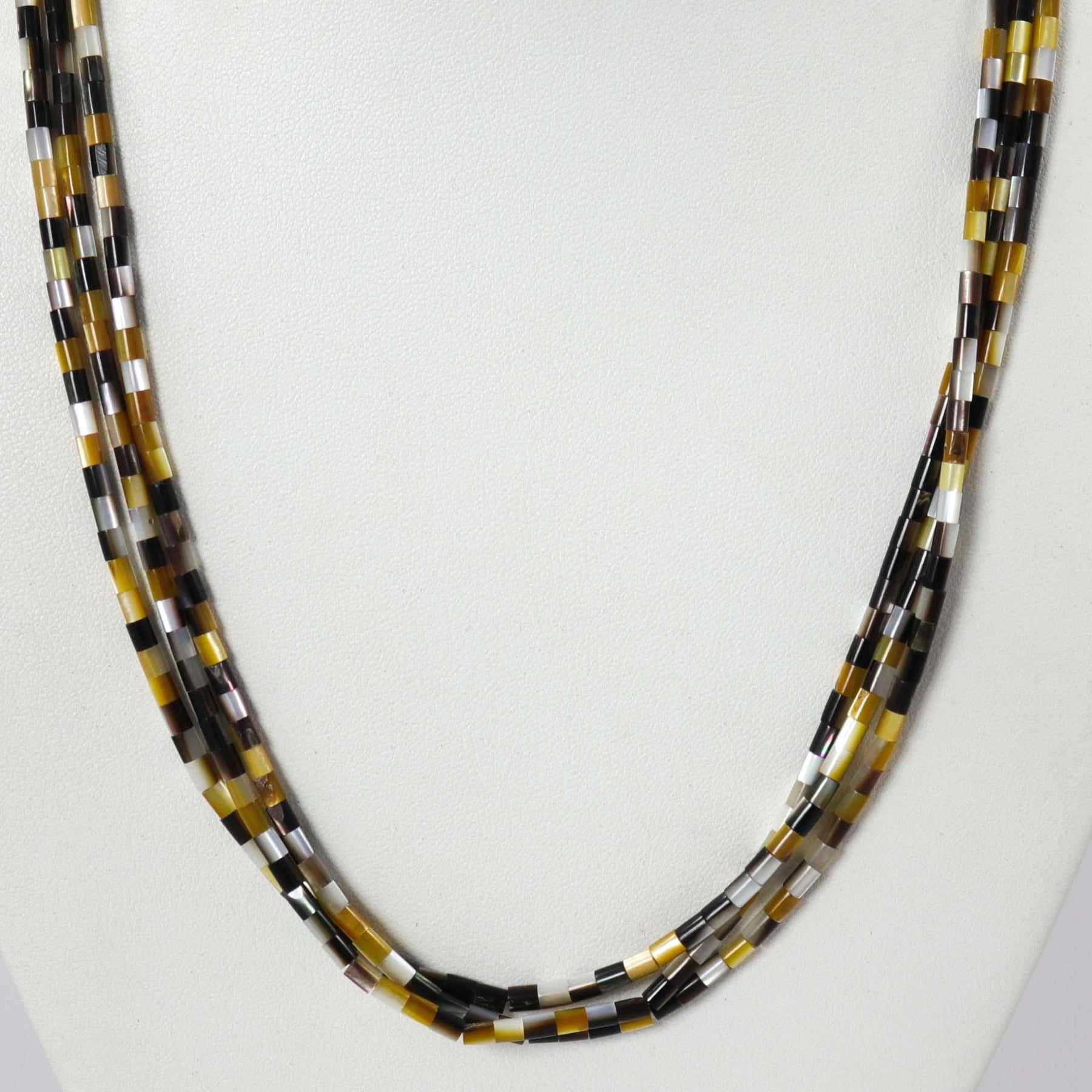 Three Strand Bead Necklace with Hand-Rolled Mother of Pearl Shell Heishi Beads.