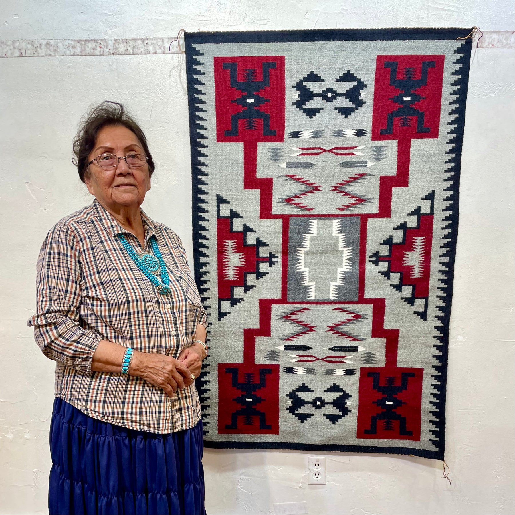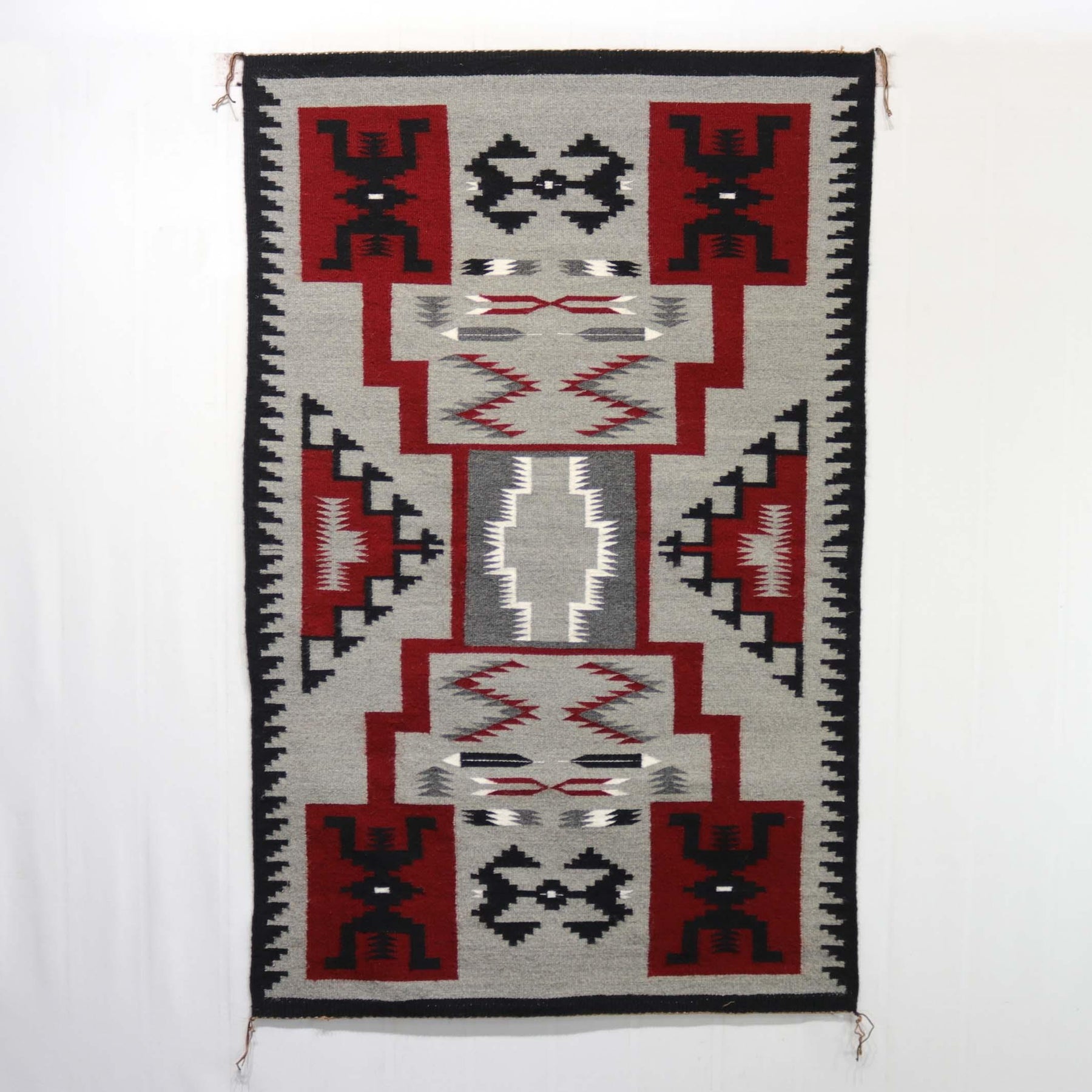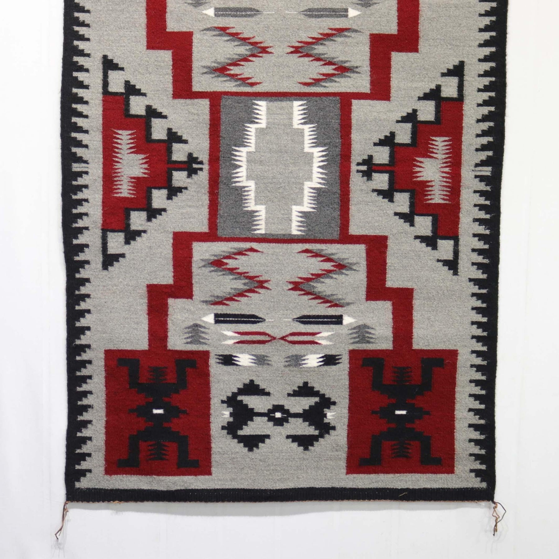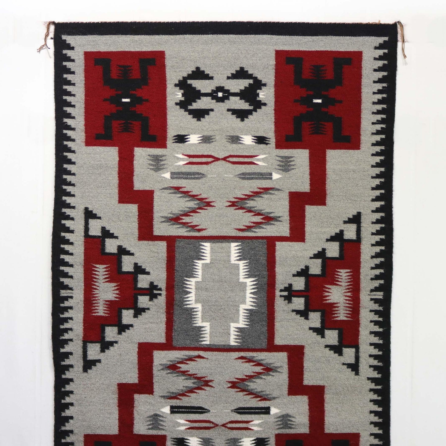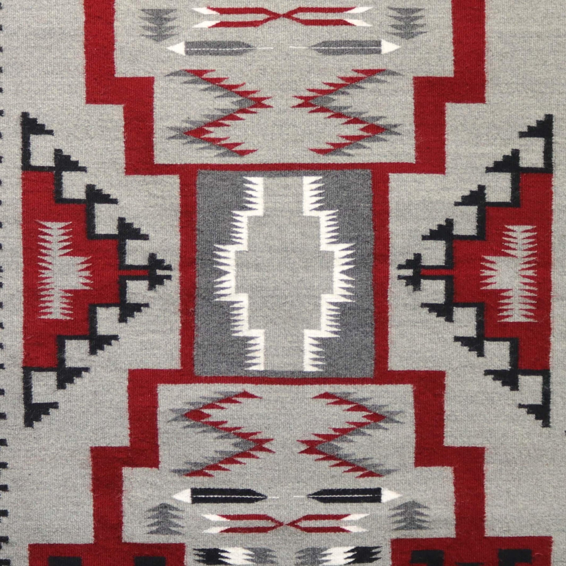 Handwoven Navajo Storm Pattern Weaving with a Grey Background and Red Accents.