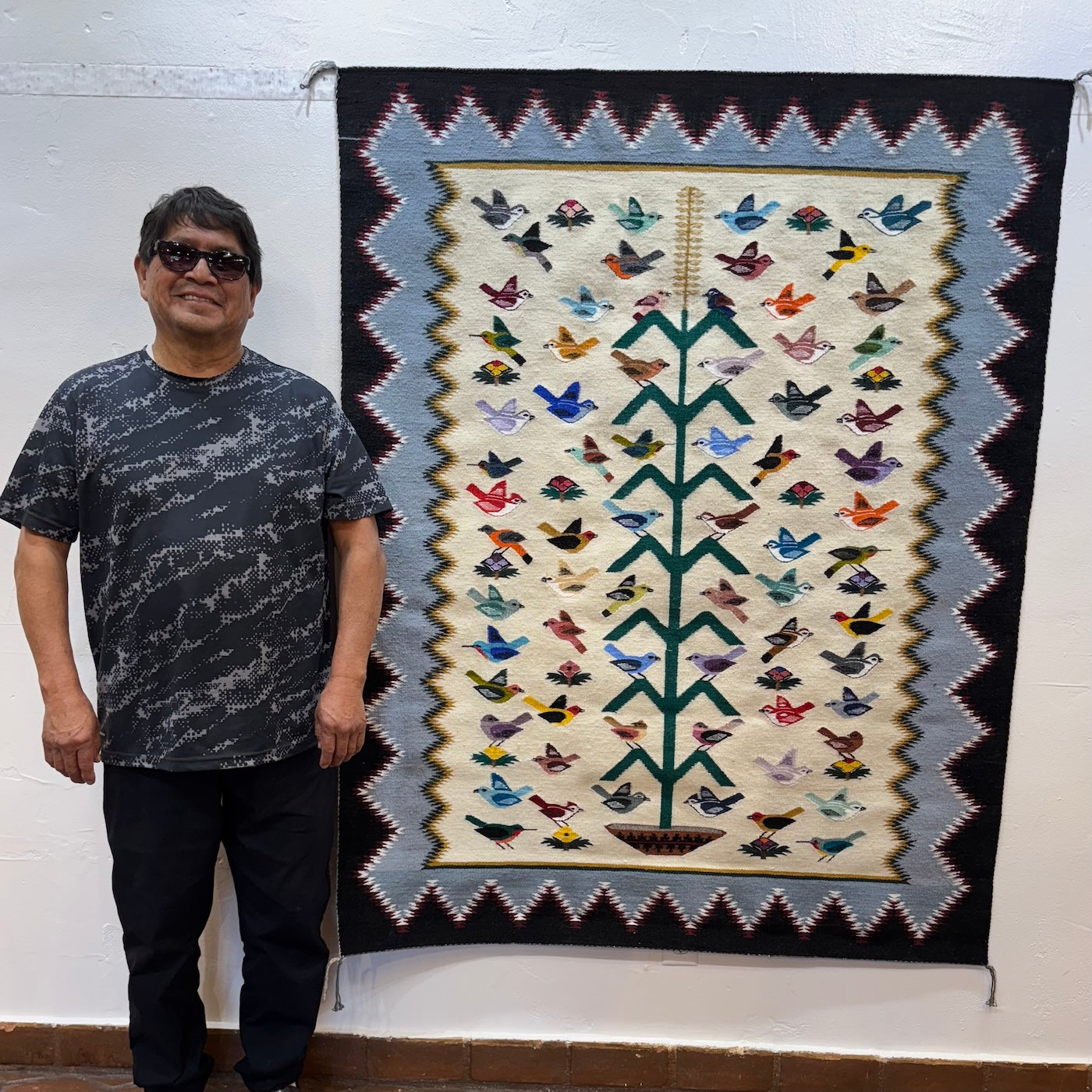 Handwoven Navajo Bird Pictorial (Tree of Life) Weaving with a Corn Stalk Emerging from a Ceremonial Basket and Surrounded by 68 Colorful Birds. This weaving is made with homespun wool from the Nez family’s own sheep.
