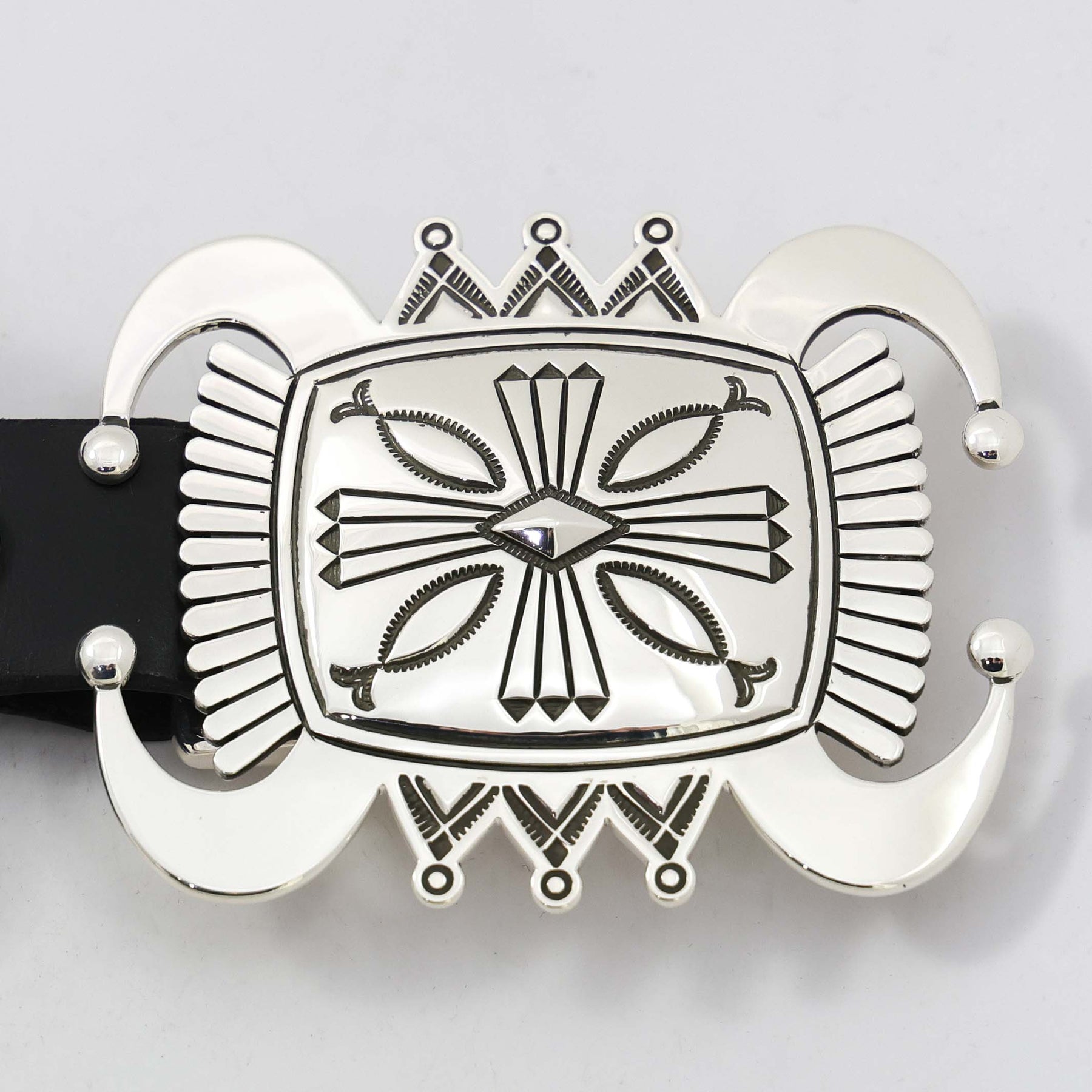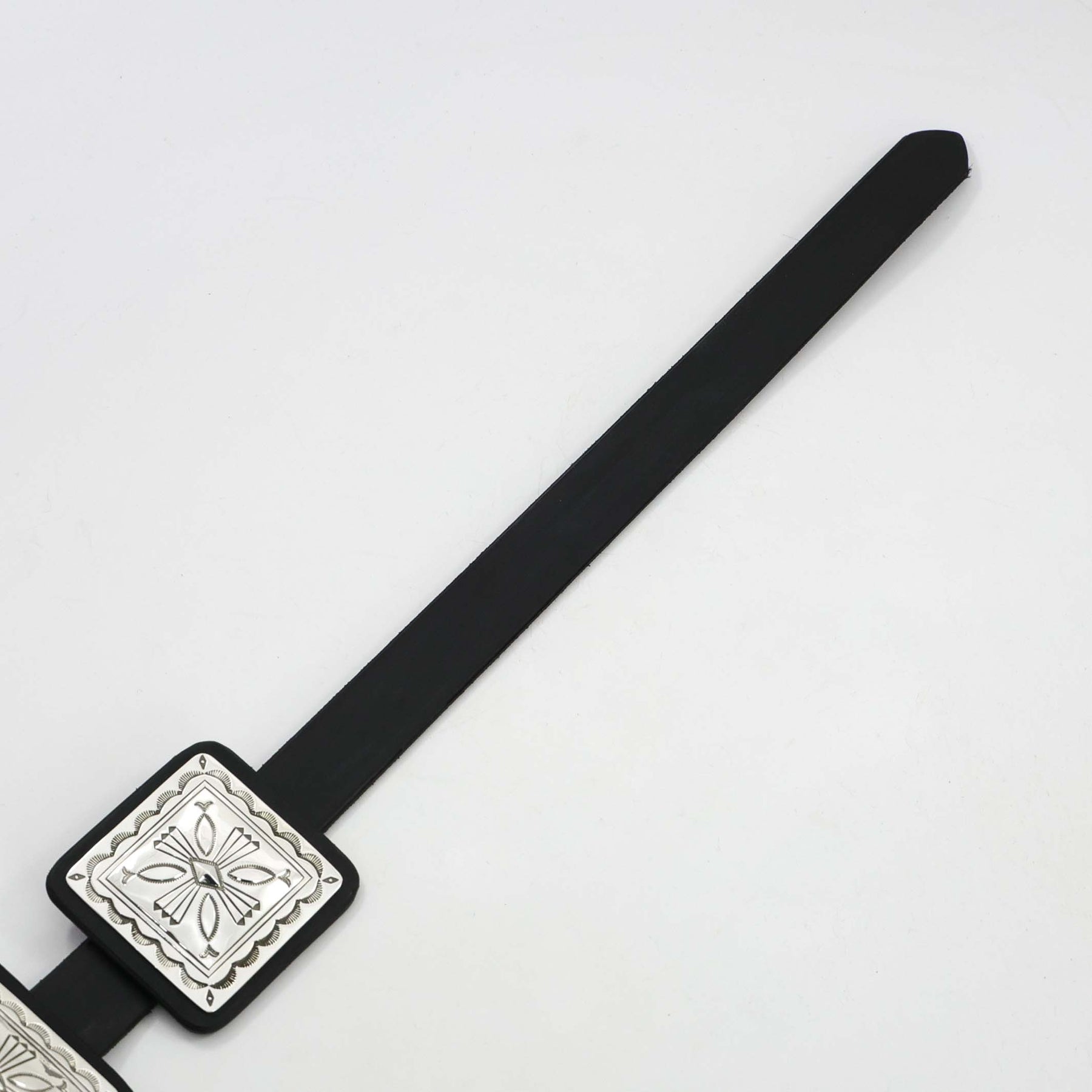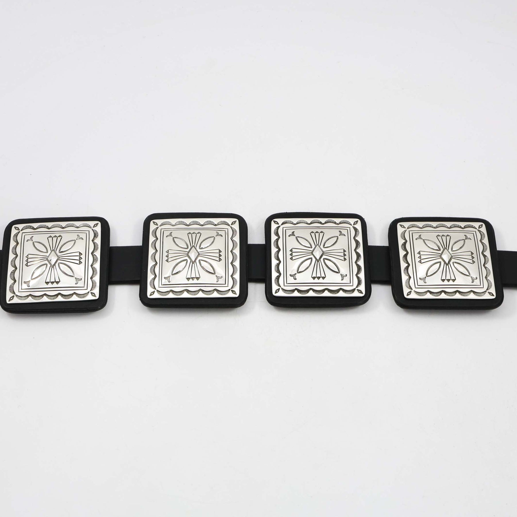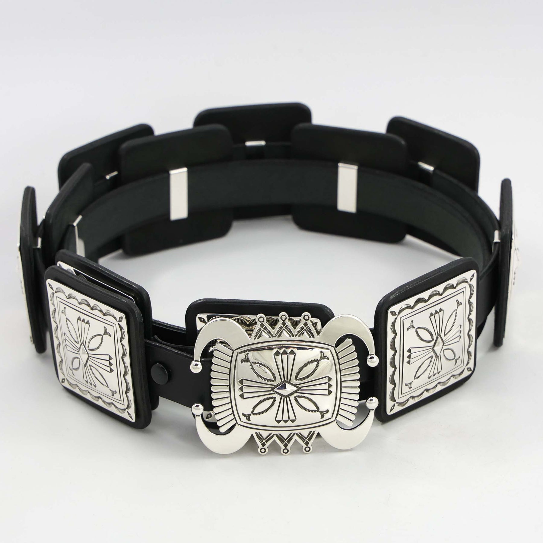 Sterling Silver Concho Belt with Twelve Square Conchos Featuring Precise Hand-Stamped and Repousse Designs on a 1" Black Leather Belt. The ketoh style buckle features hand-stamped, filed, and repousse designs. This beautiful concho belt is by award-winning Navajo silversmith, Jennifer Curtis.