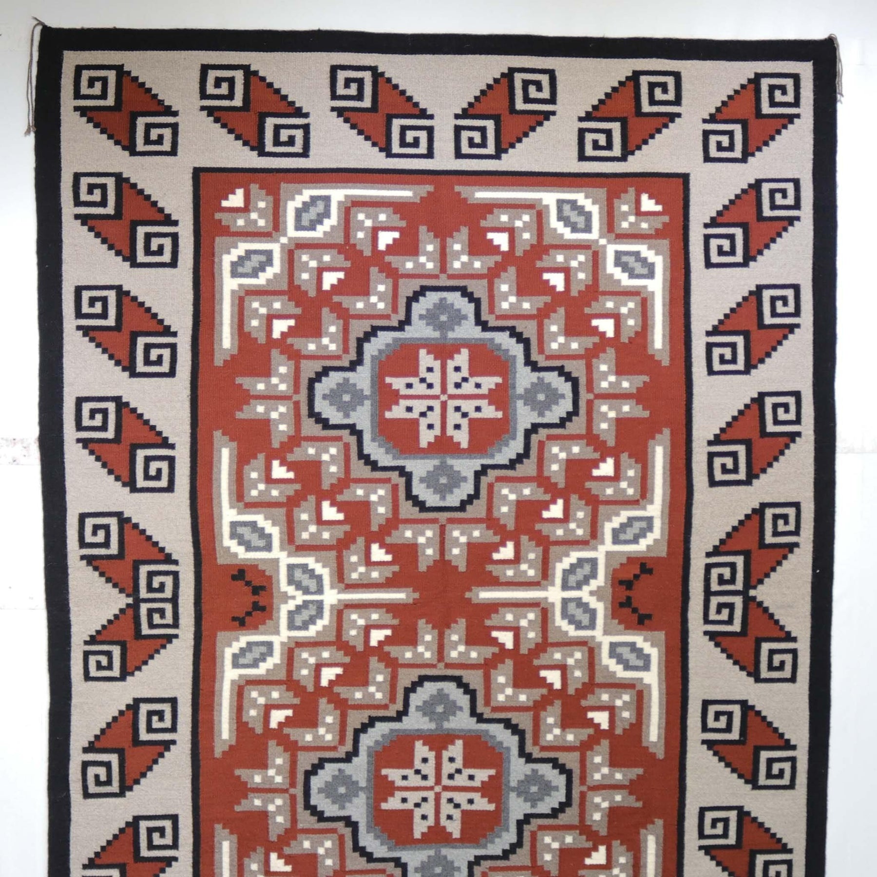 1980s Ganado Red Weaving with a Wide Border, Natural Wool Colors, and a Terra Cotta Red Background.