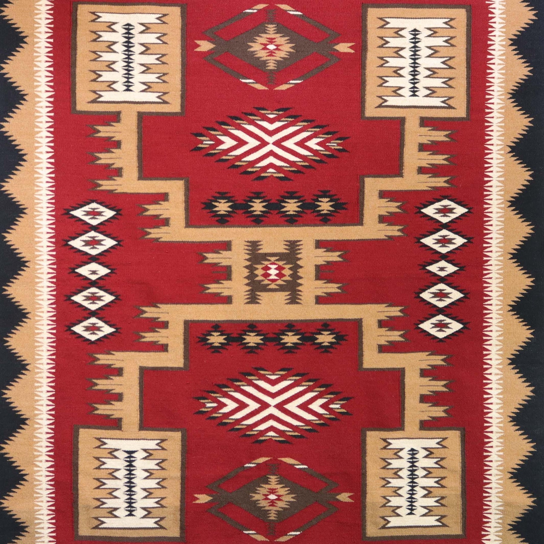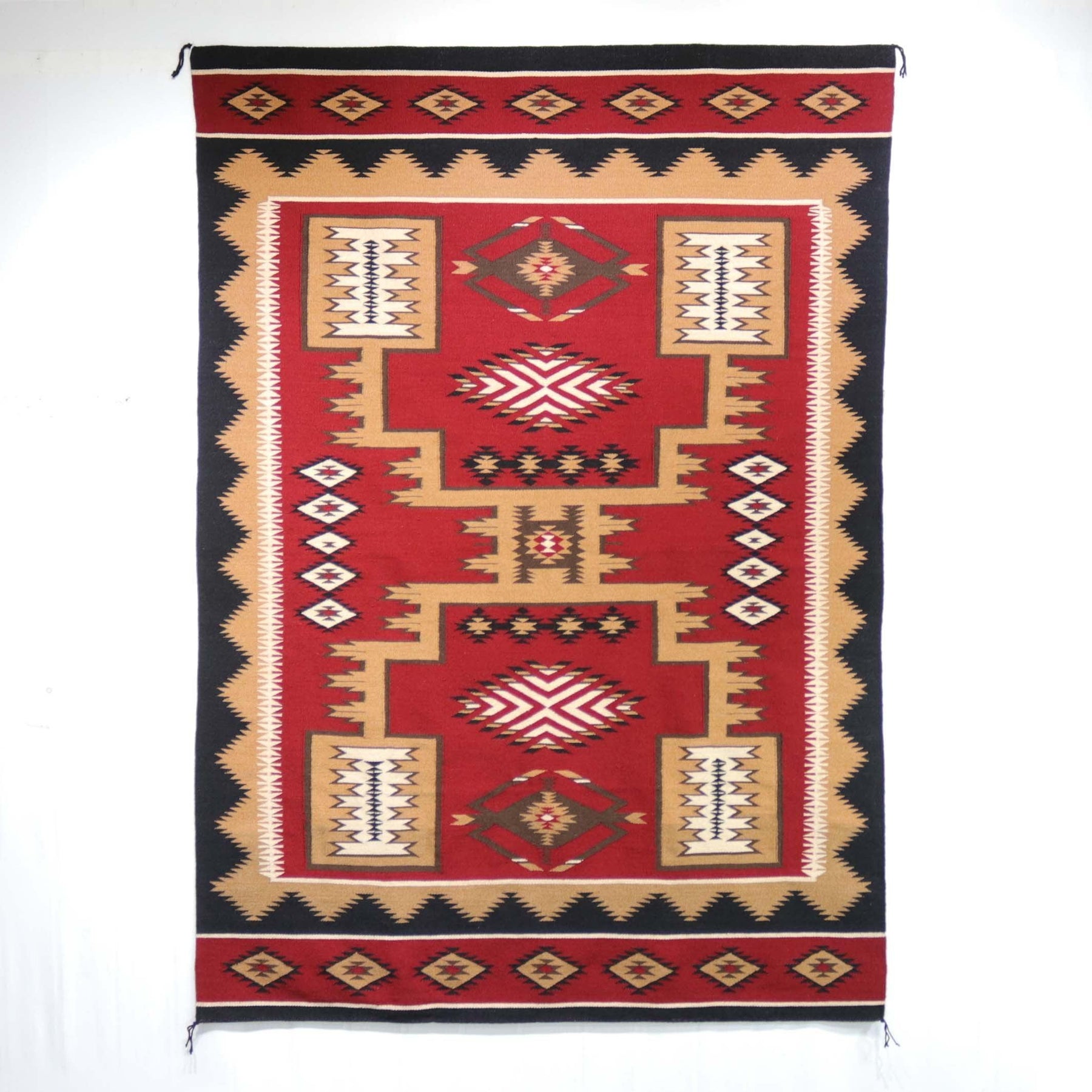 Hand Woven Storm Pattern Weaving with a Brown/Tan Storm Design on a Red Background with a Unique Border.