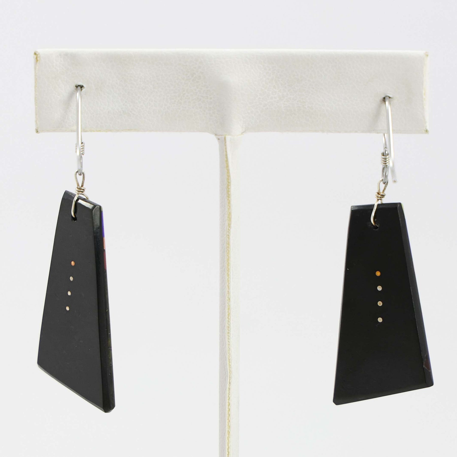 Sterling Silver French Hook Earrings with Inlaid Lapis, Jet, Pipestone, Serpentine, and Copper Backed on Jet.
