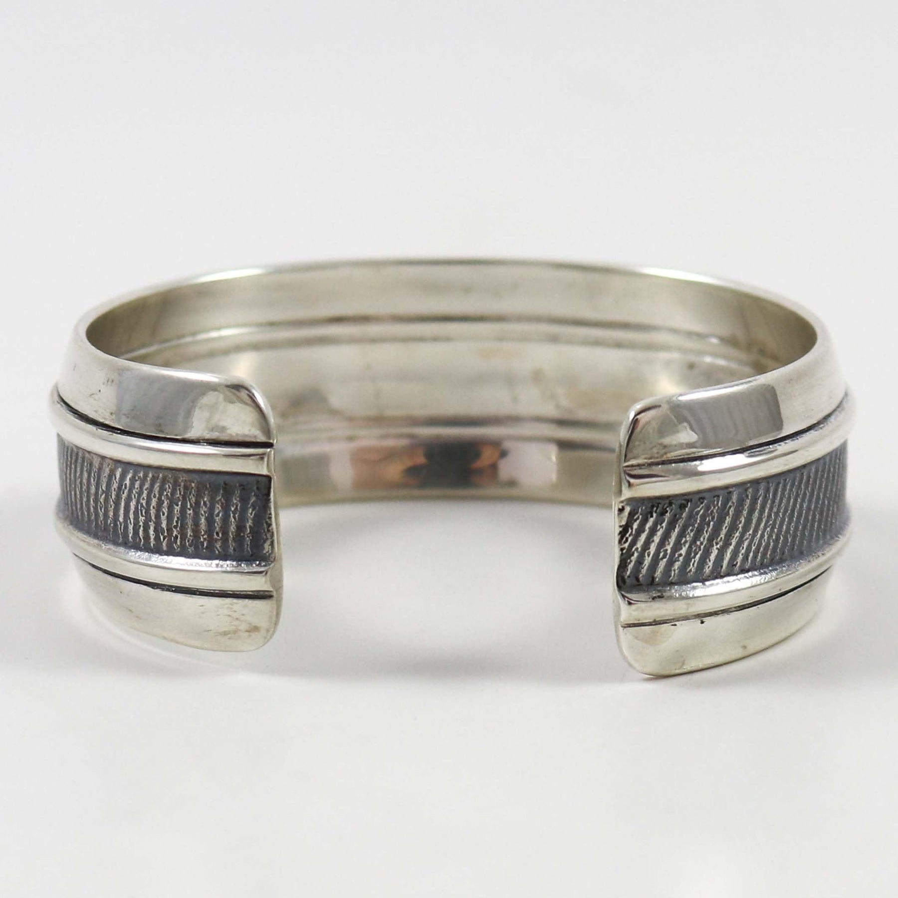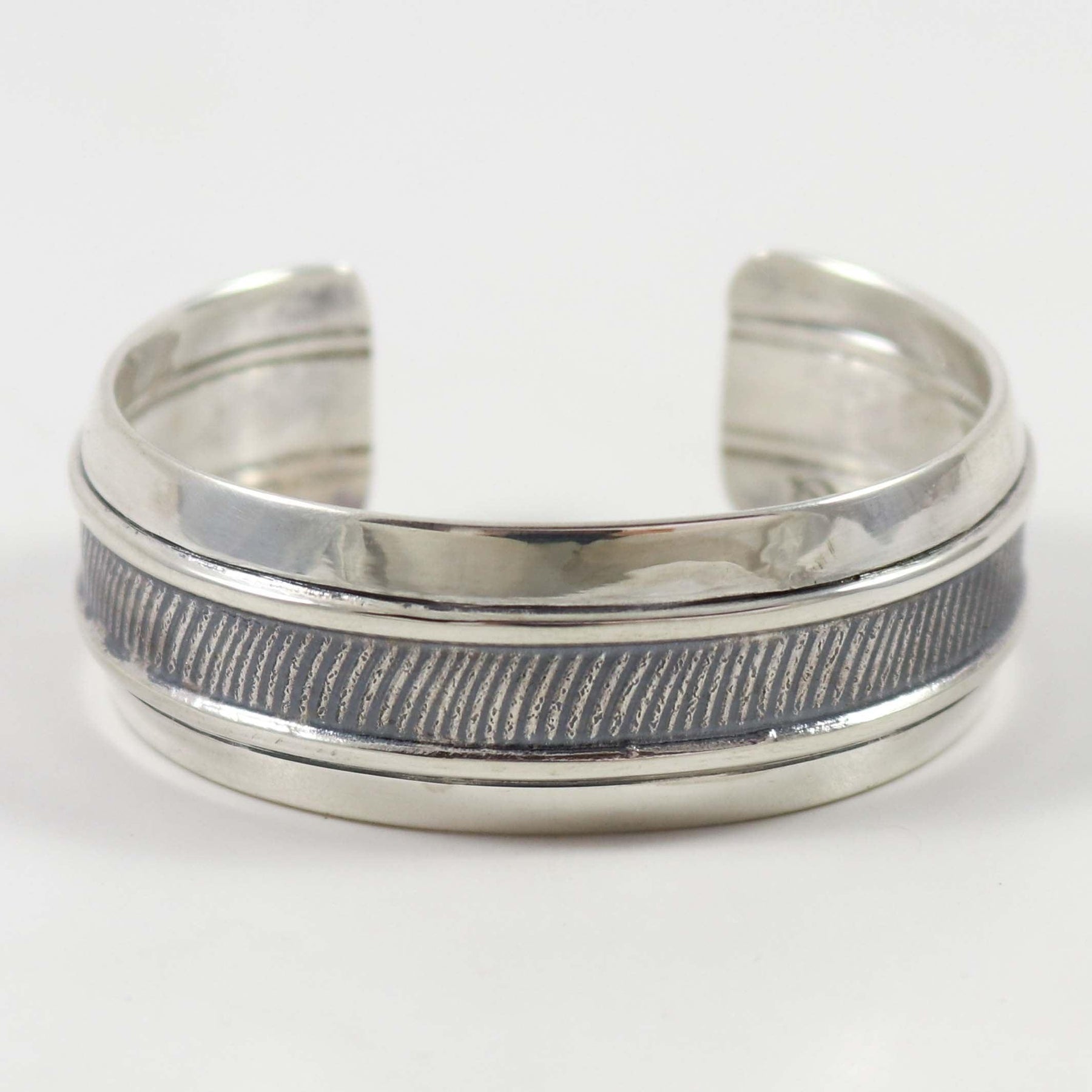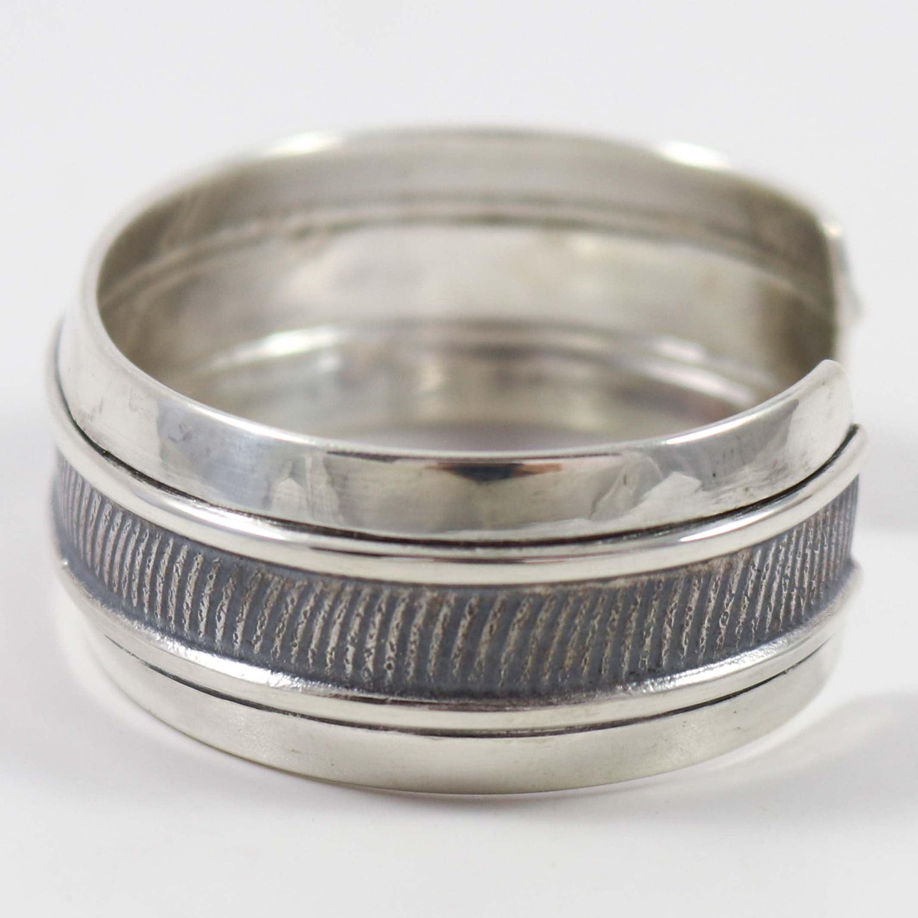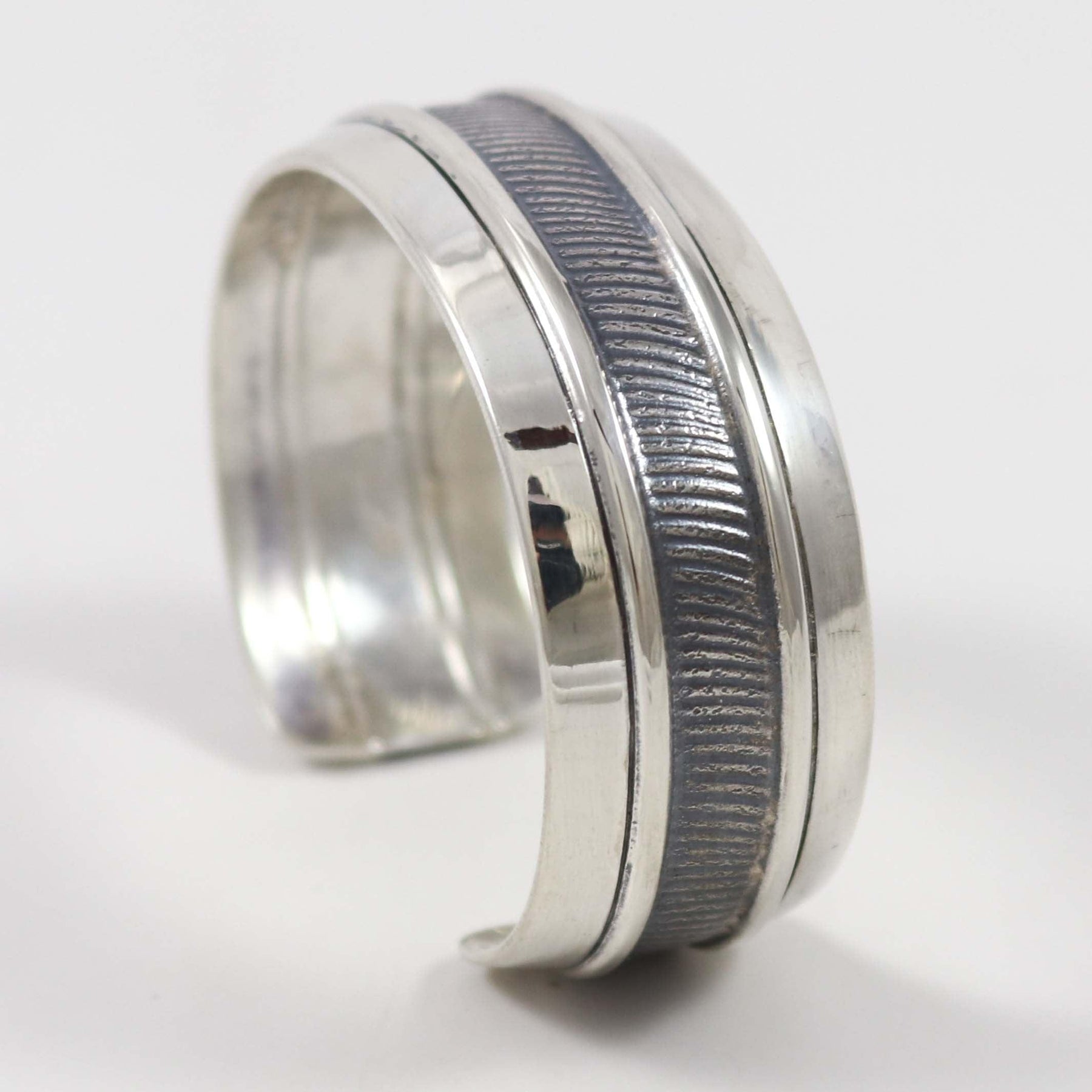 Sterling Silver Cuff Bracelet with a Rolled Texture Design in the Center.