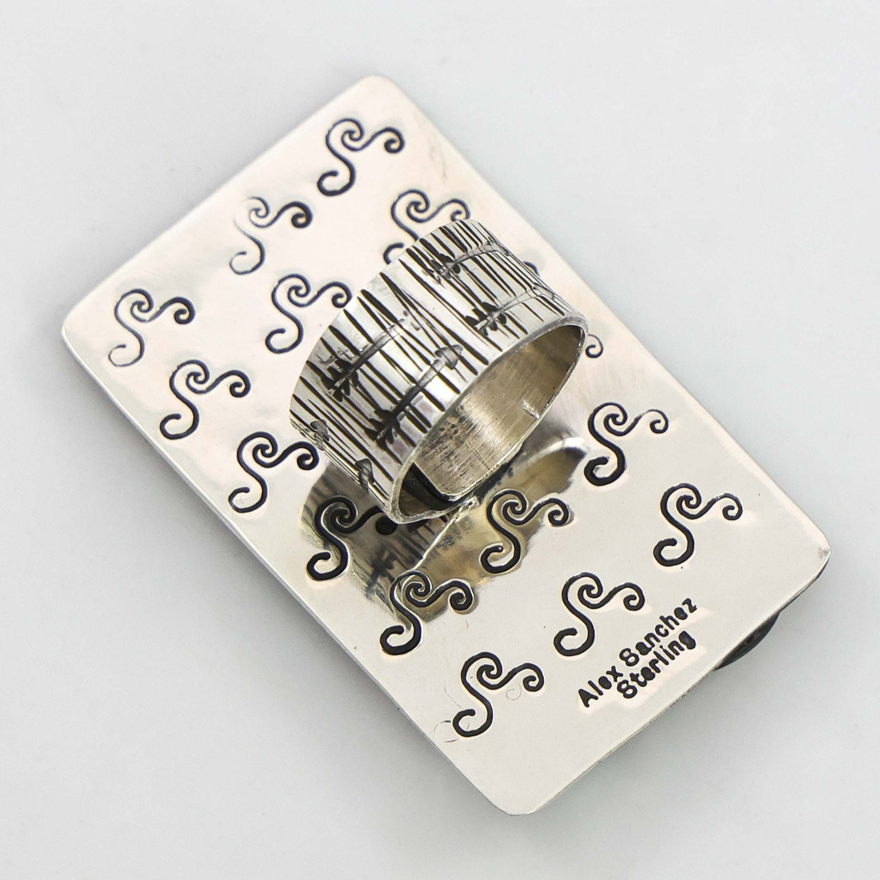 Sterling Silver Ring with Appliqué Petroglyph Symbols and set with Sonoran Gold Turquoise.