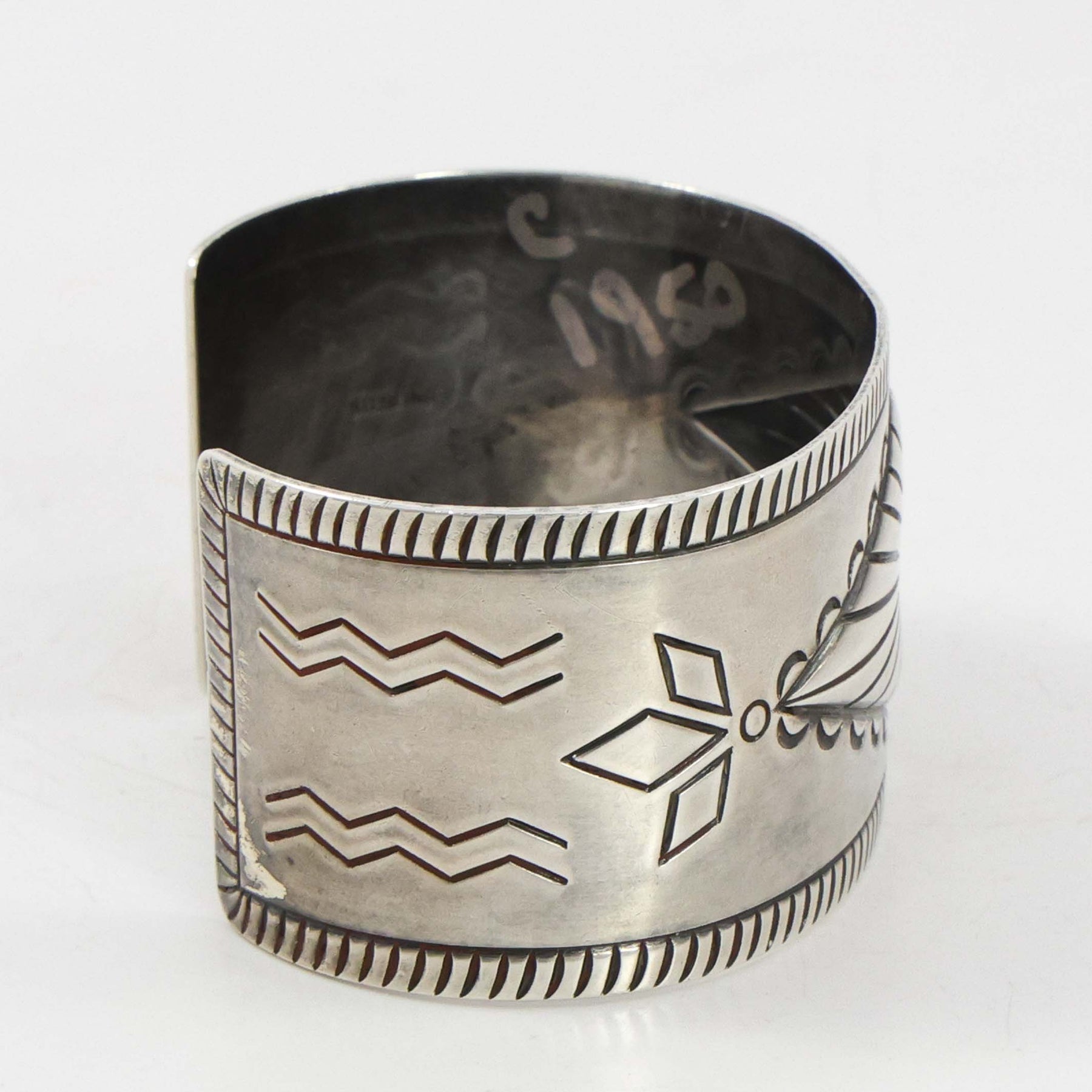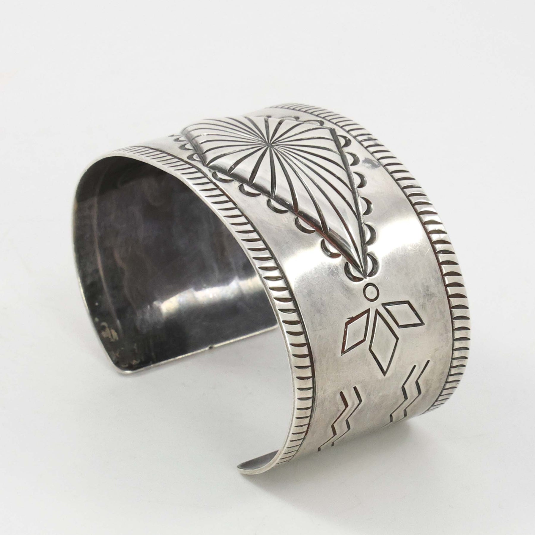 1950s Navajo cuff bracelet featuring a bold central diamond-shaped repoussé panel with radiating sunray stampwork, framed by crescent and linear stamping along the edges. Additional motifs of geometric arrows and zig-zag lightning designs accent the sides, bordered with fine linear stampwork for balance. Lighter in weight and finely crafted, this bracelet reflects classic mid-century Navajo silversmithing.