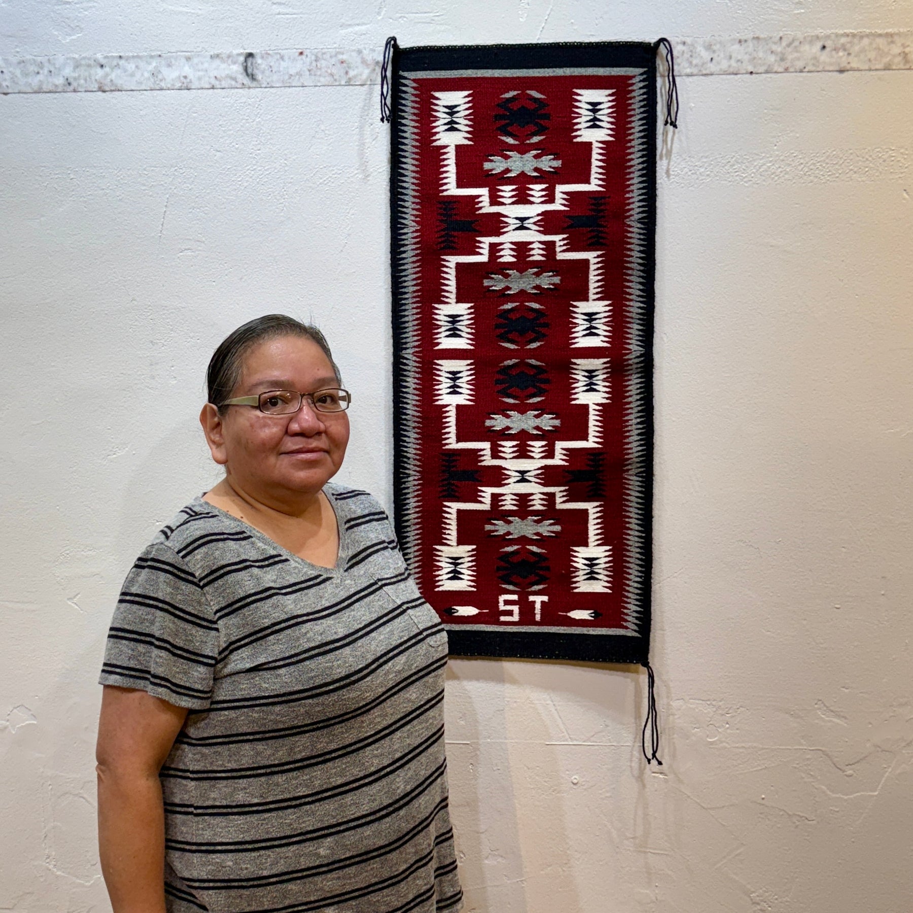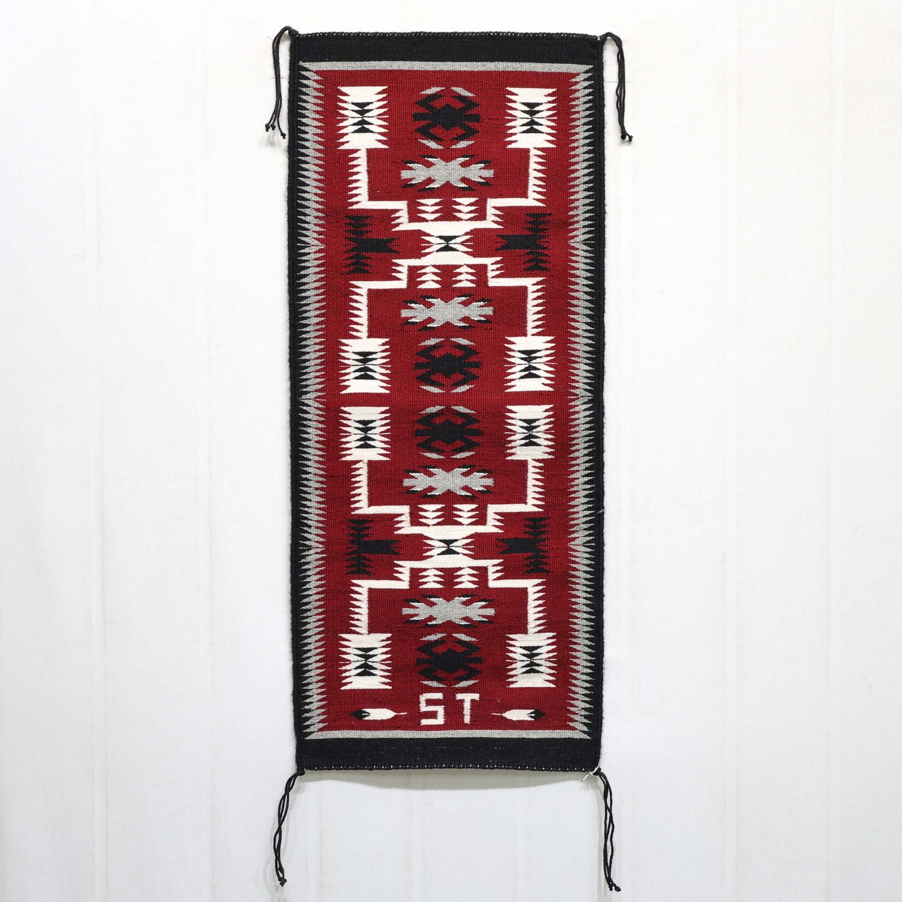 Double Storm Pattern Runner Weaving with Two White Storm Pattern Designs on a Bold Red Background.
