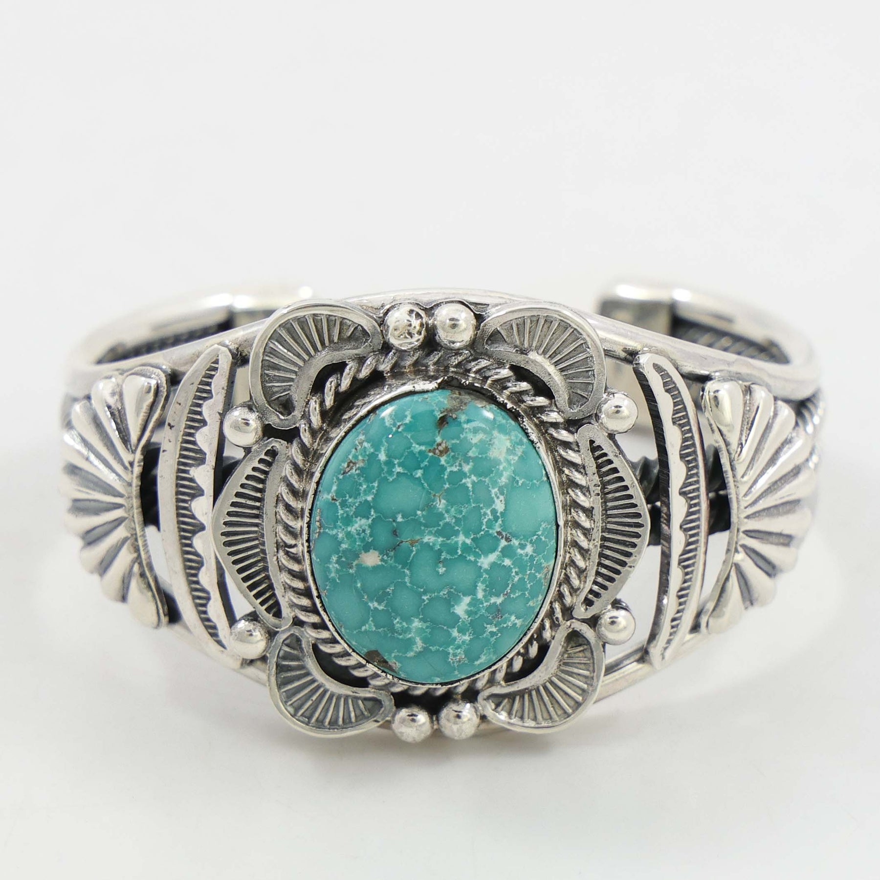Sterling Silver Cuff Bracelet with Applique and Hand-Stamped Designs and set with Natural Fox Turquoise from Nevada.1.5” Cuff Width