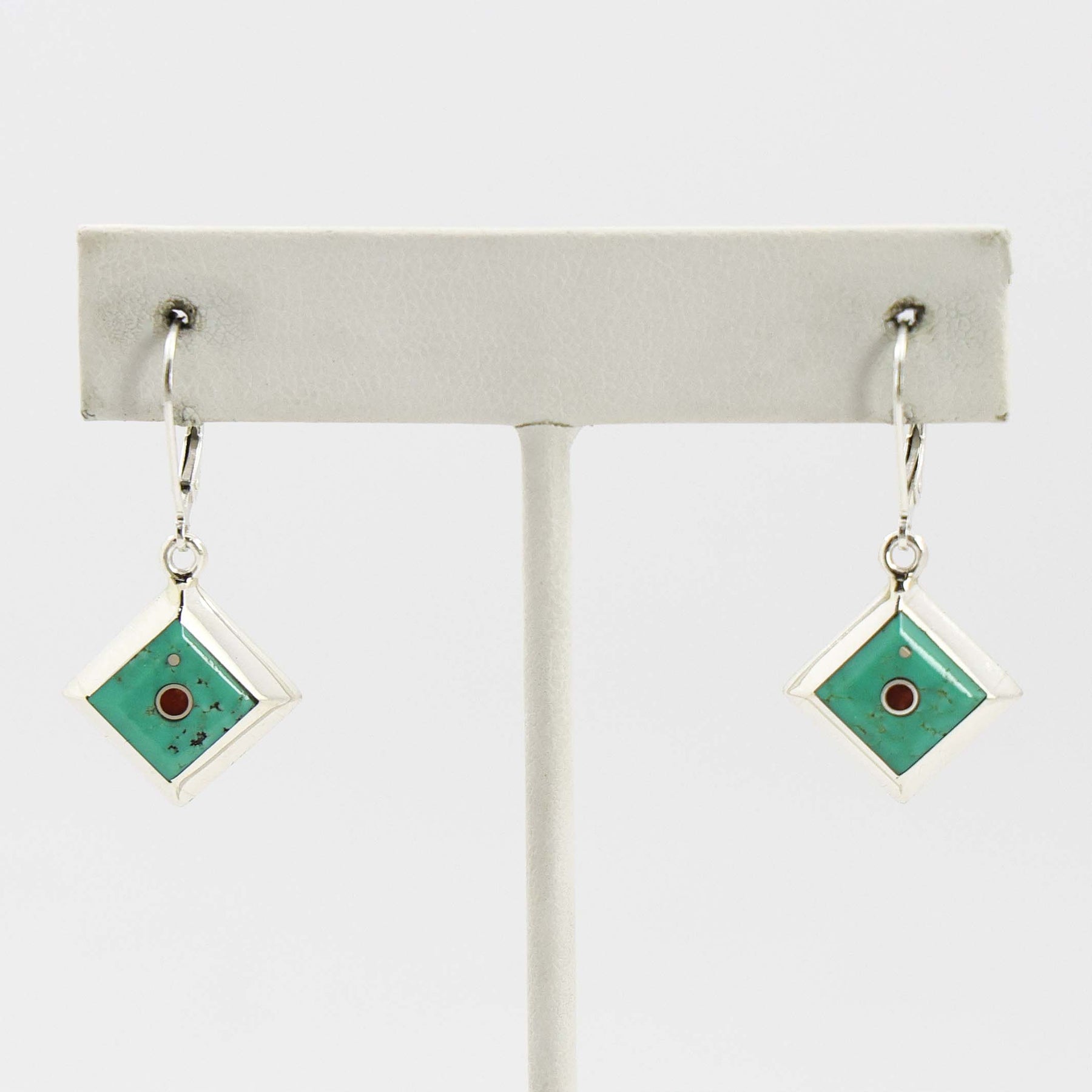 Sterling Silver Lever Back Dangle Earrings with Inlaid Turquoise and Coral.
