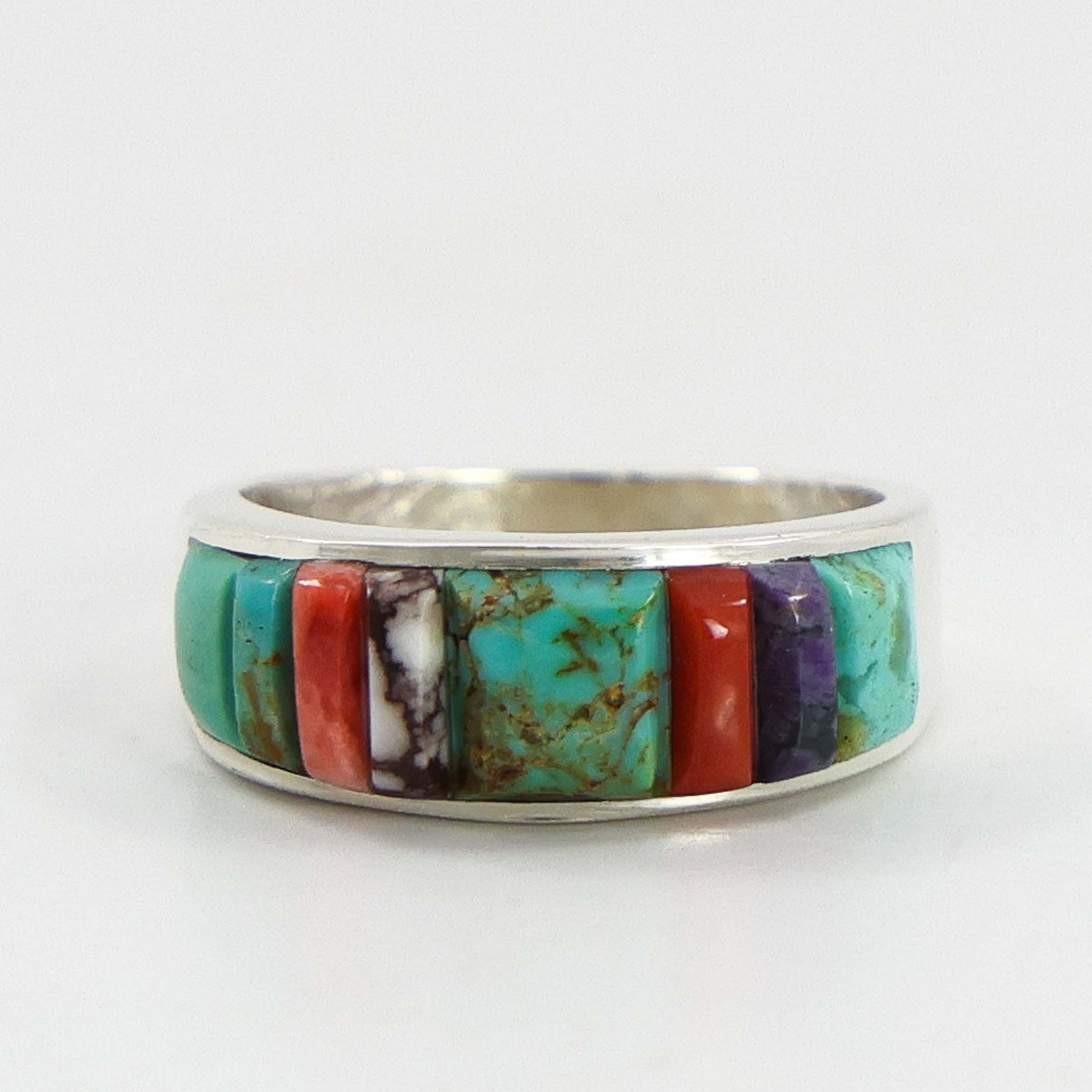 Sterling Silver Ring with Cobble Inlaid Turquoise, Sugilite, Coral, White Buffalo, and Spiny Oyster Shell.