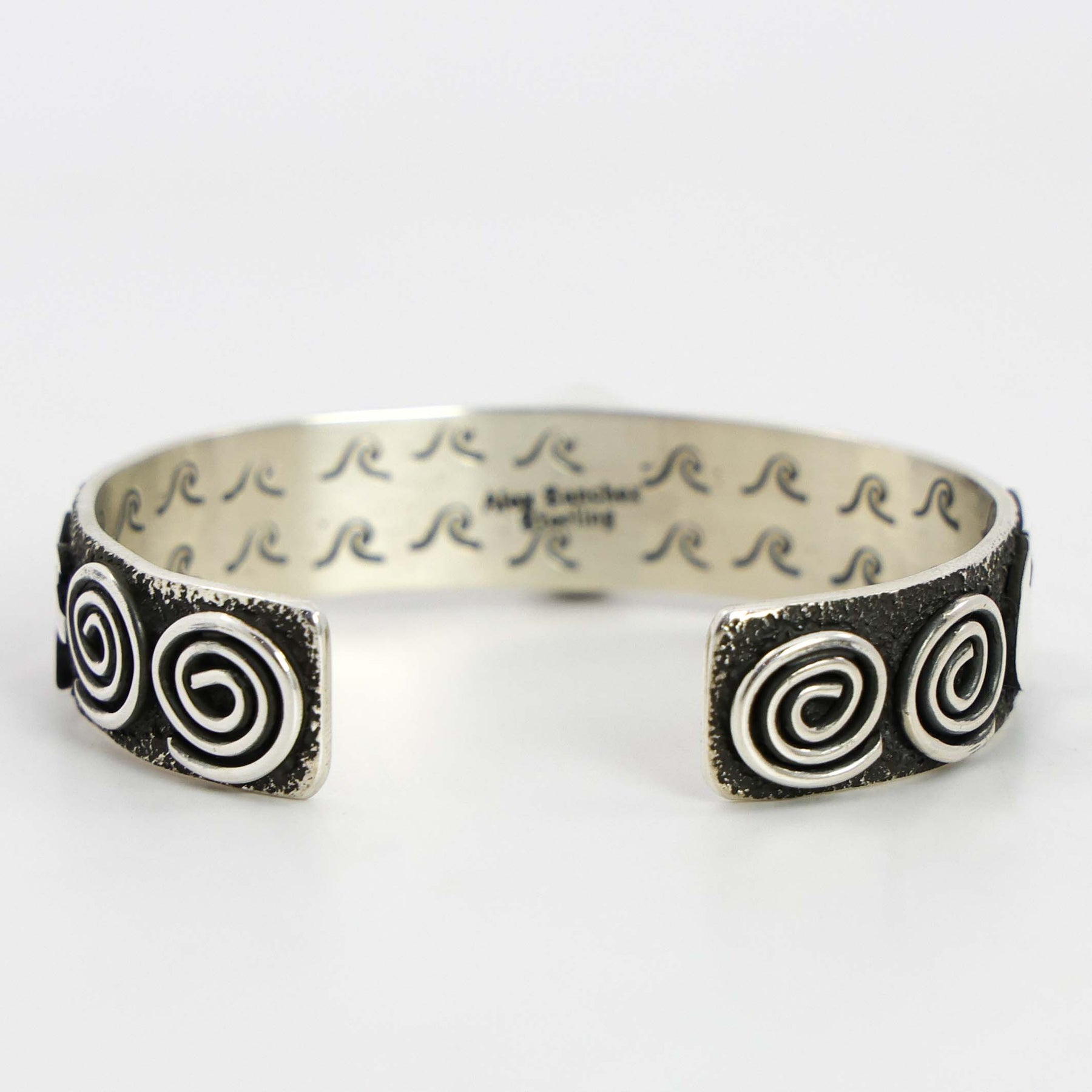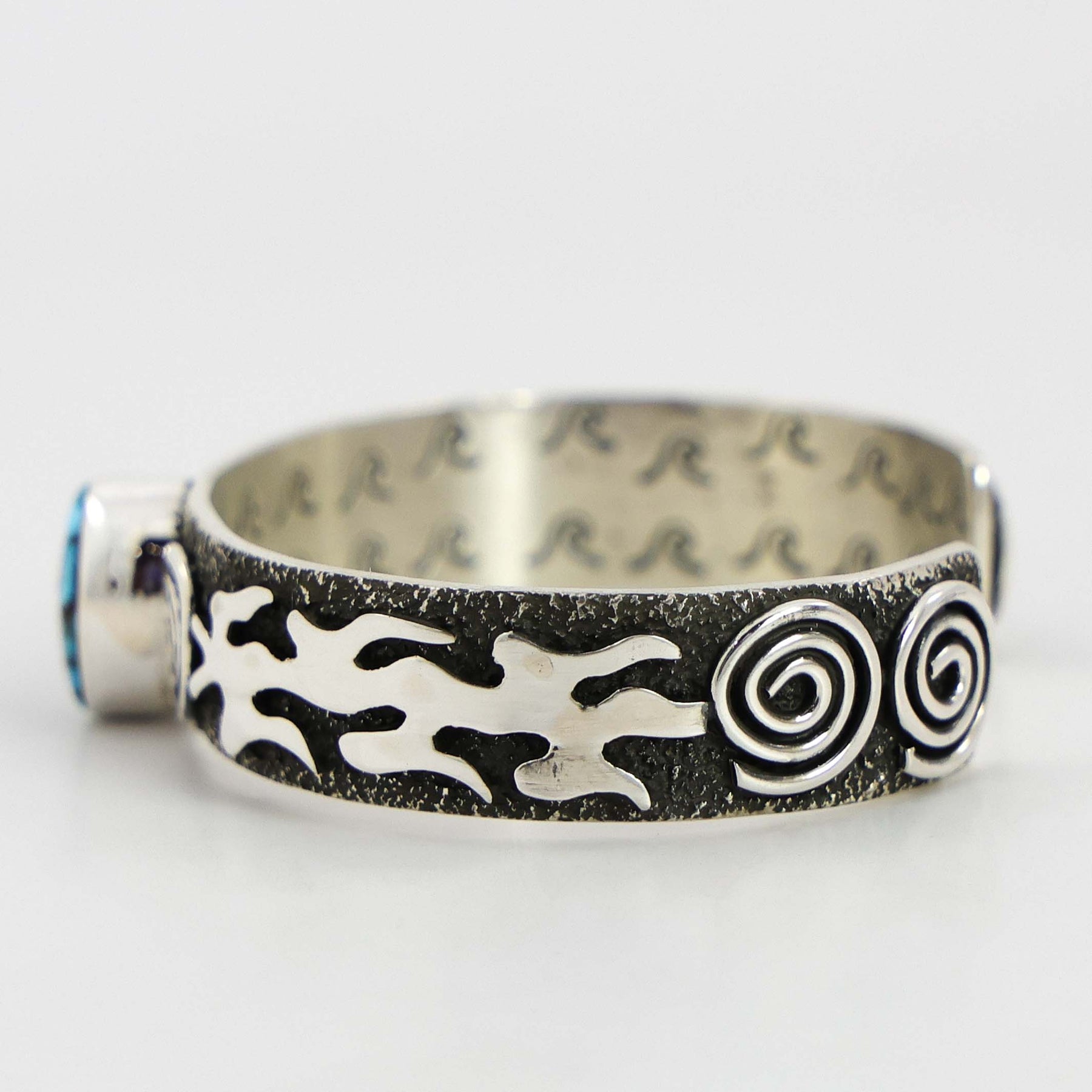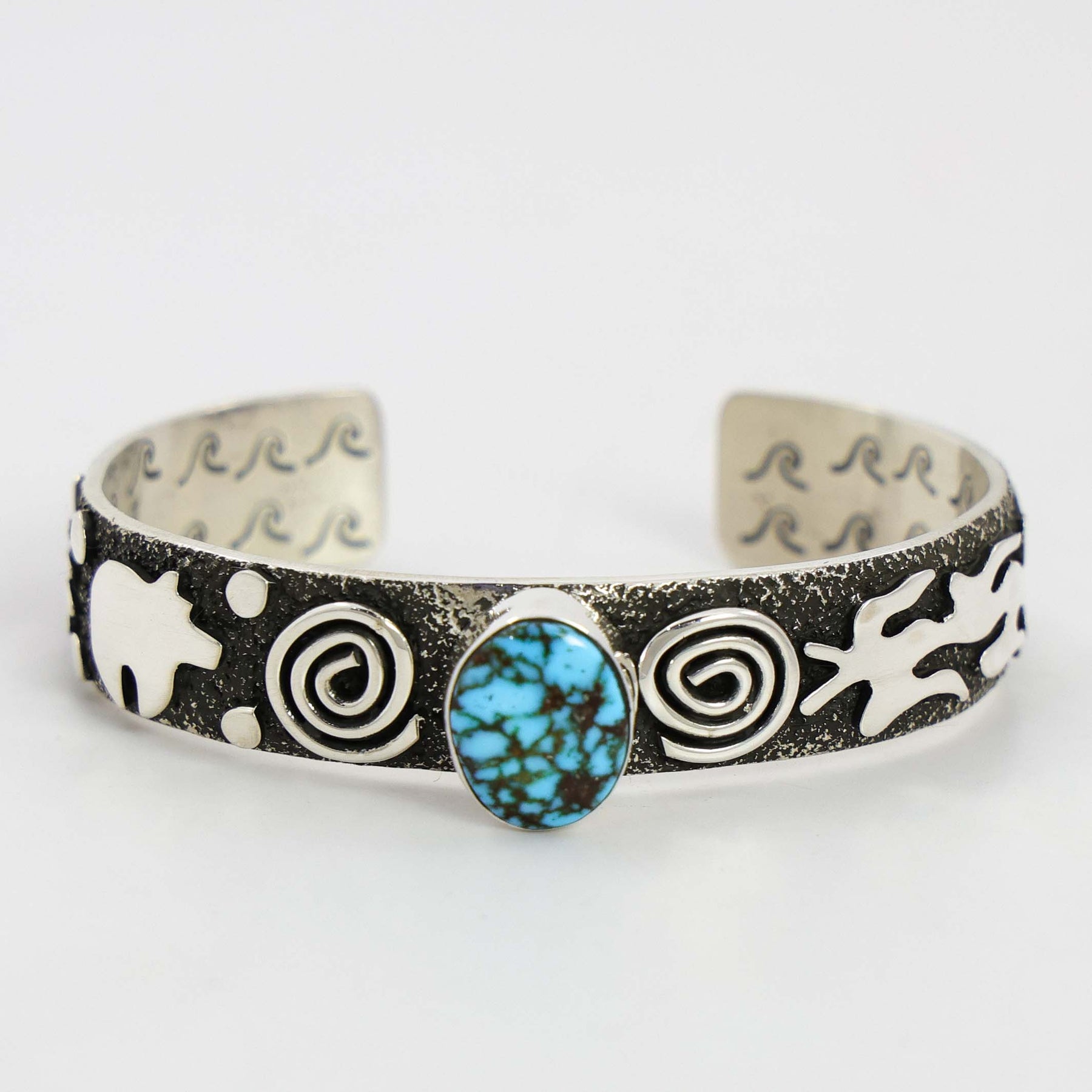 Sterling Silver Cuff Bracelet with Appliqué Petroglyph Designs and set with Natural Kingman Turquoise from Arizona. This cuff also has hand-stamped designs on the interior.