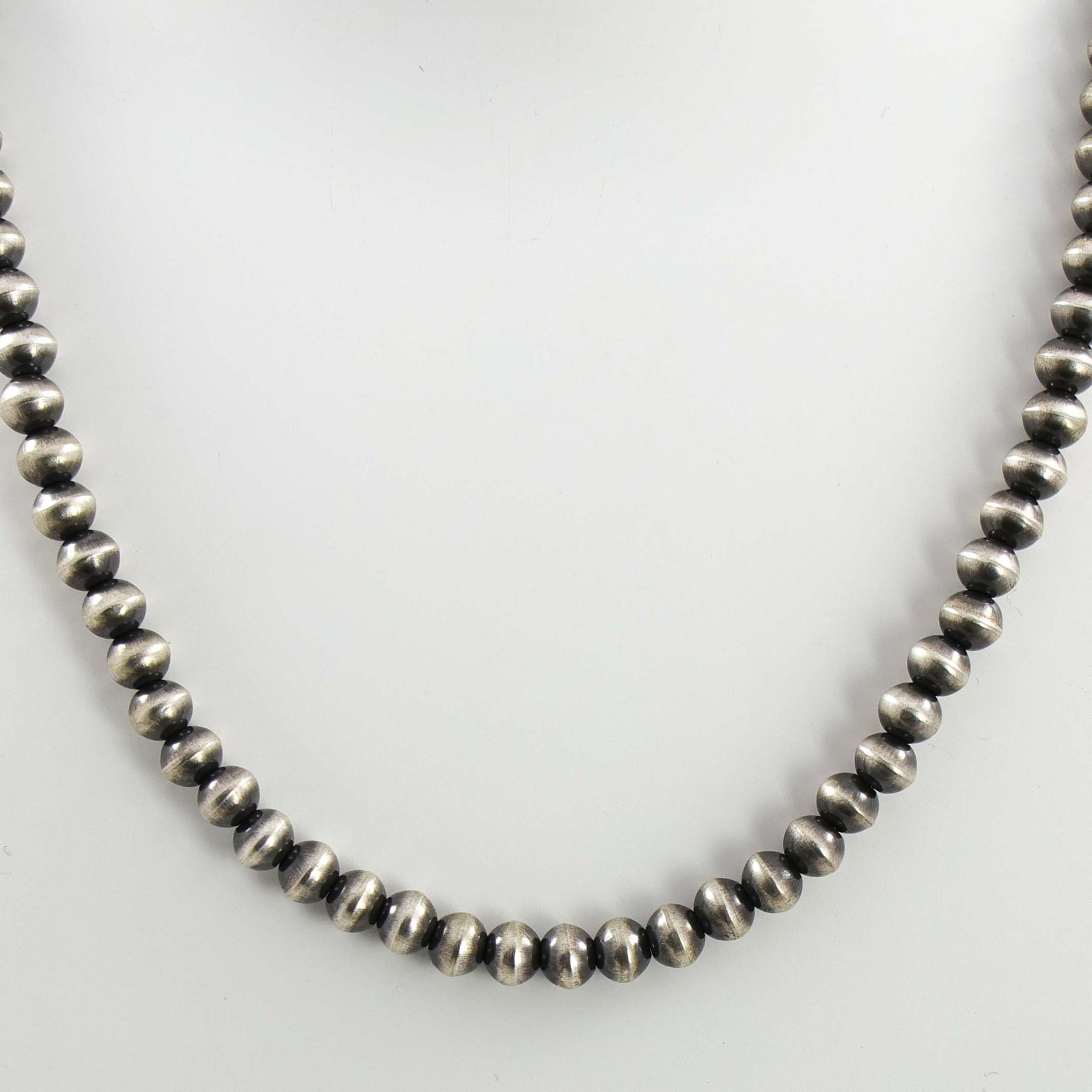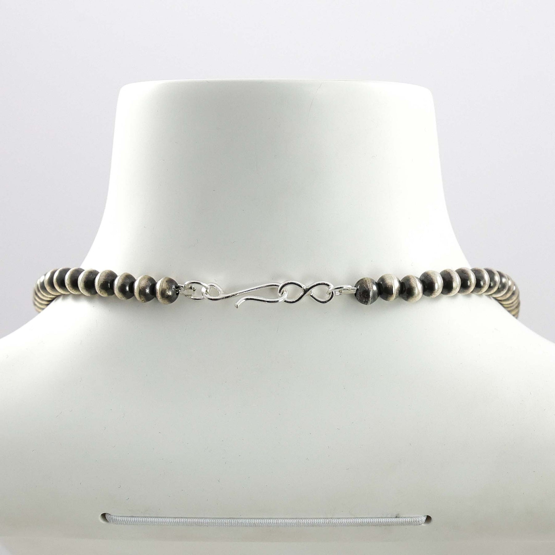Single Strand Sterling Silver Navajo Pearl Necklace with Handmade Beads in an Oxidized Finish.