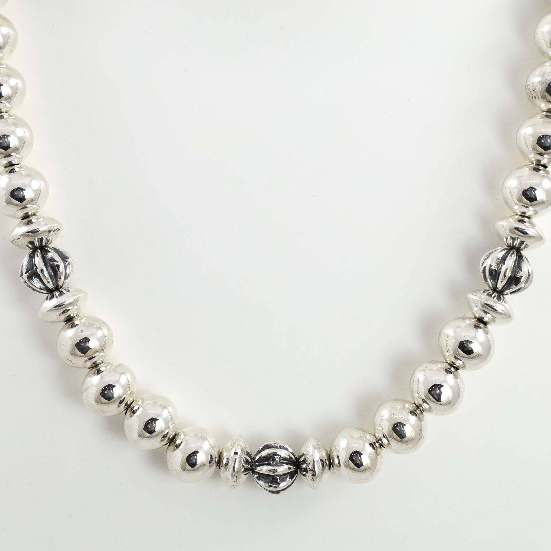 Sterling Silver Navajo Pearl Necklace with Alternating Handmade Fluted and Smooth Beads in a High Polish Finish.