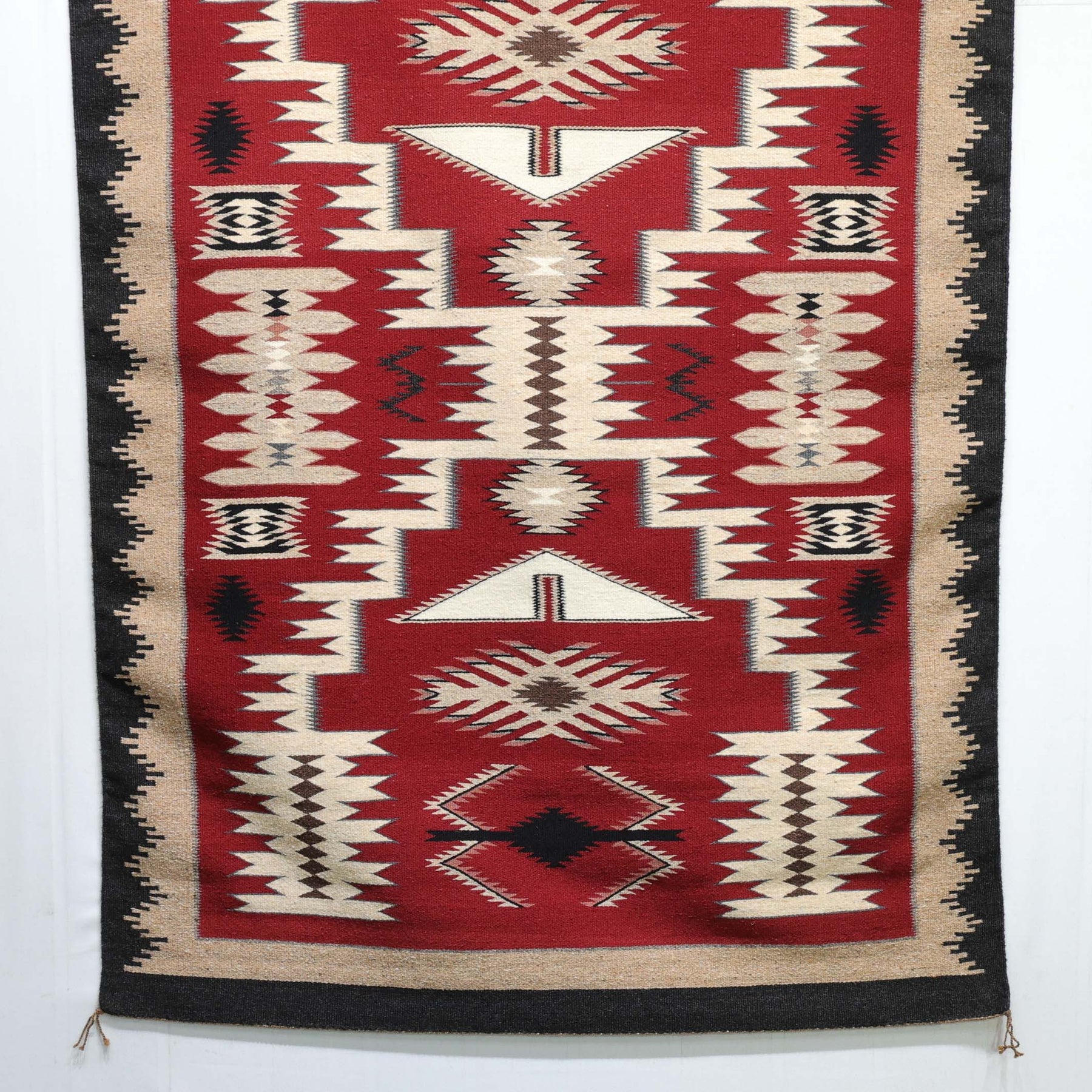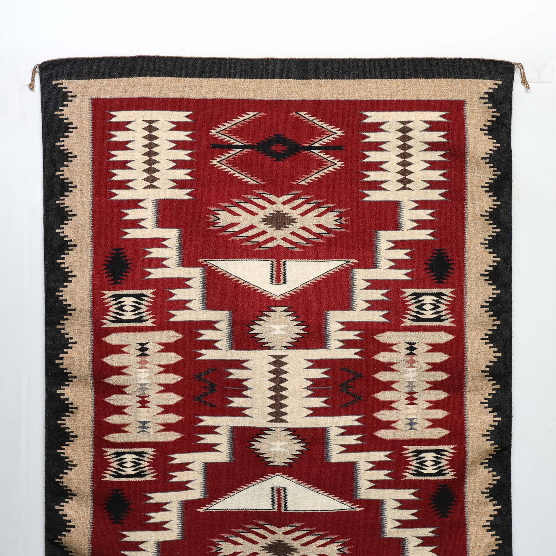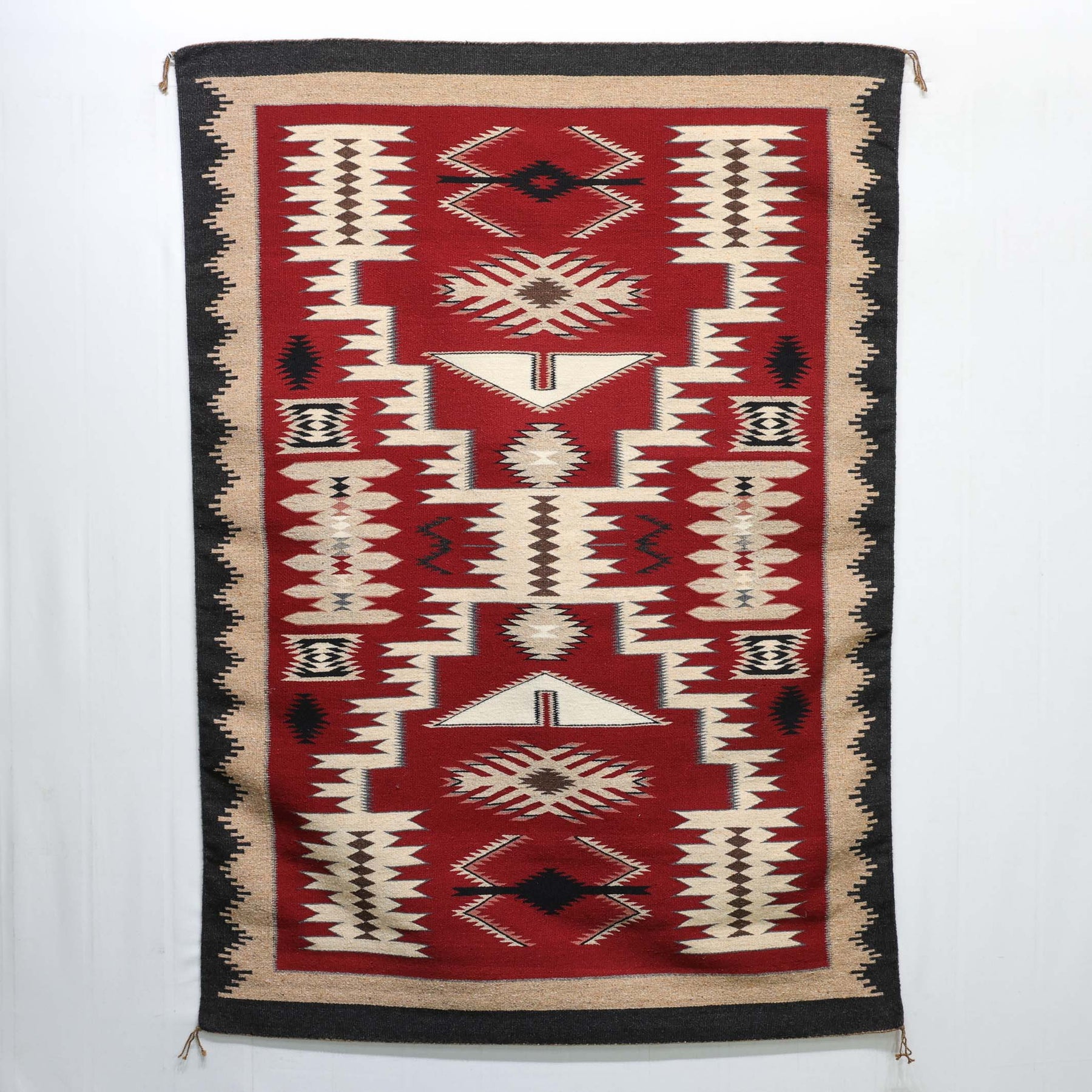 Handwoven Navajo Weaving featuring a Storm Pattern Design on a Red Background with a Serrated Border.