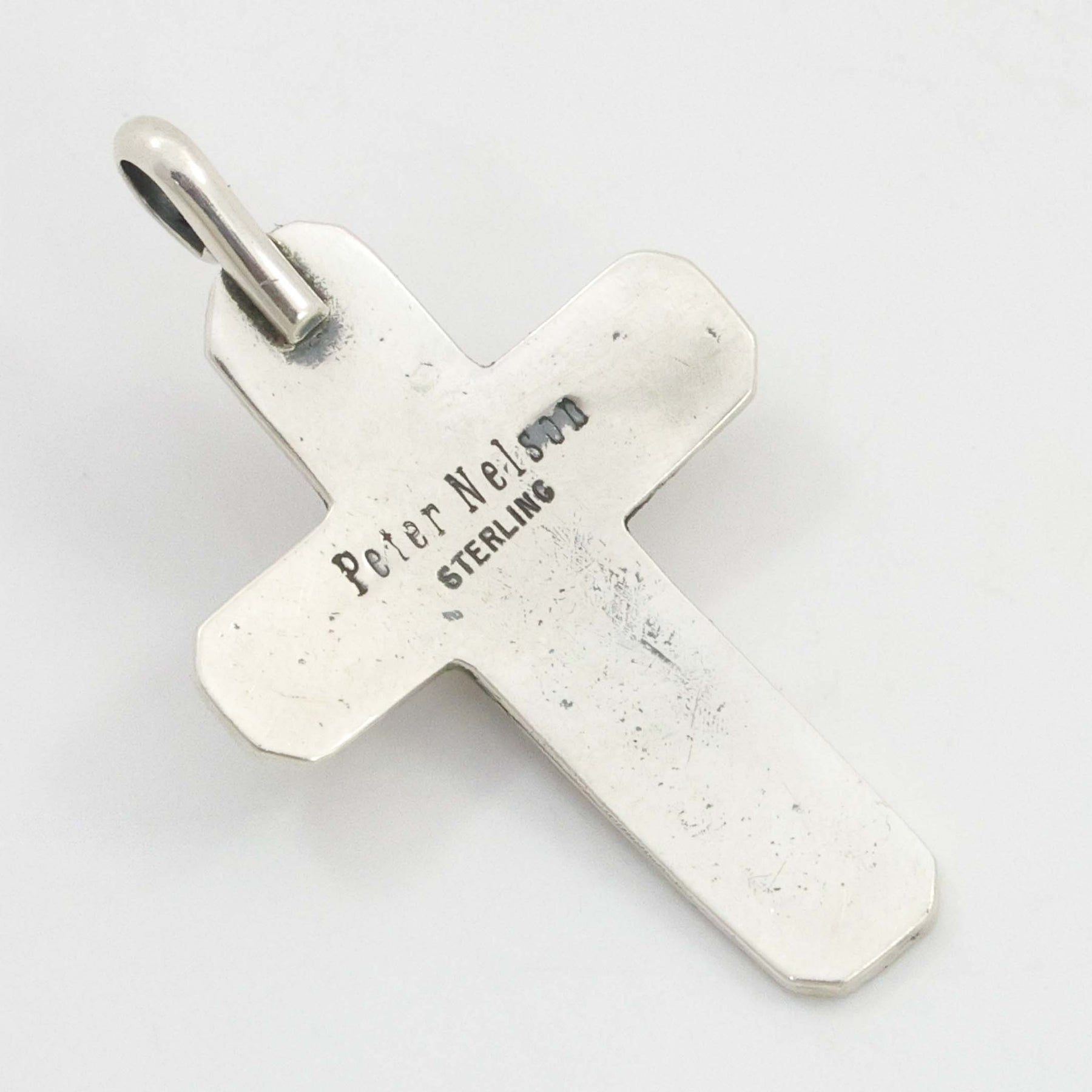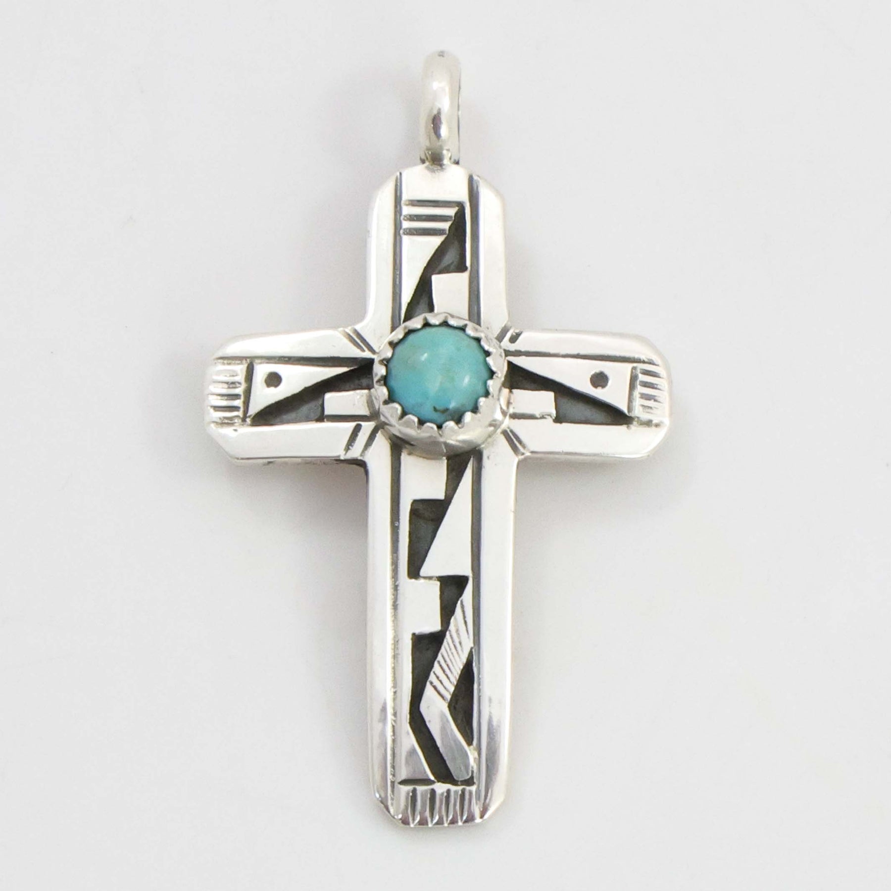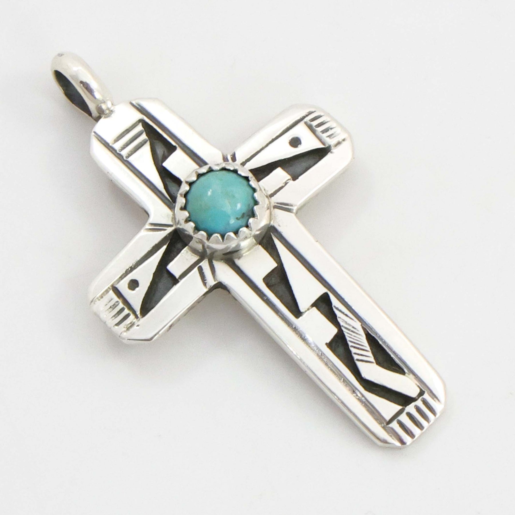 Sterling Silver Cross Pendant with Navajo Overlaid Designs and set with Natural Kingman Turquoise from Arizona.
