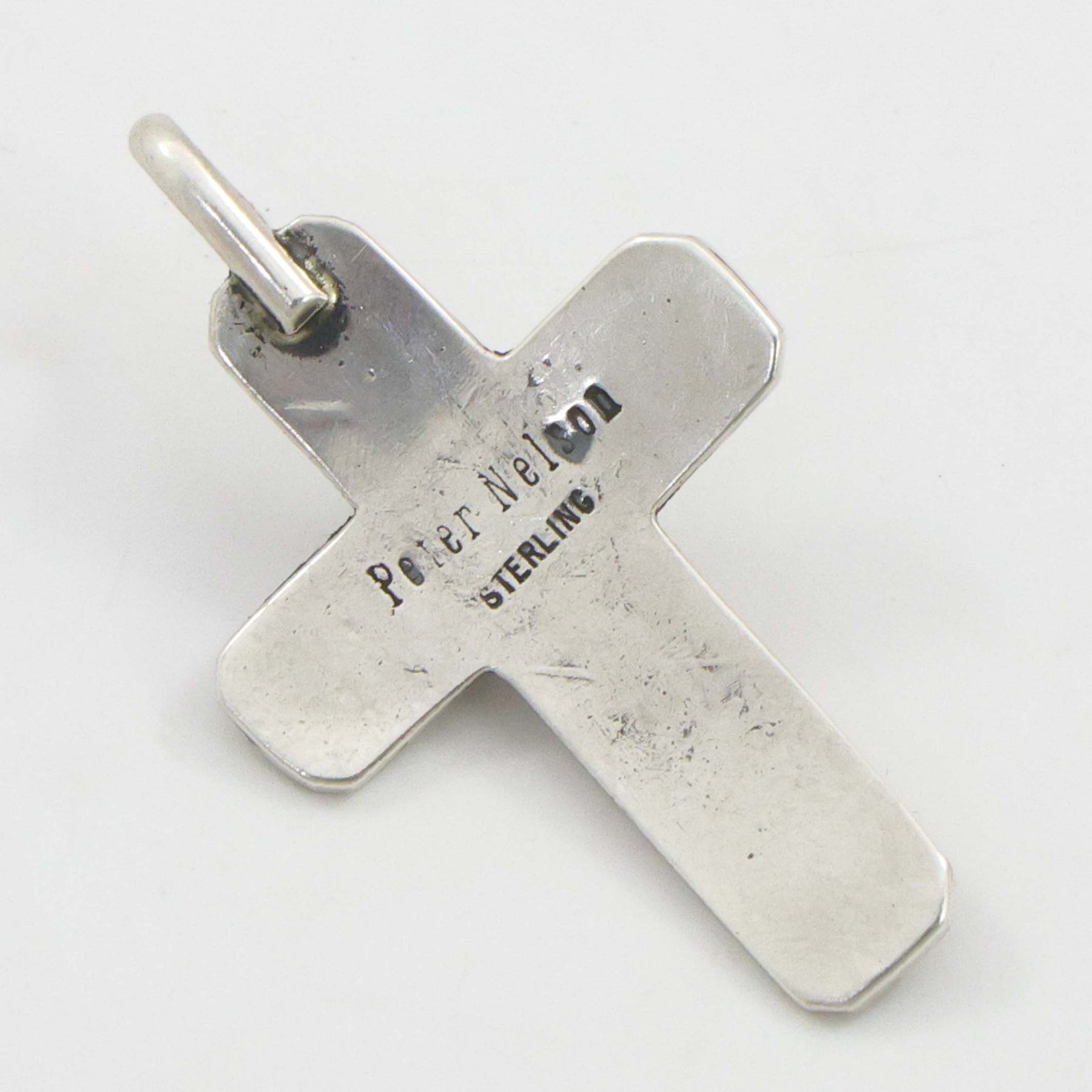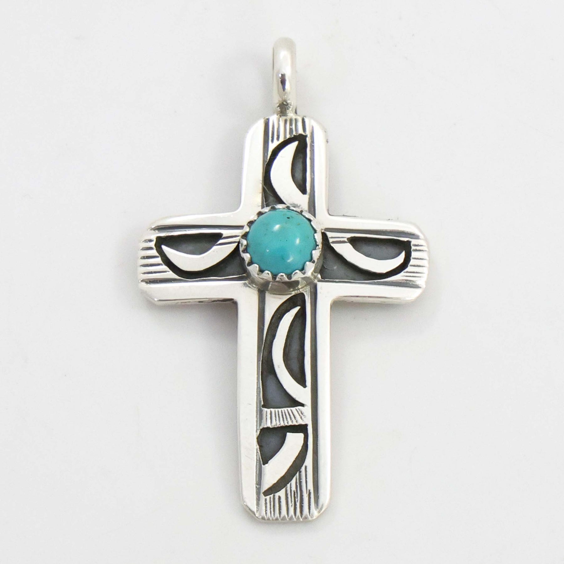 Sterling Silver Cross Pendant with Navajo Overlaid Designs and set with Natural Kingman Turquoise from Arizona.