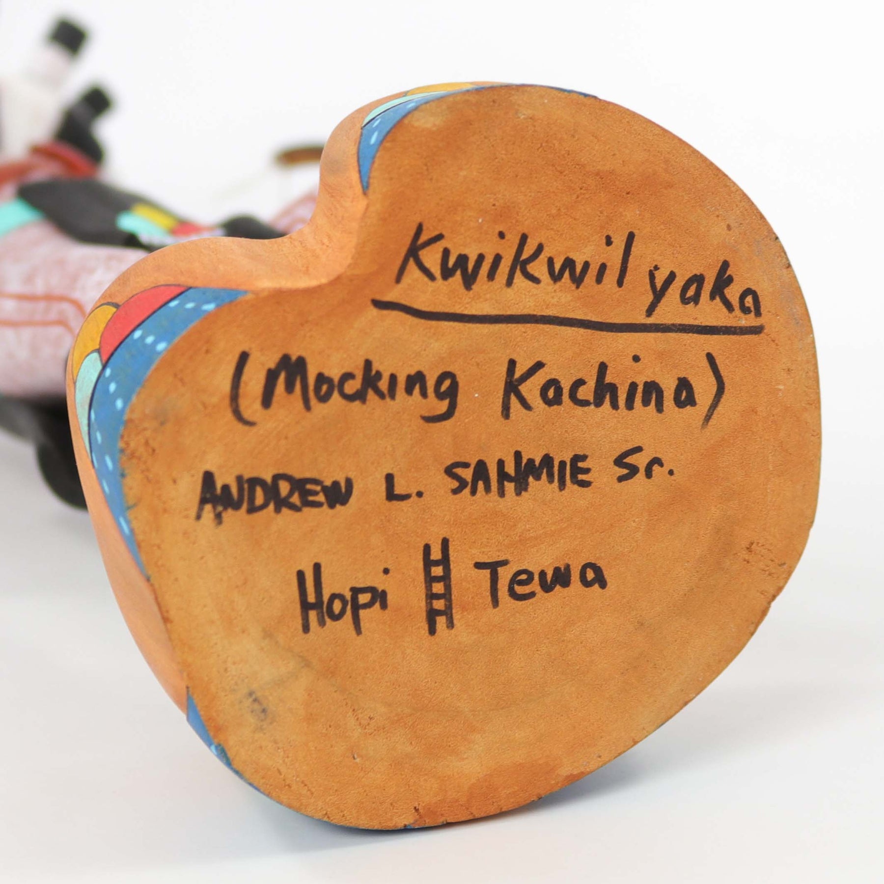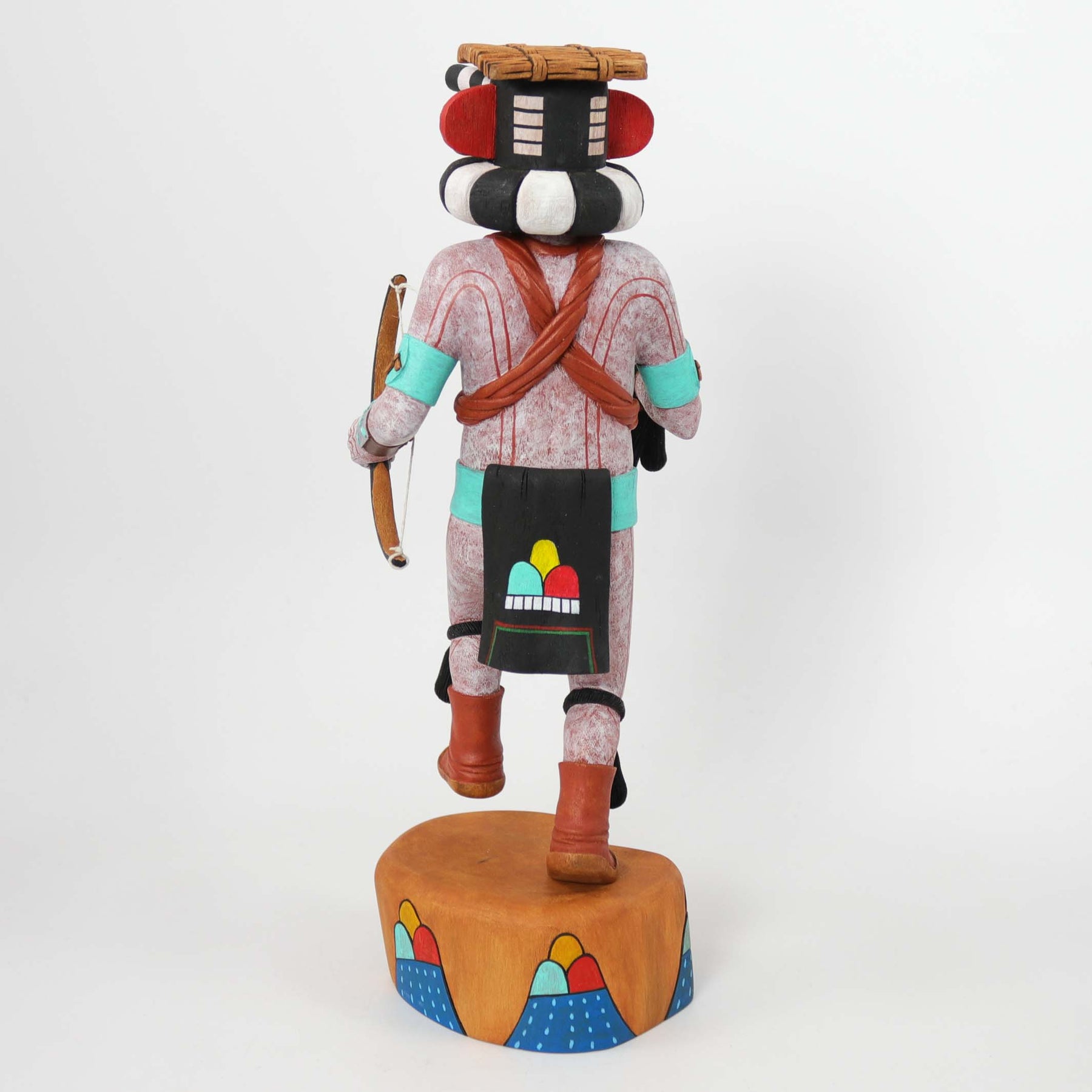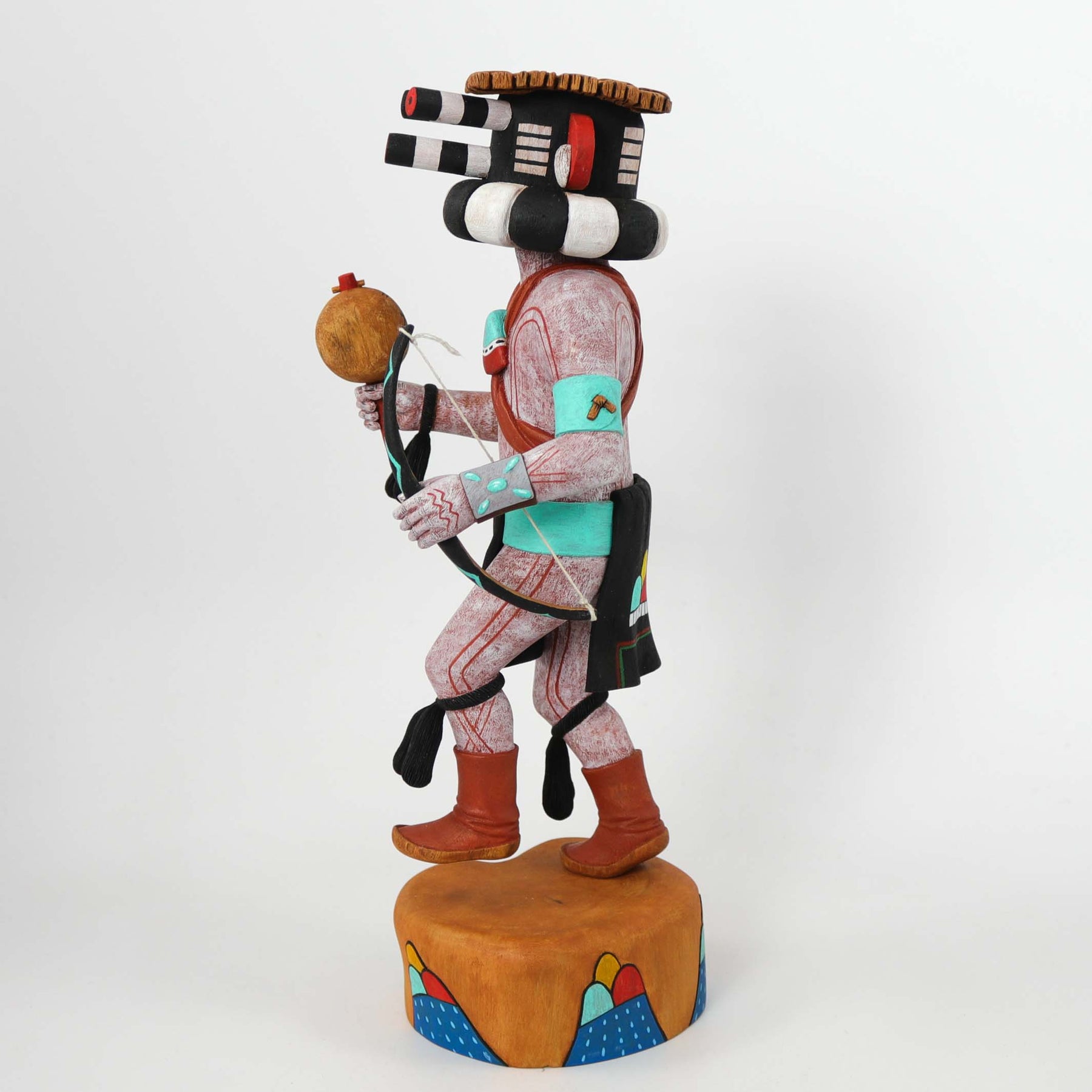Hand-Carved and Painted Hopi Mocking (Kwikwilyaka) Kachina Holding a Rattle and Bow in a Dancing Motion.