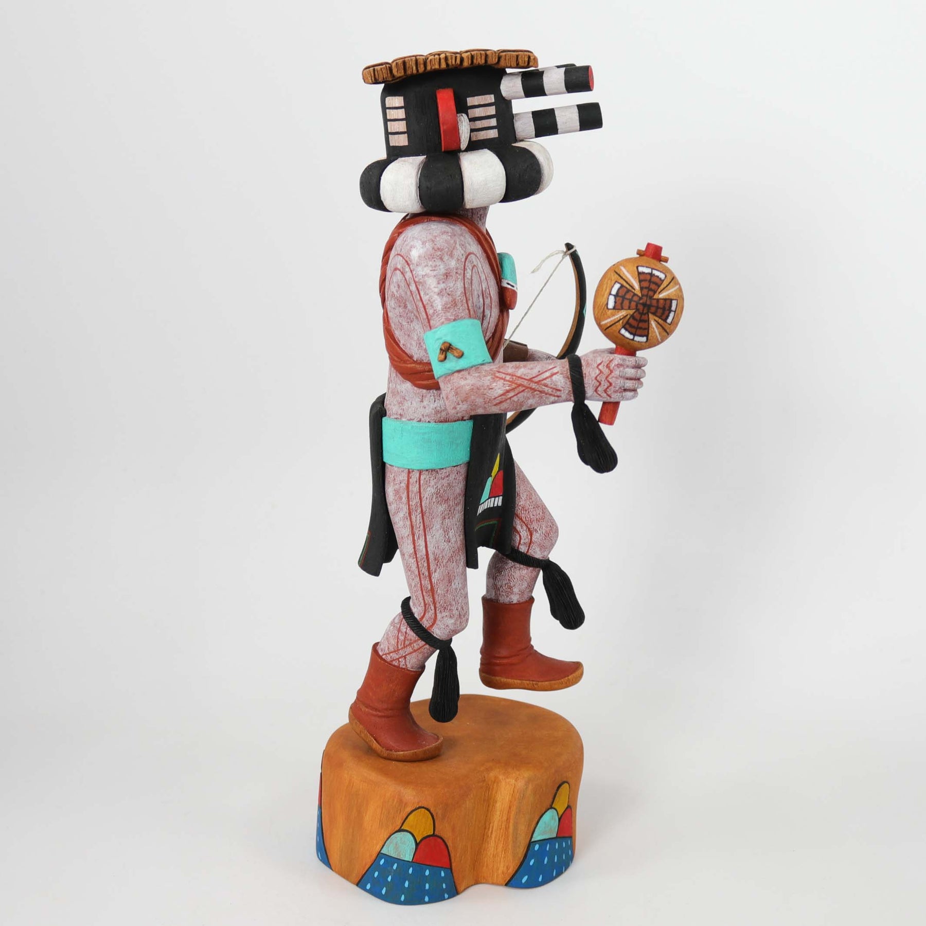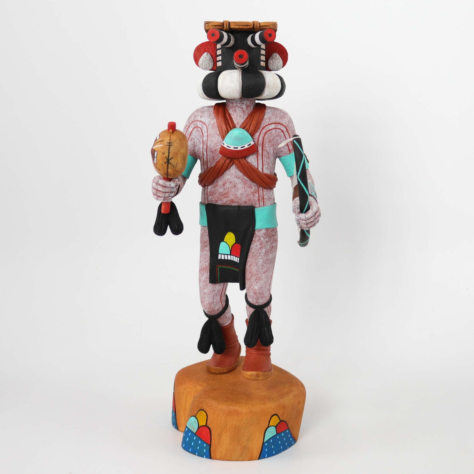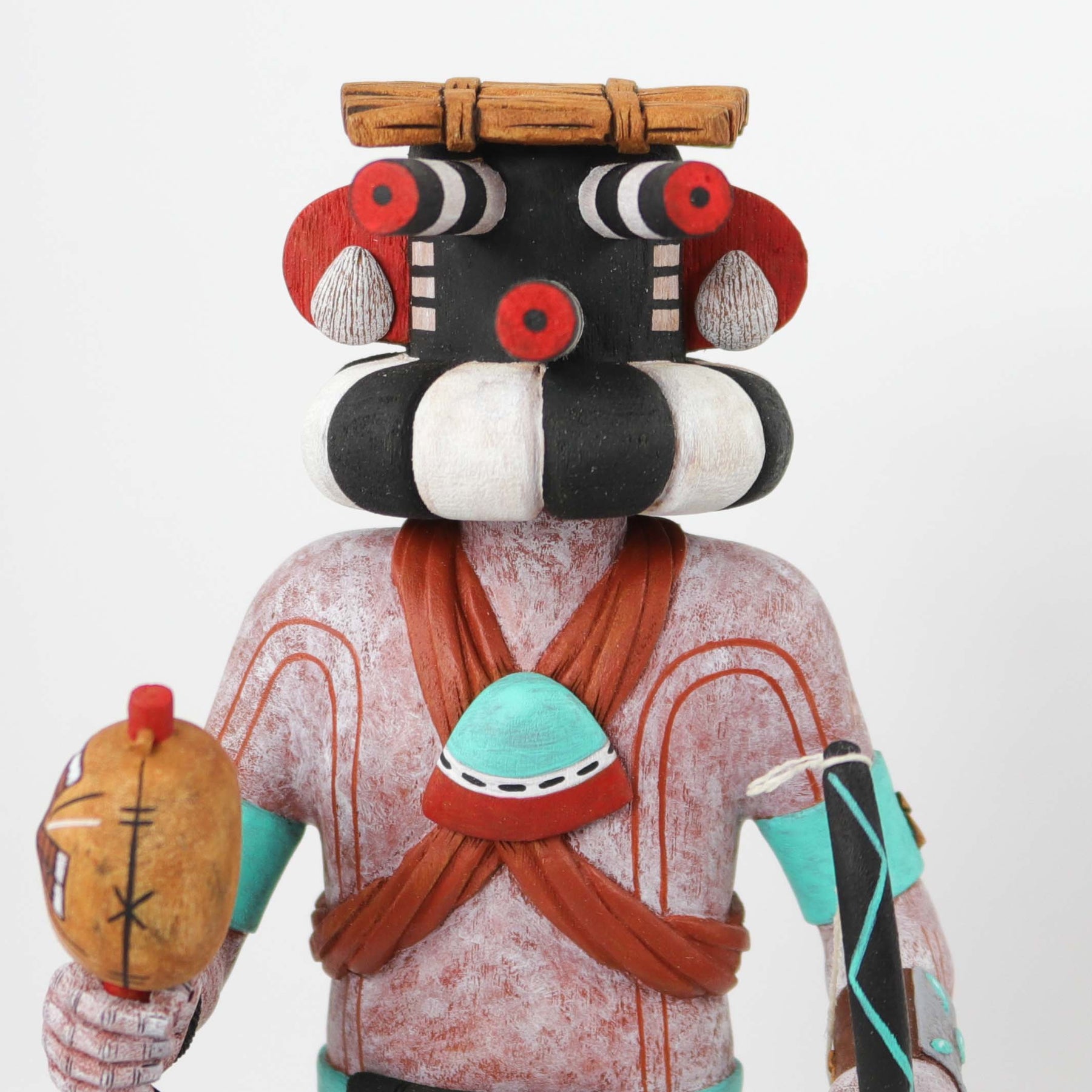 Hand-Carved and Painted Hopi Mocking (Kwikwilyaka) Kachina Holding a Rattle and Bow in a Dancing Motion.