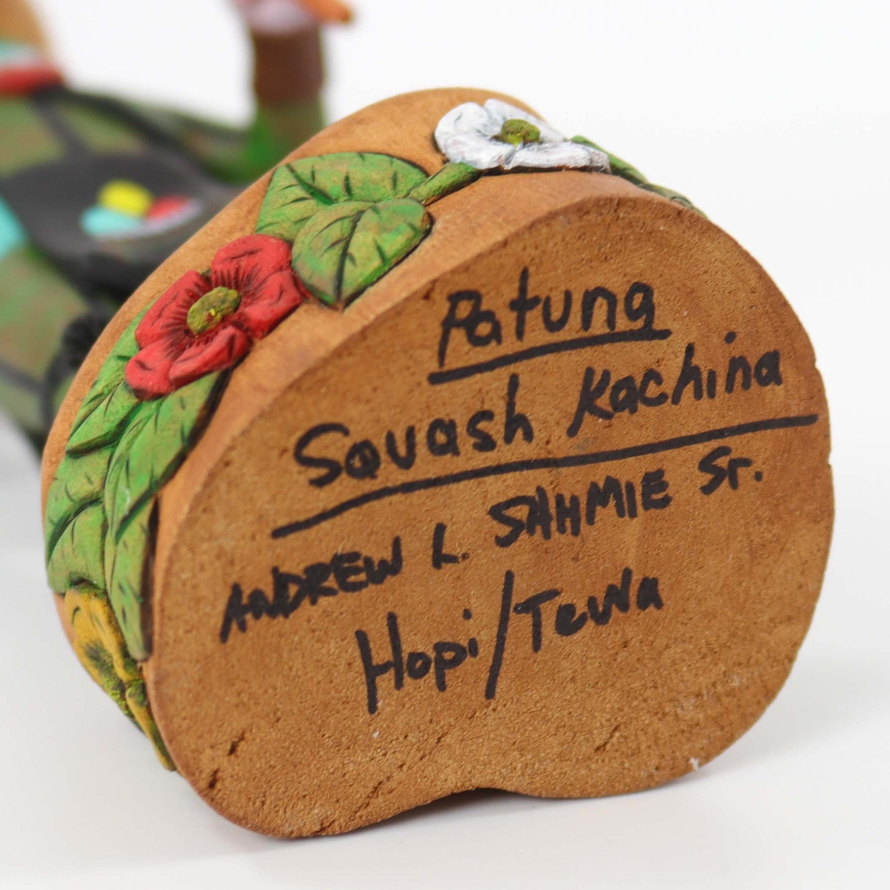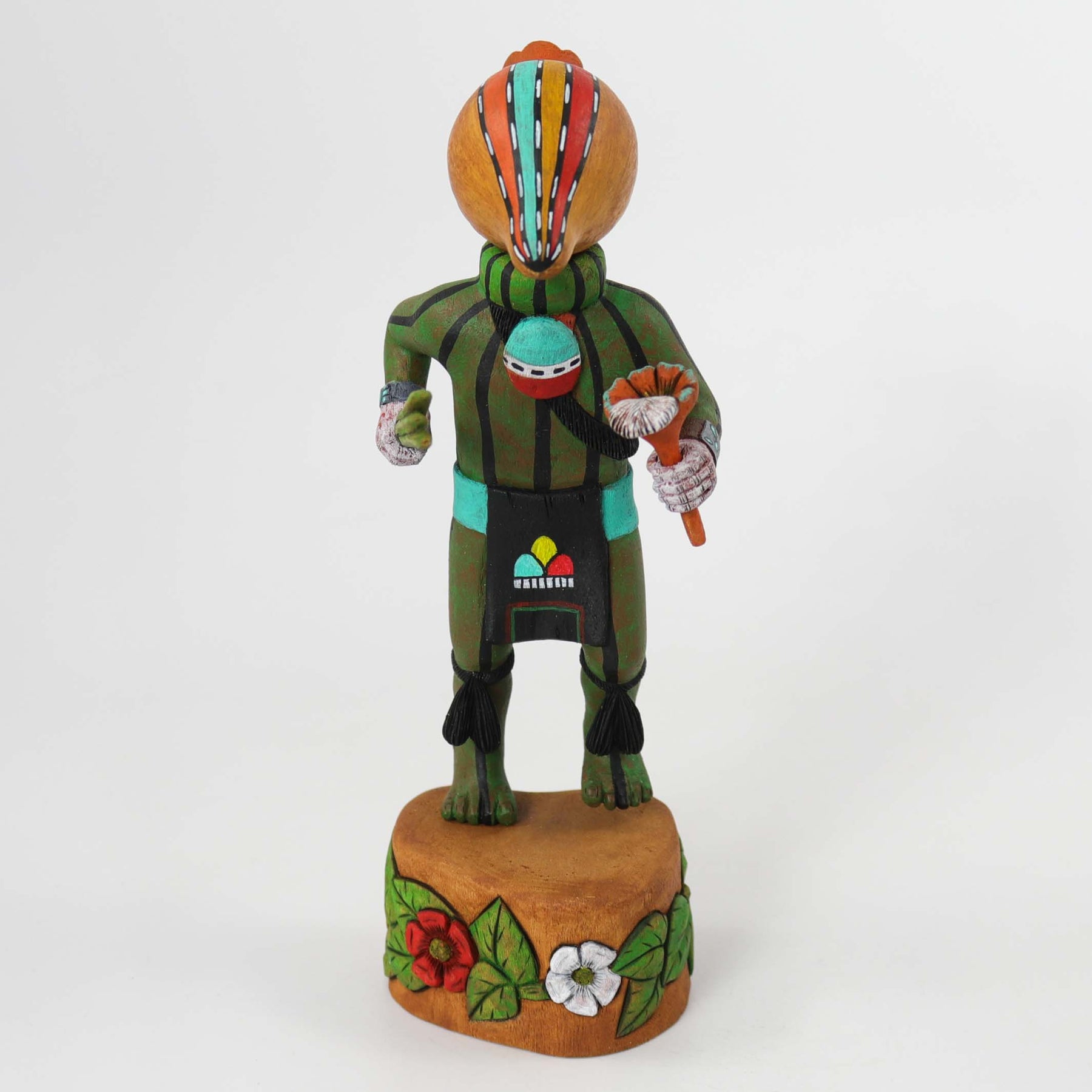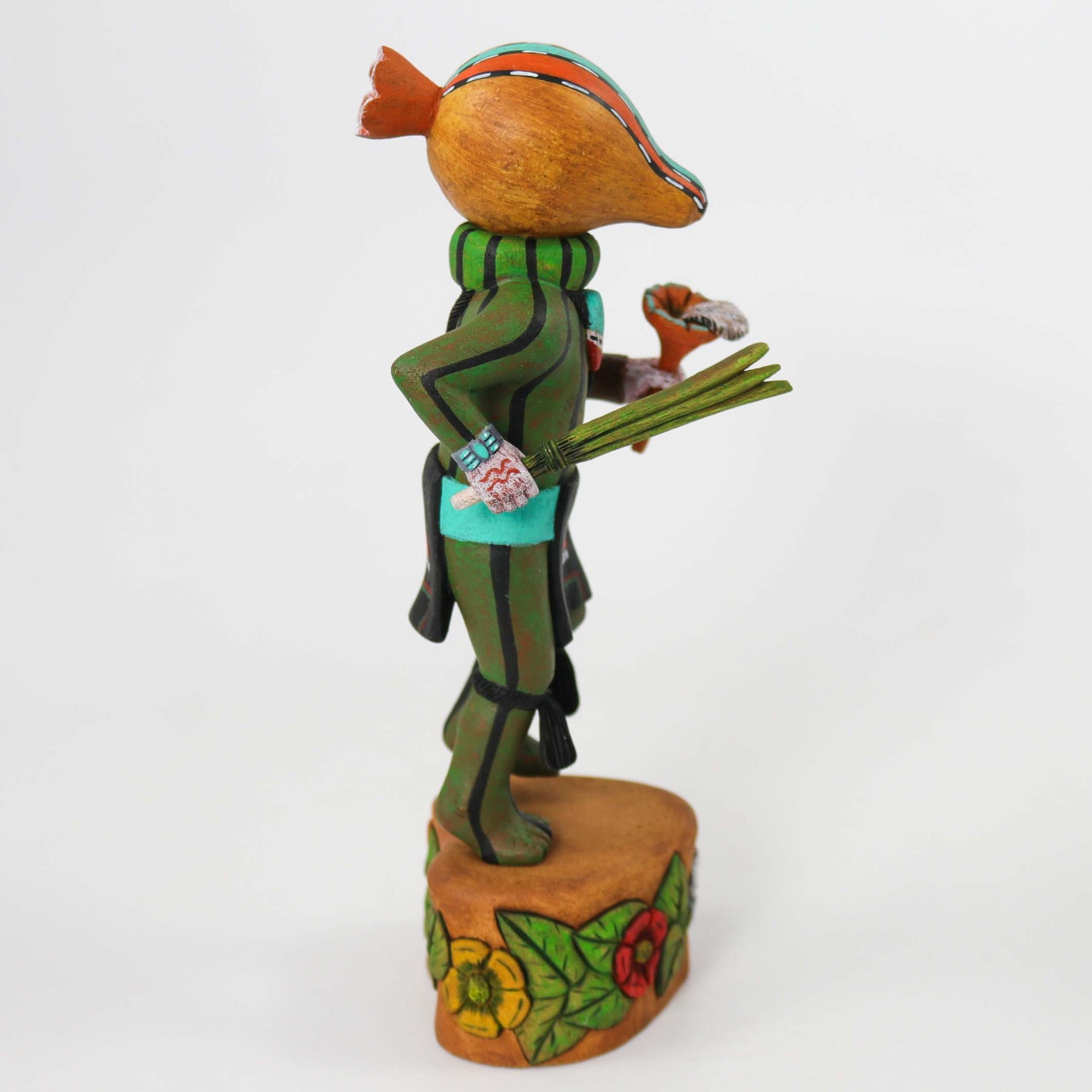 Hand-Carved and Painted Hopi Squash (Patung) Kachina Holding a Flower and Yucca Stalk.