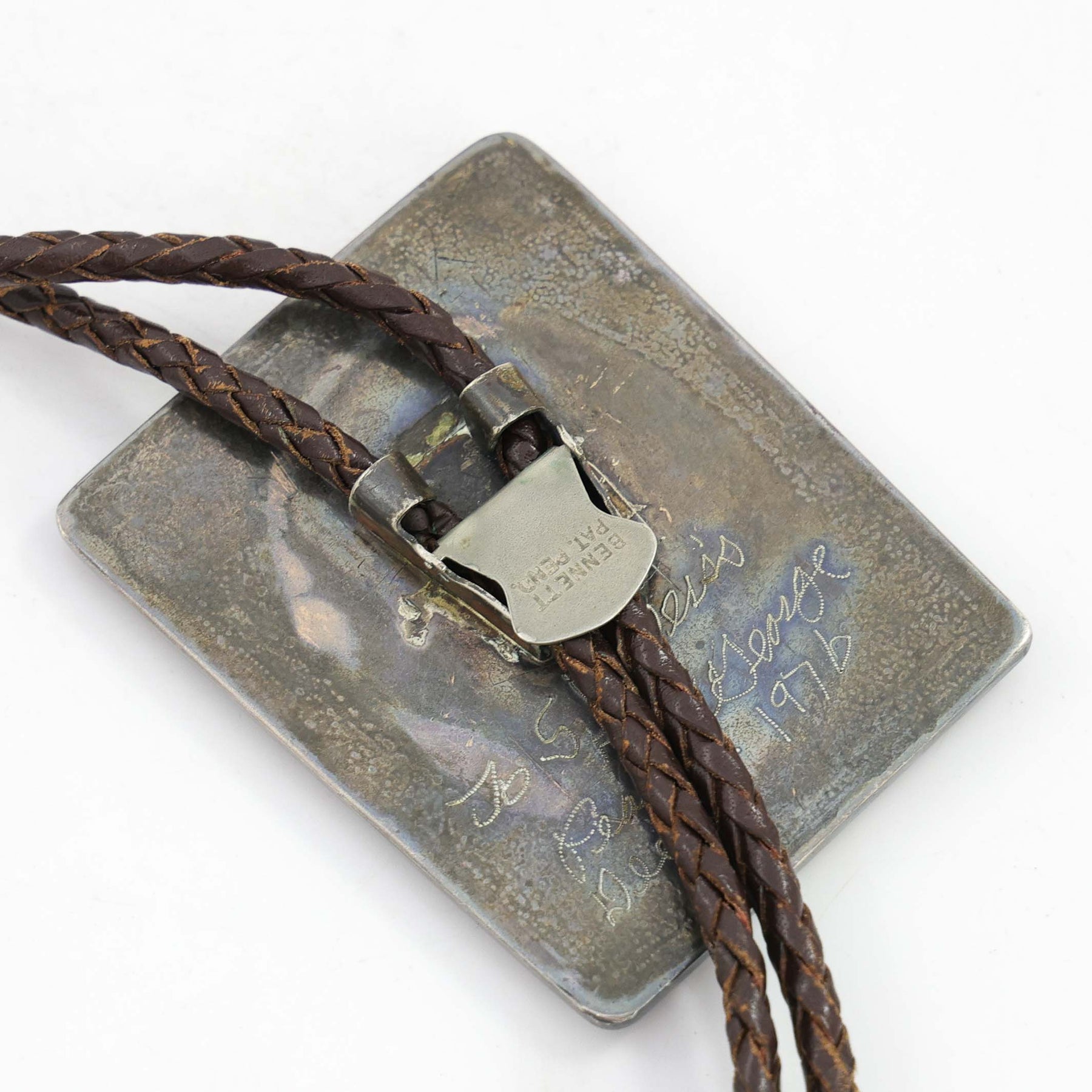 1970s Navajo Sterling Silver Bolo Tie set with Rainforest Jasper (Ryolite). This bolo tie features a clamp backing, a 42” brown leather cord, and sterling silver tips. The leather cord shows wear consistent with the age of the piece. The back is inscribed, “Jo S P Weiss from Pearl and George Dec 25 1976,” indicating it was given as a personal Christmas gift. No artist hallmark is present.