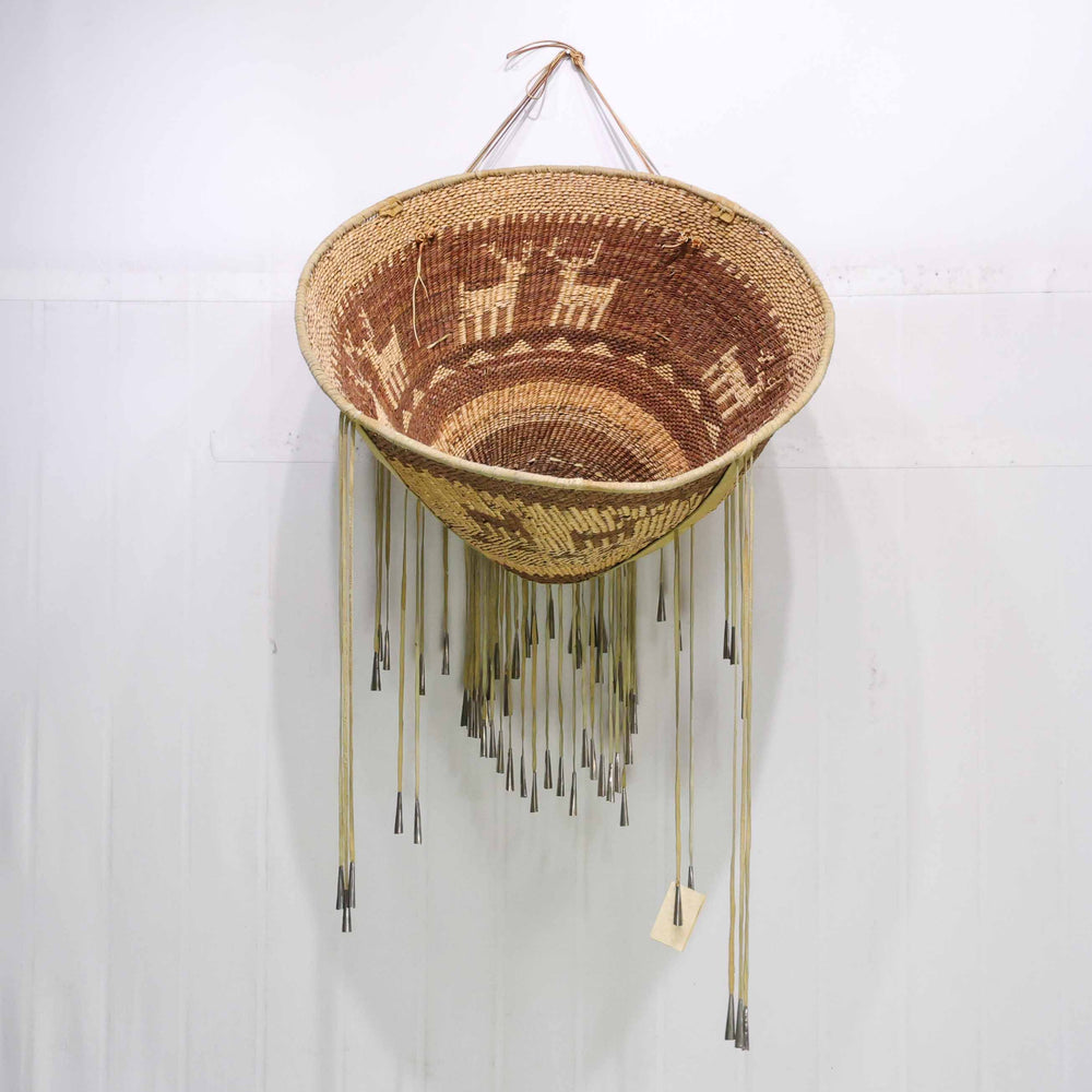 Agriculture brought a need for containers to hold grain and food. Basketry was the perfect solution for Native American tribes and examples can be found as early as 50CE. Techniques and materials vary across tribes, including coiled, plaited, and twined techniques and materials such as beargrass, devil’s claw, sumac, willow, and yucca. Modern basketry is almost entirely decorative or ceremonial. Navajos still commonly use wedding baskets in their marriage ceremonies.