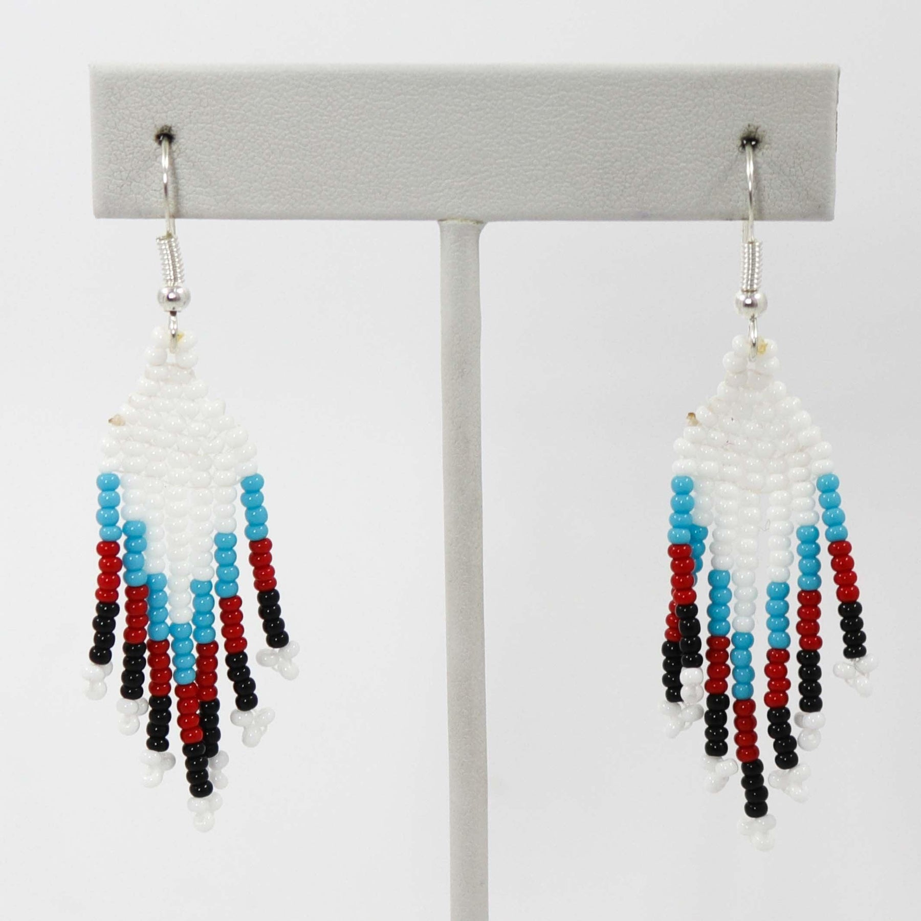Multiple Strand Glass Bead Necklace with Navajo Rug Design and Sterling Silver Clasp. Necklace is paired with matching french hook dangle earrings.
