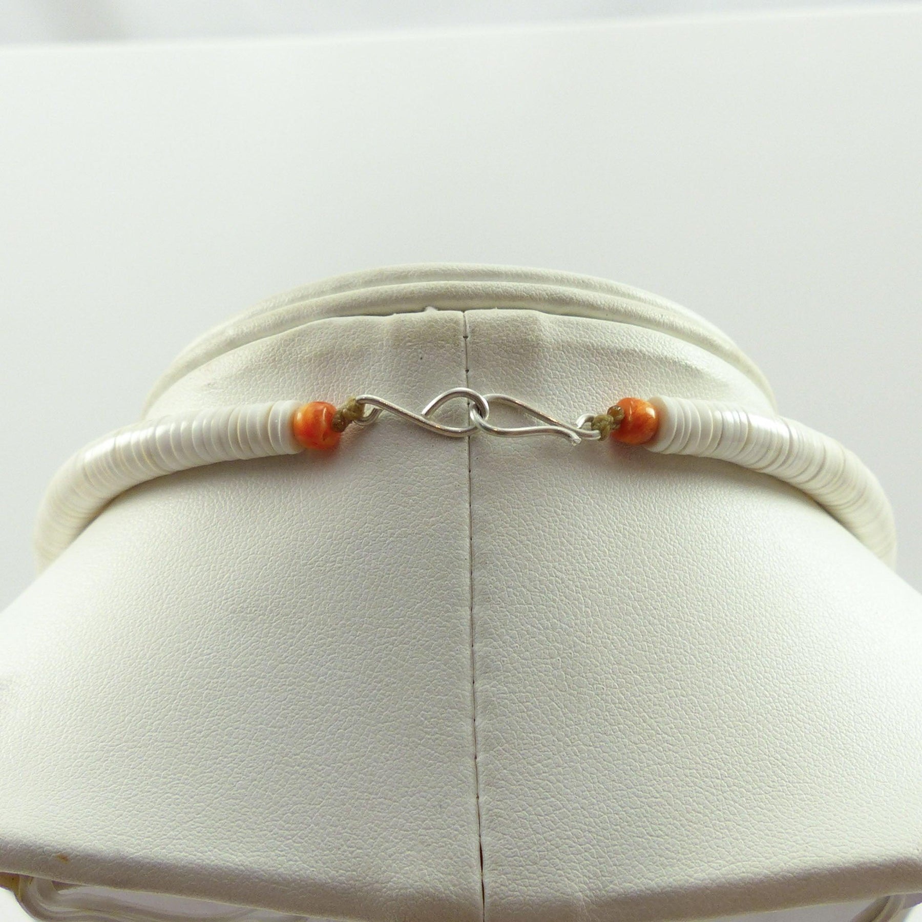 Single Strand Hand Rolled Necklace with Melon Shell and Spiny Oyster Shell Beads. This necklace has sterling silver cones and clasp.