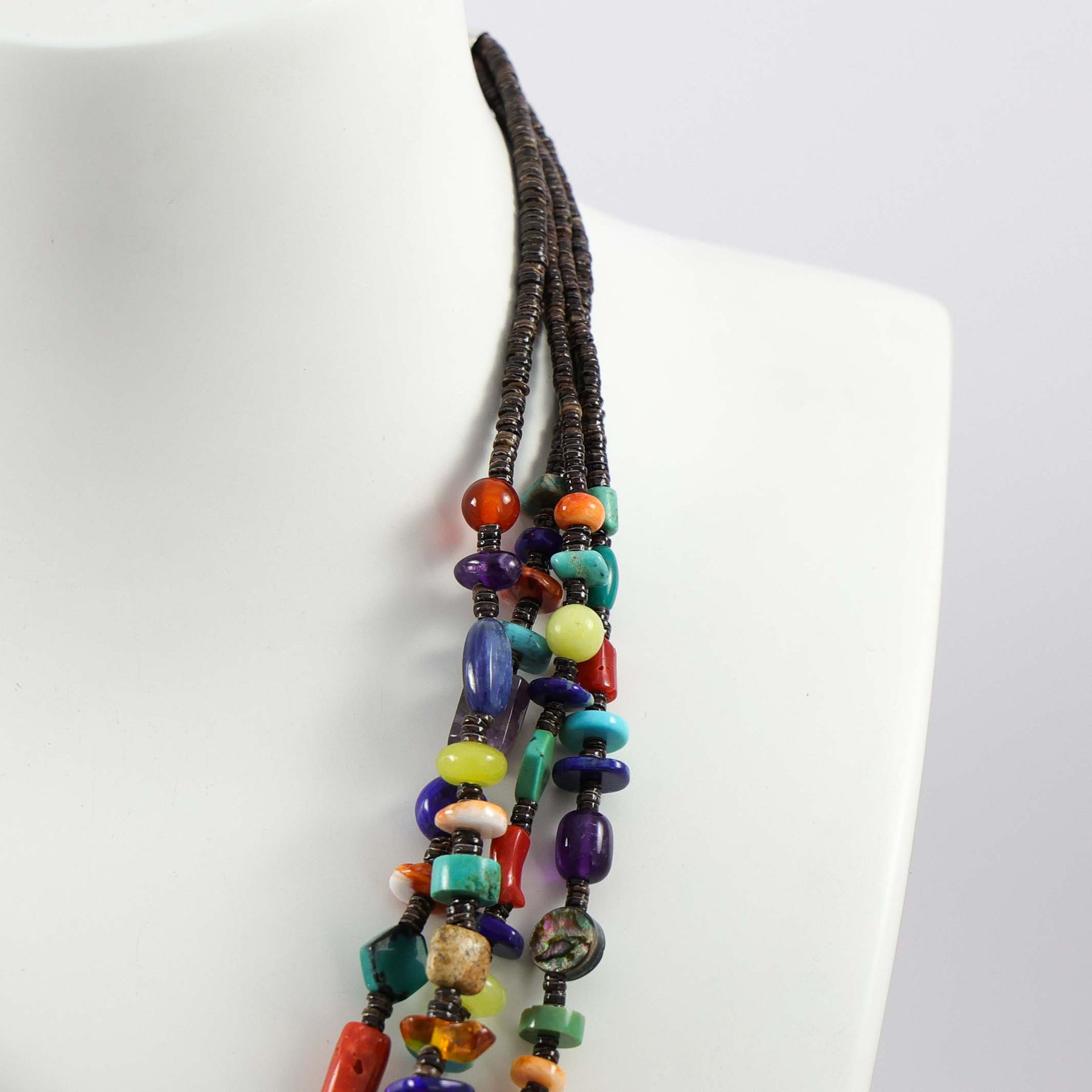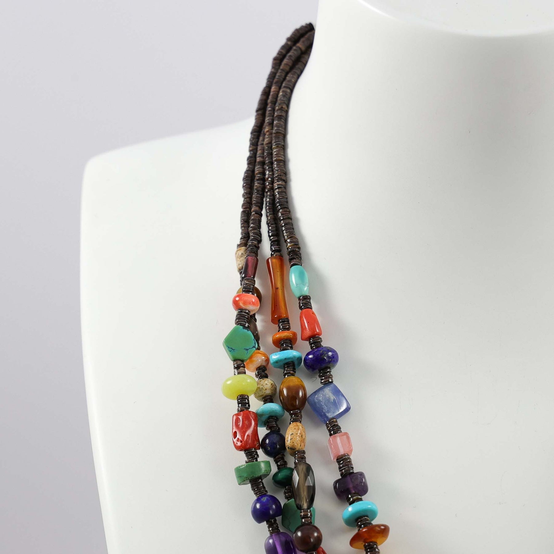 Four Strand Necklace with Lapis, Carnelian, Coral, Amethyst, Spiny Oyster, Turquoise, Rose Quartz, Charoite, Butterscotch Amber, Smoky Quartz, Amber, Picture Jasper, and Tiger’s Eye. This necklace has a sterling silver clasp.