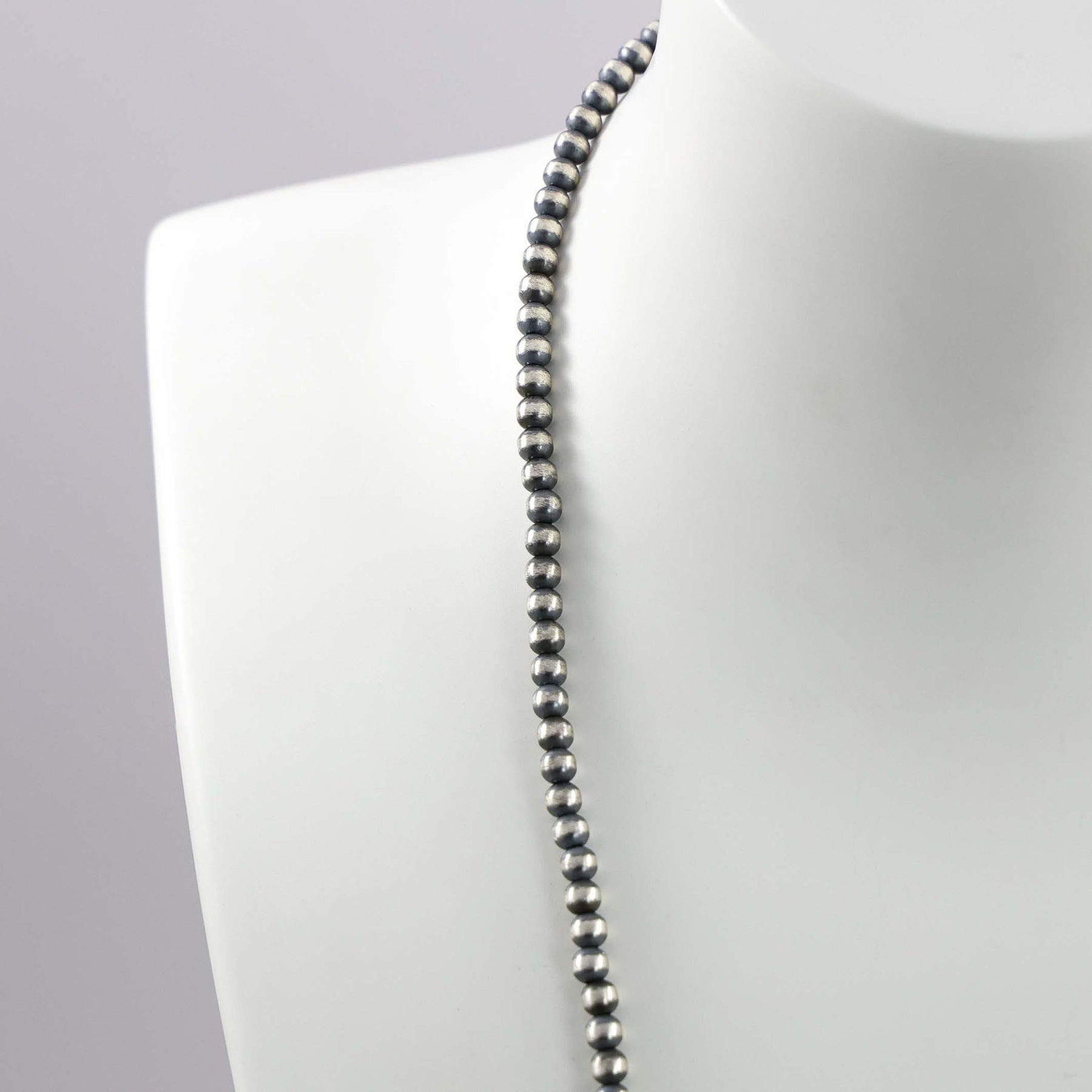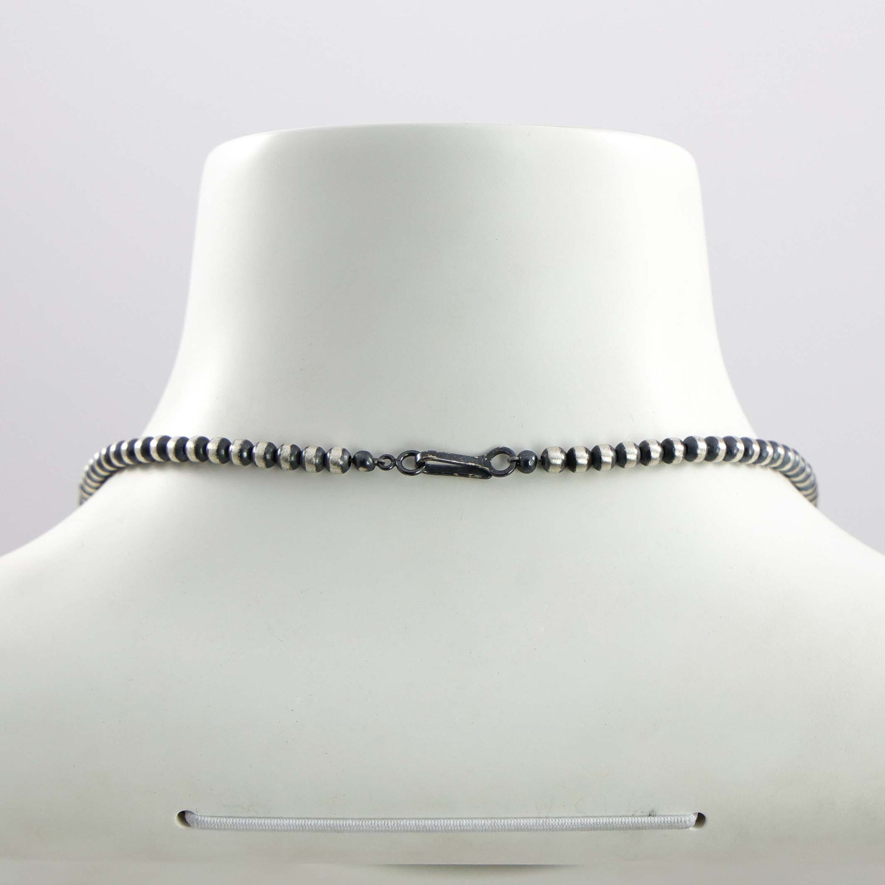 Single Strand Sterling Silver Necklace with Navajo Bench Beads and Stabilized Turquoise Nugget Bead. These 4mm “bench beads” are crafted by a group of Navajo artisans in New Mexico using a combination of traditional hand-finishing techniques and modern machine-assisted processes. This necklace looks elegant worn alone or paired with a pendant, and the small bead size provides versatility for a wide range of styles.