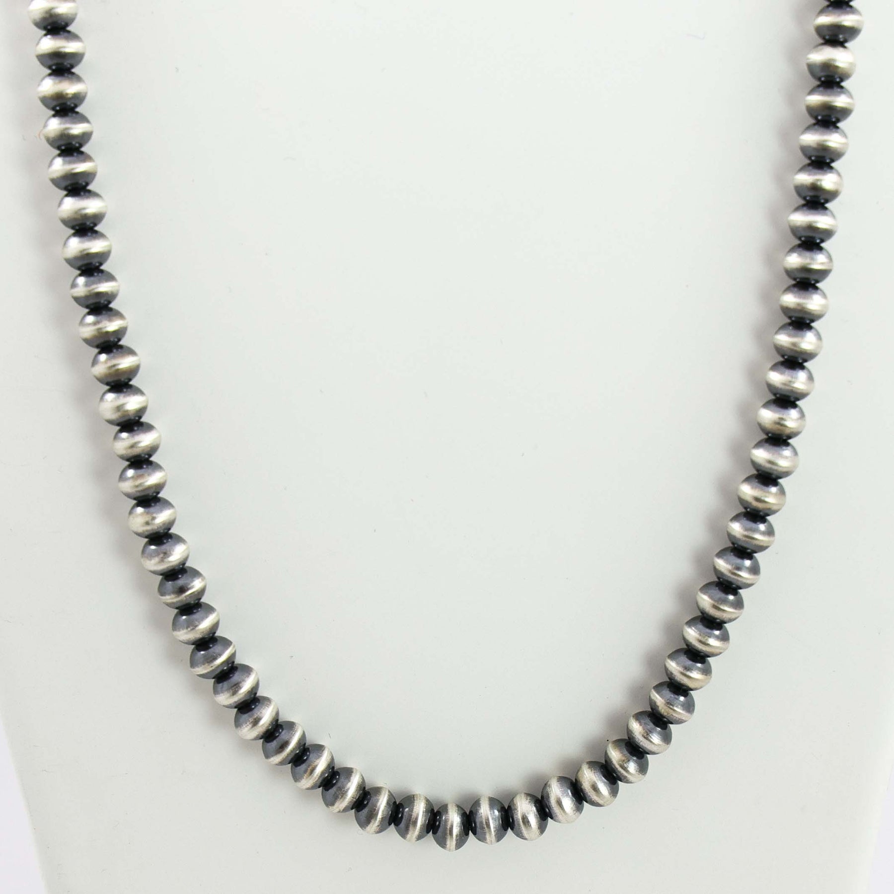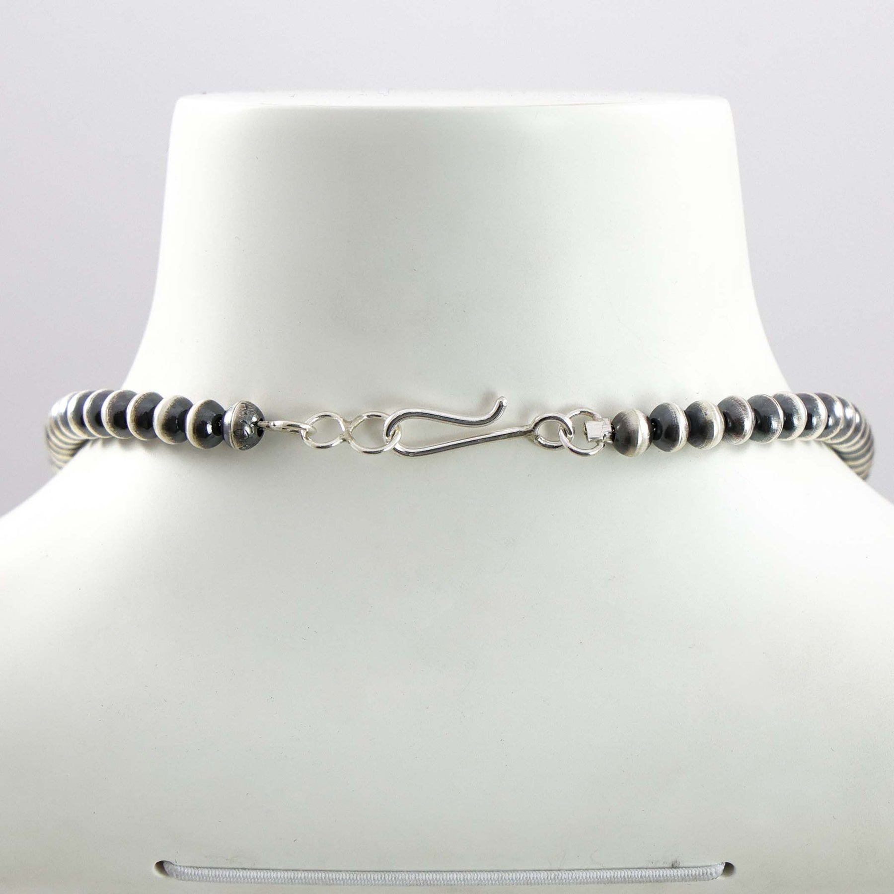 Sterling Silver Navajo Pearl Necklace with Handmade Beads in an Oxidized Finish.