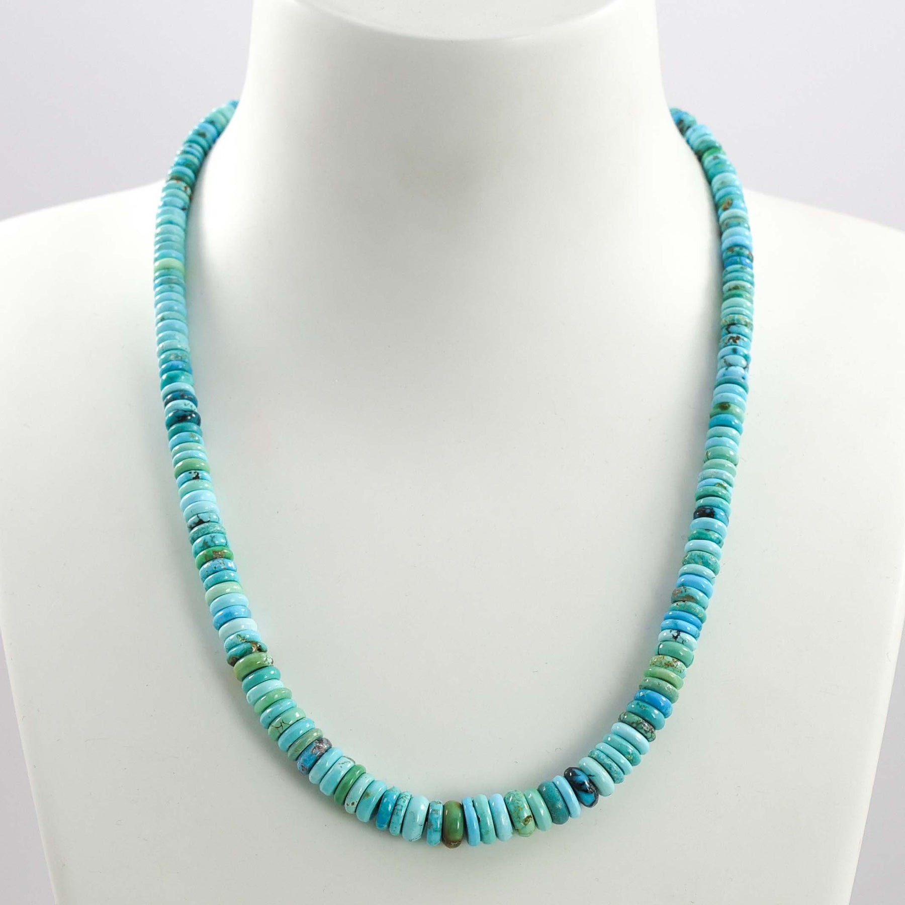 Single Strand Necklace with Hand-Rolled Natural Turquoise from the Bisbee, Blue Moon, Carico Lake, Damele, Easter Blue, Fox, Kingman, Patagonia, Royston, and Tonopah Mines. This necklace is completed with a handmade sterling silver clasp.