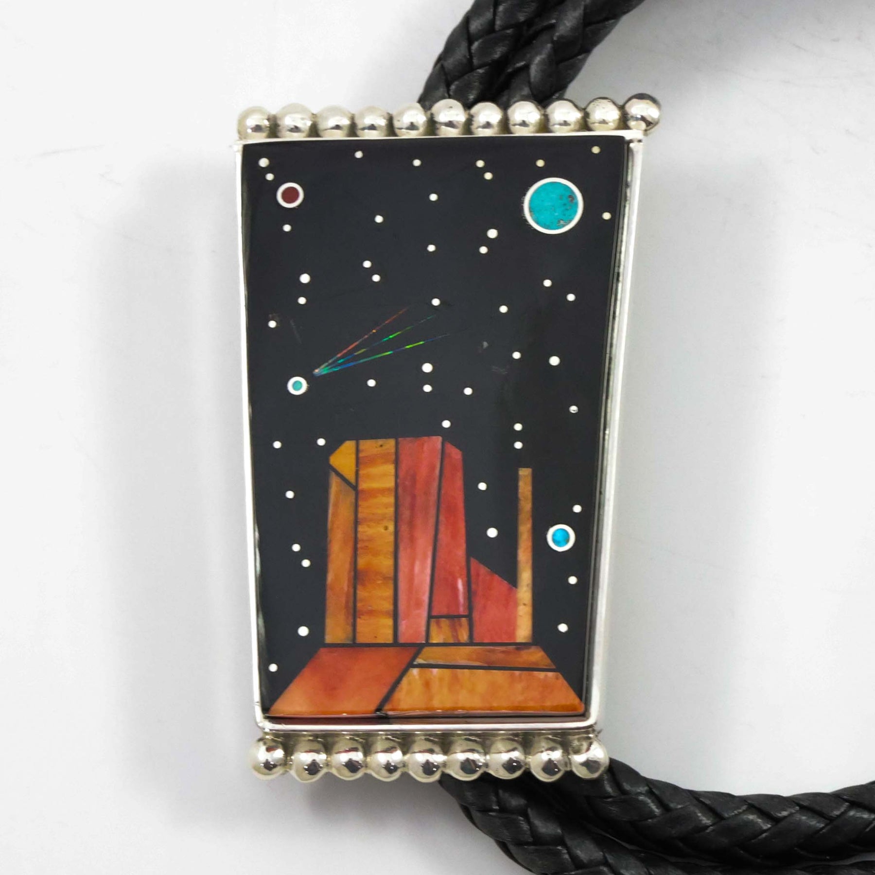 Sterling Silver Bola Tie Depicting Monument Valley at Night with Mosaic Inlaid Jet, Spiny Oyster Shell, Natural Turquoise, and Opal. The bola tie has a 43” 10 ply black leather cord, figure eight backing, and handmade tips.
