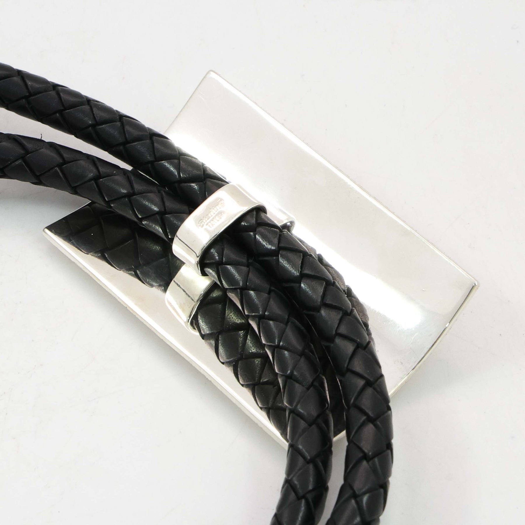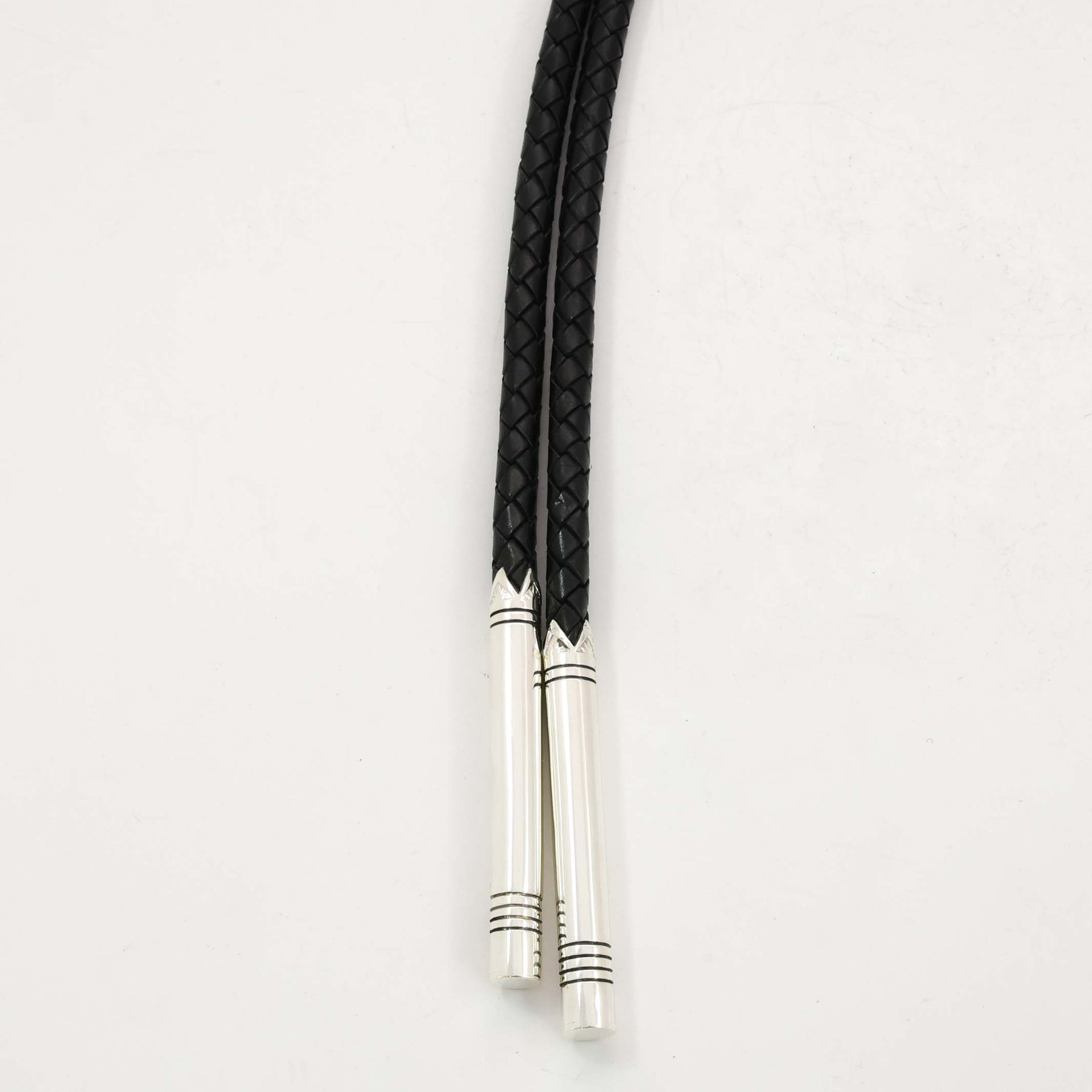 Sterling Silver Bola Tie with Four Panels of Overlaid Navajo Rug Designs. This bola tie has handmade sterling silver tips on a black leather cord.