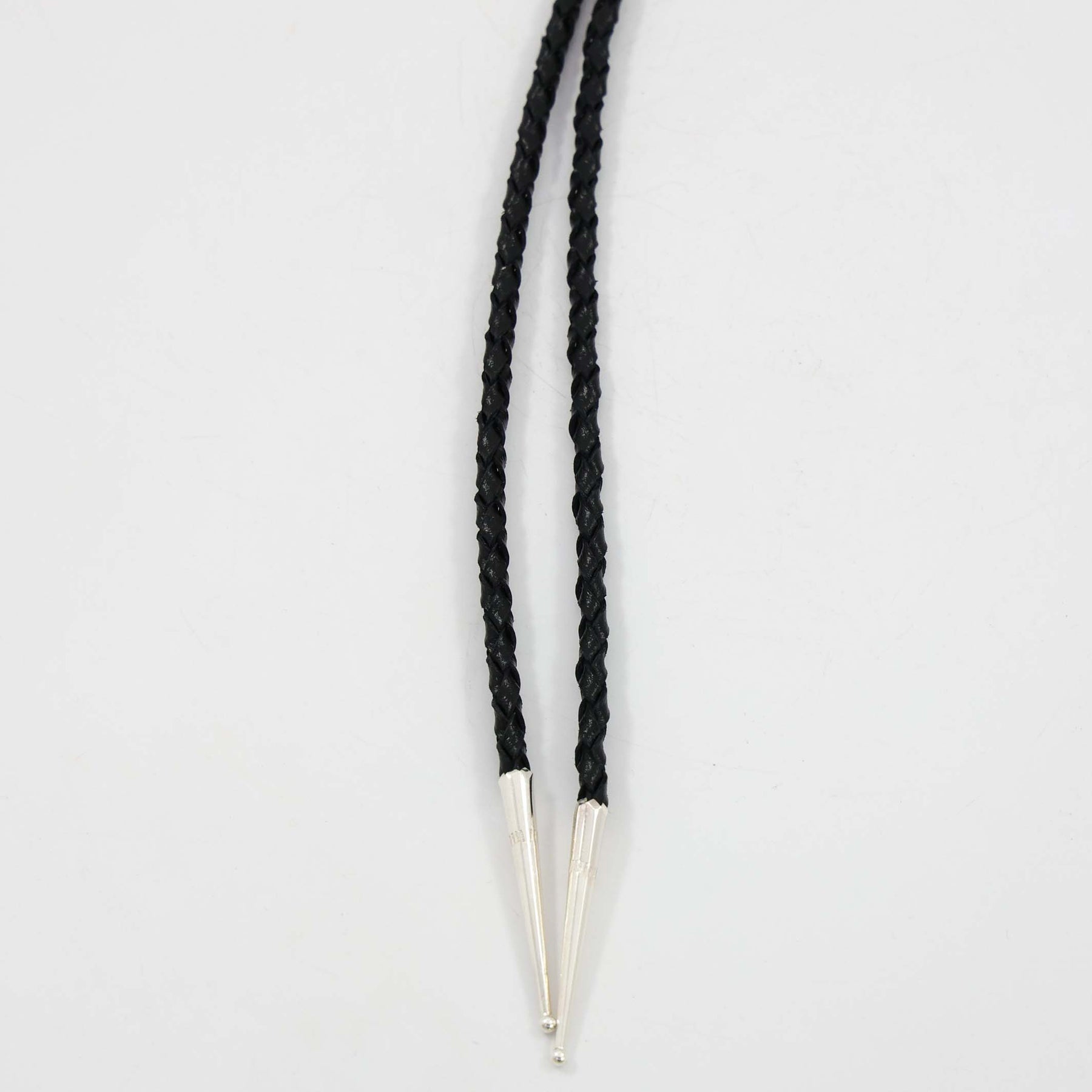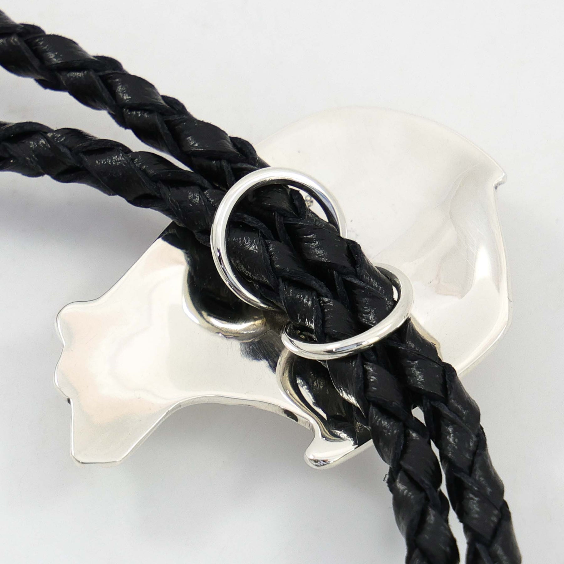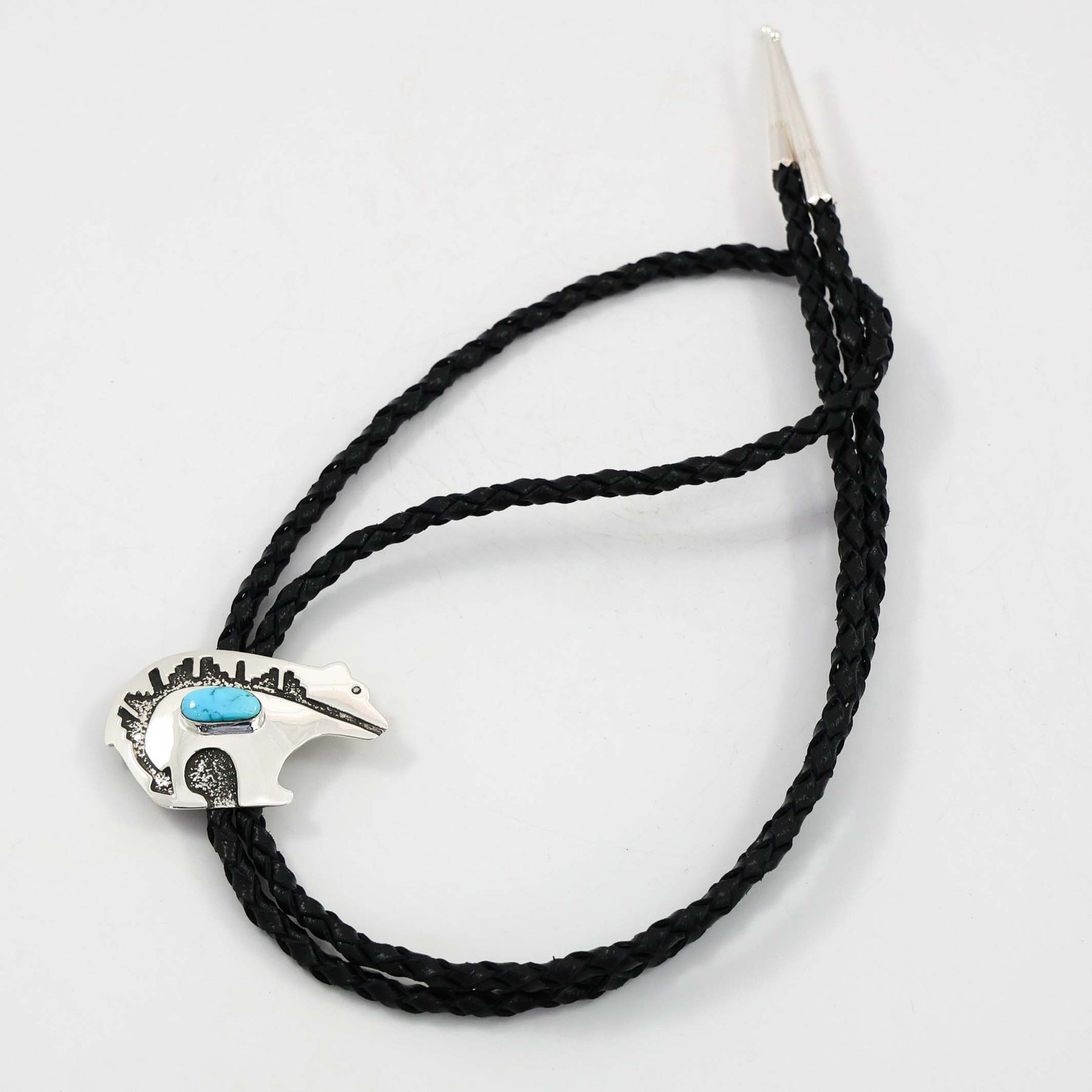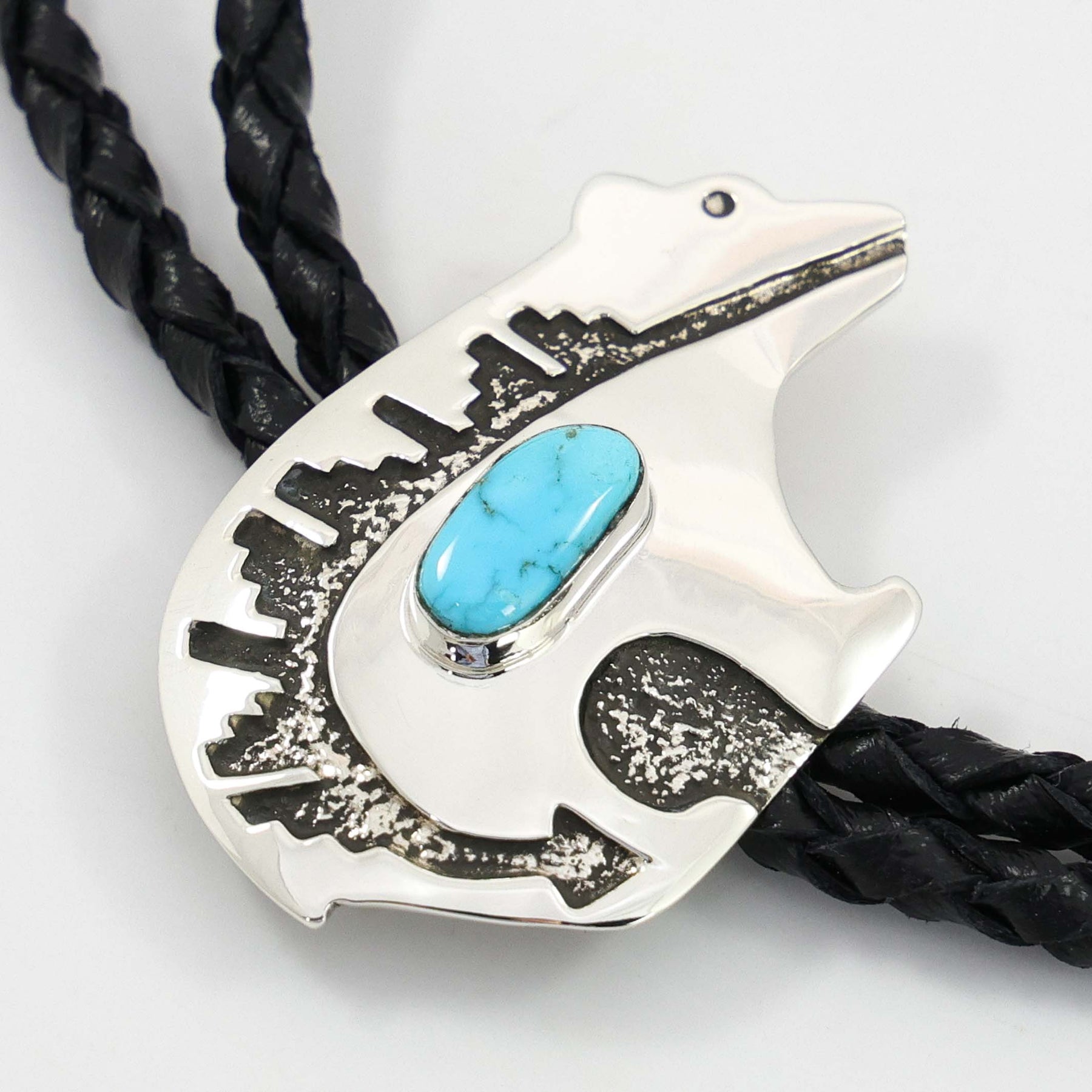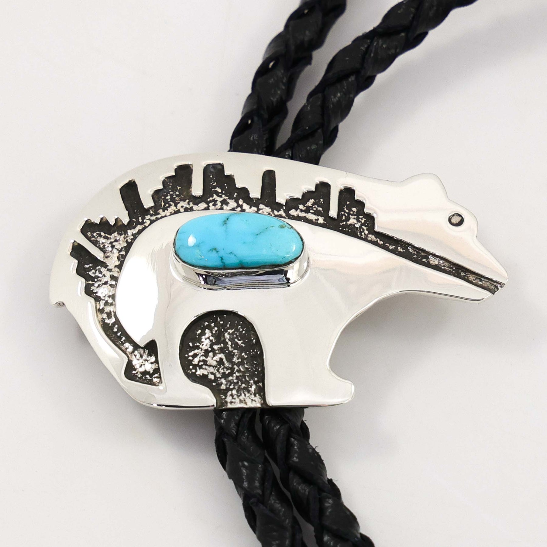 Sterling Silver Bear Bola Tie set with Kingman Turquoise from Arizona. This bola tie has a figure-eight backing, sterling silver tips, and a black braided leather cord.