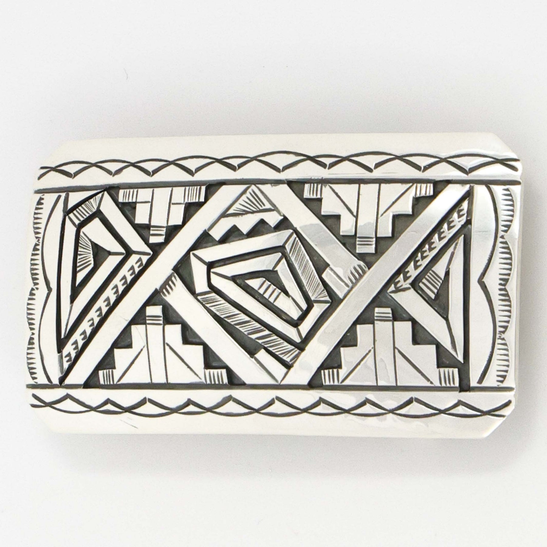 Sterling Silver Western Style Belt Buckle with Navajo Overlaid and Hand-Stamped Design Elements.