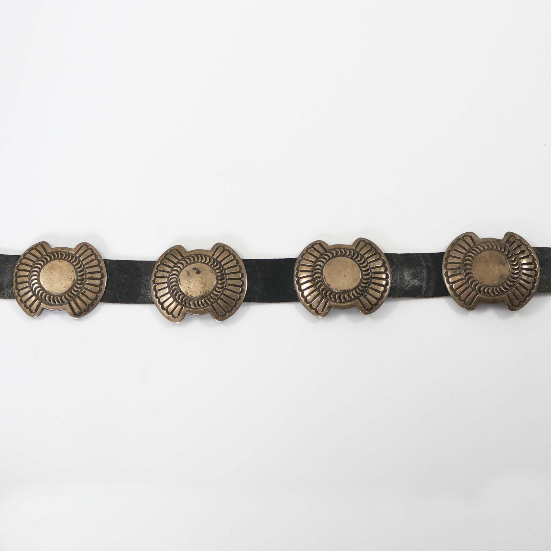 Vintage Navajo (circa 1960s) Sterling Silver Concho Belt with Hand Stamped Designs. This belt features a round buckle and 11 conchos on 1” wide black leather. This belt is stamped, “Sterling” but it unsigned.