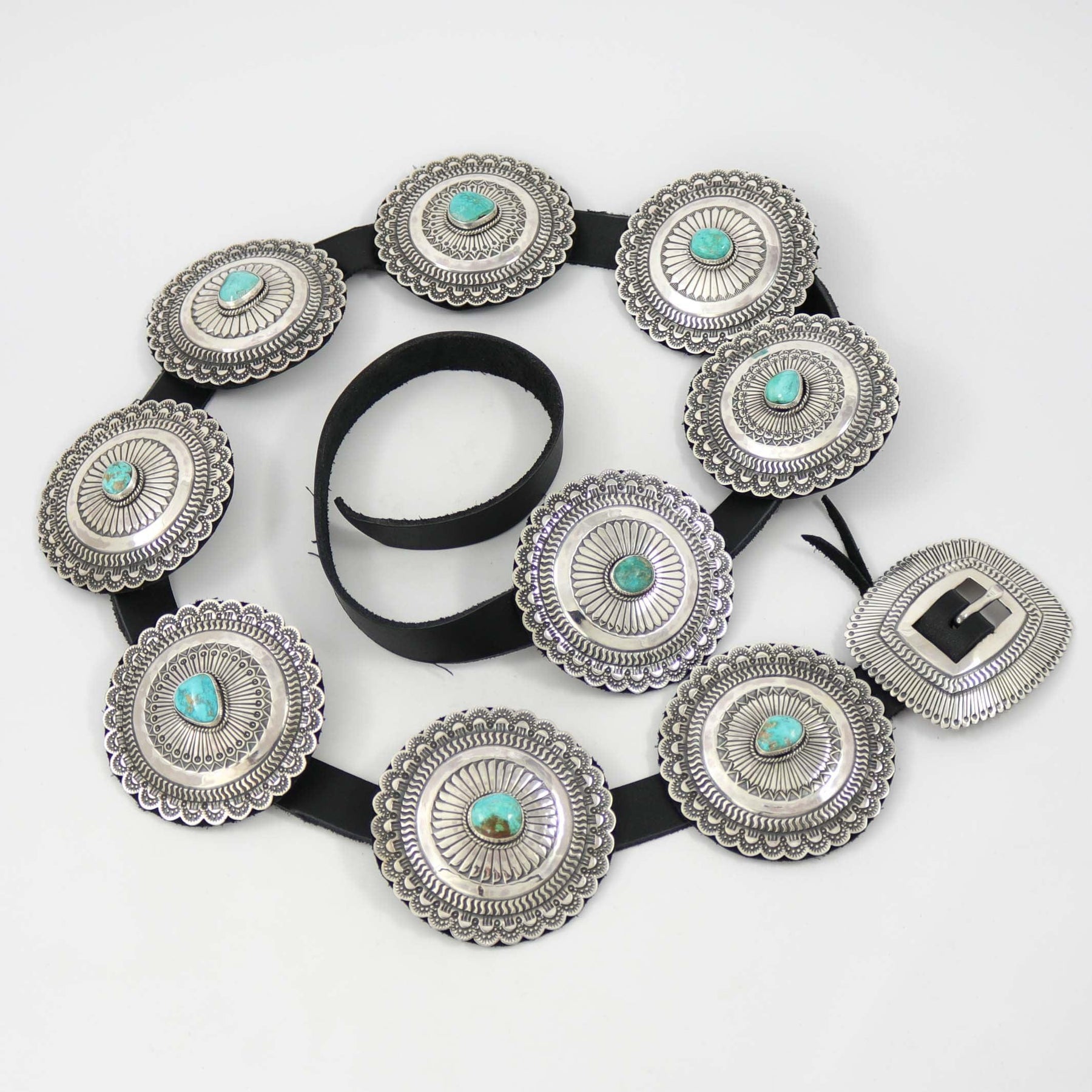 Sterling Silver Concho Belt with Intricate Hand-Stamped Designs and set with Natural Royston Turquoise from Nevada. This concho belt features a buckle, nine conchos, sterling silver backing, and a .75” black leather belt.