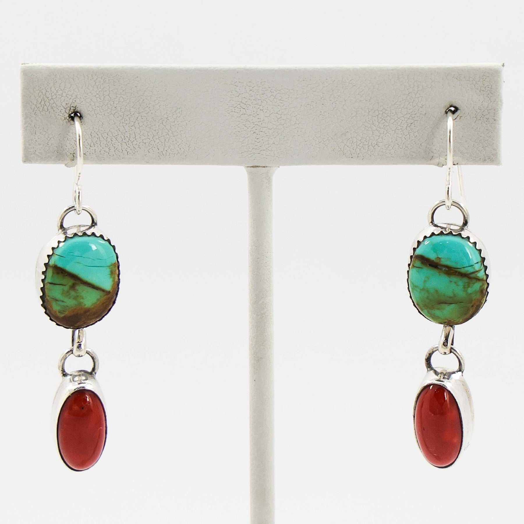 Sterling Silver French Hook Earrings set with Royston Turquoise from Nevada and Coral.