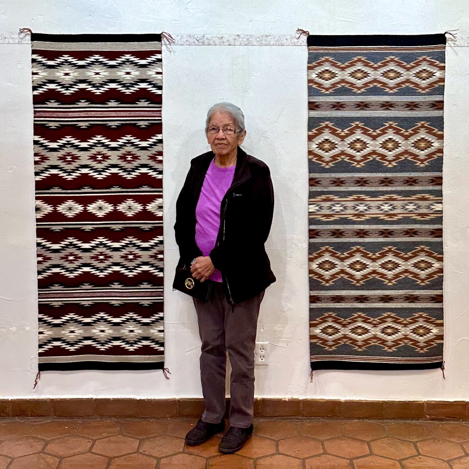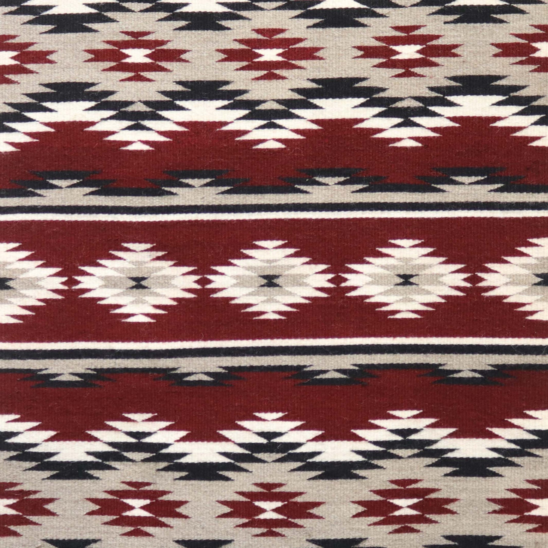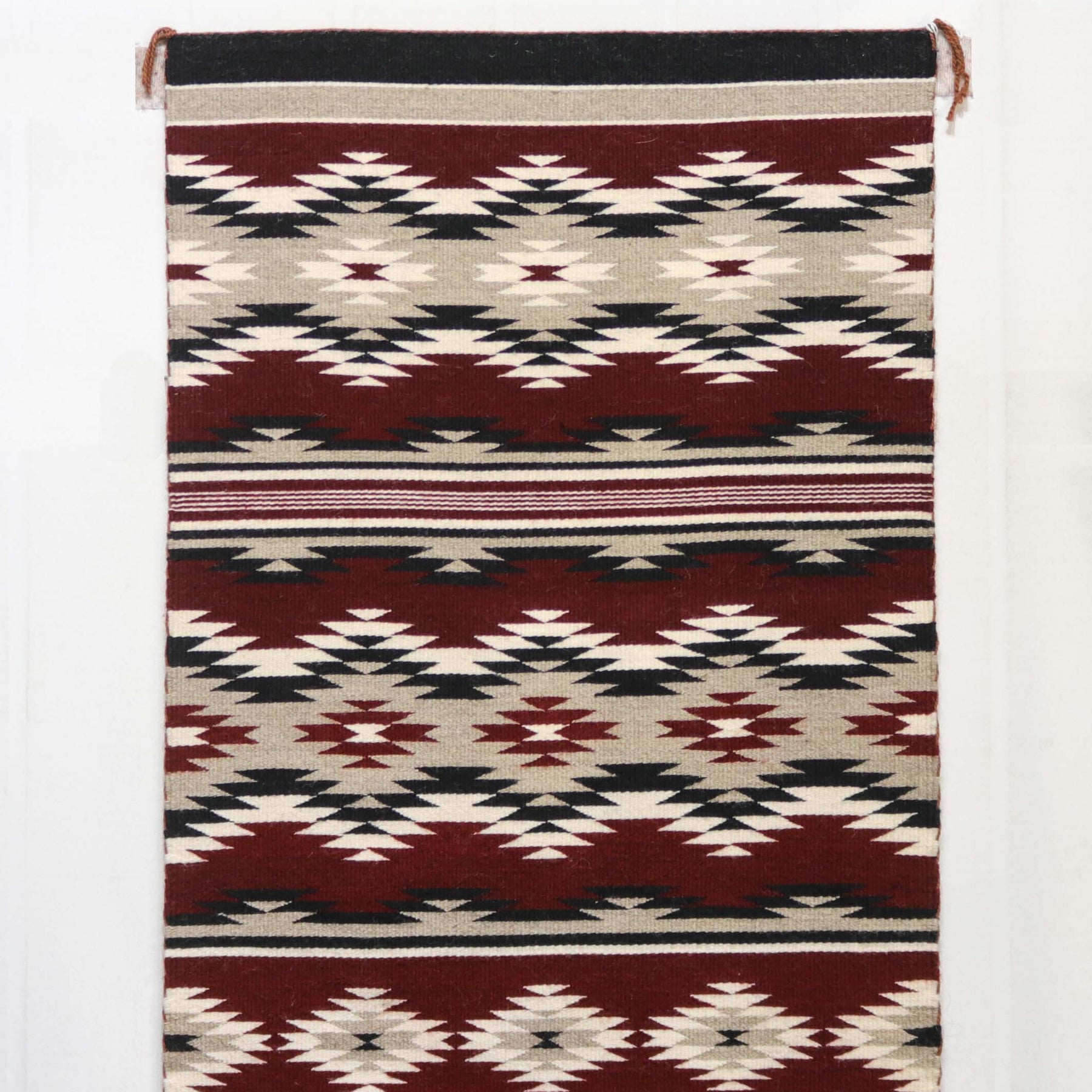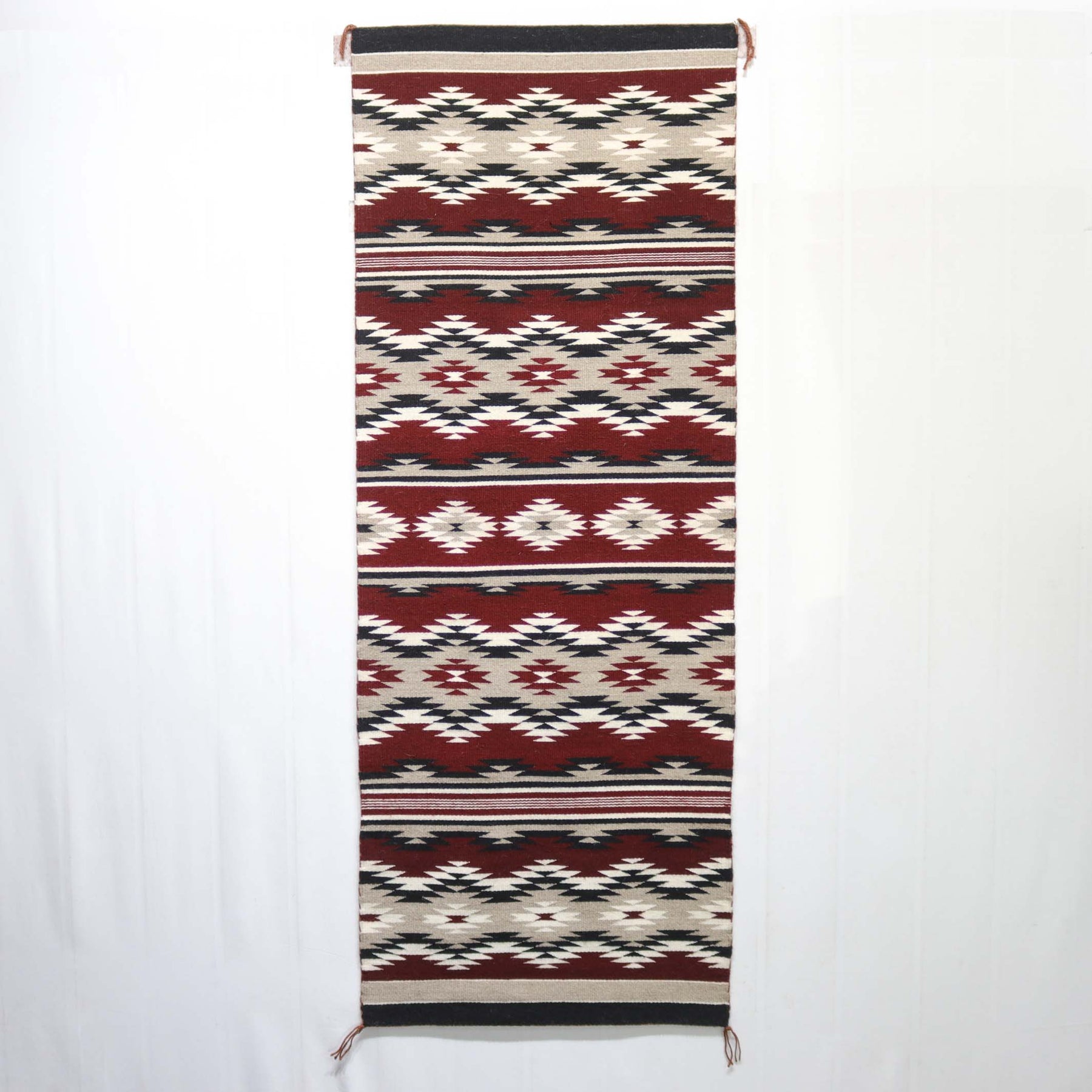 Handwoven Navajo Crystal Runner with Banded Diamond Design and Red Background.
