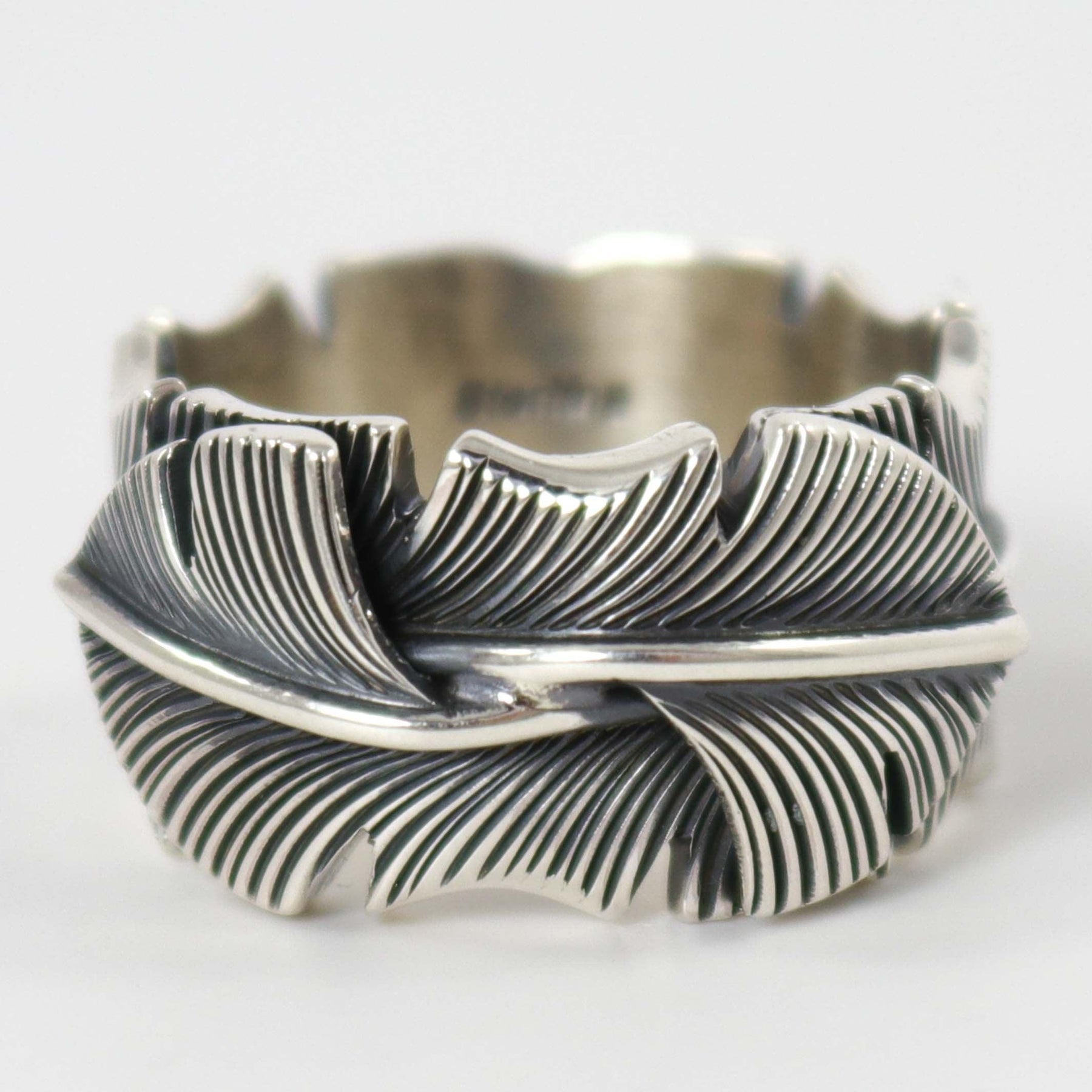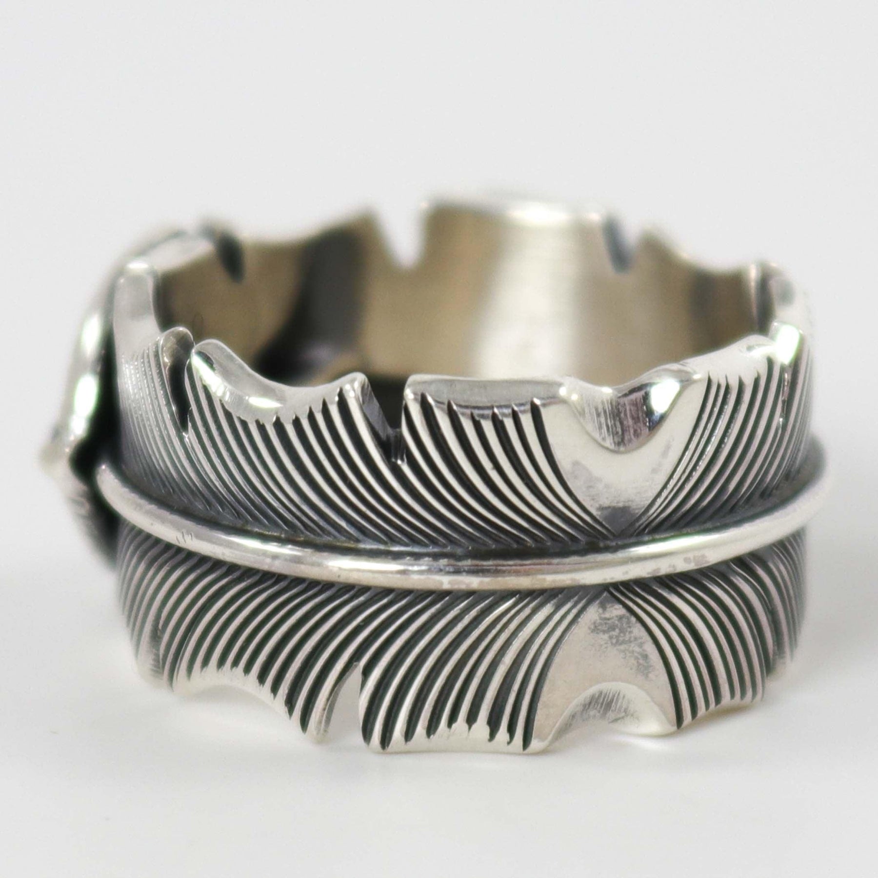 Sterling Silver Feather Ring with Hand-Stamped and Filed Designs.