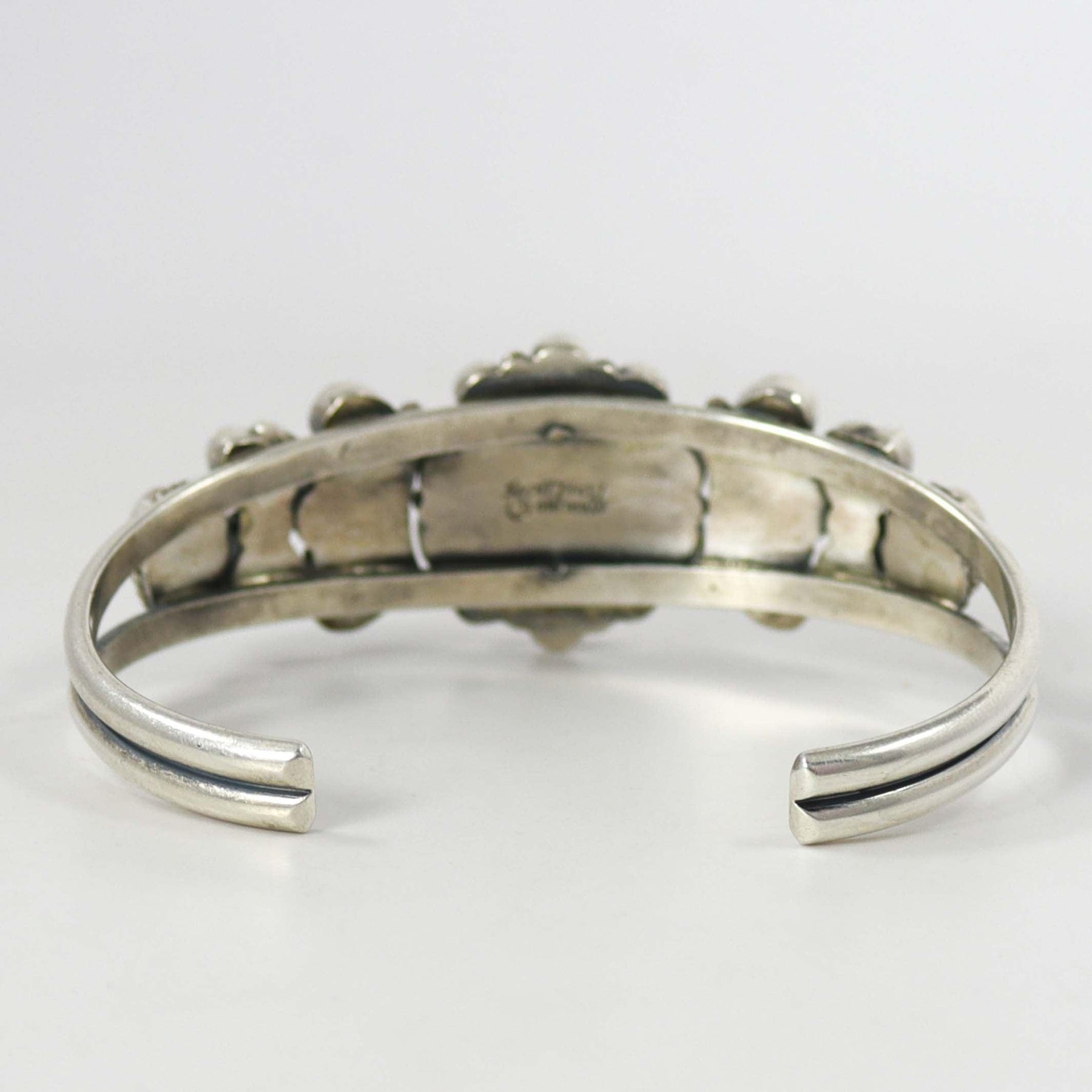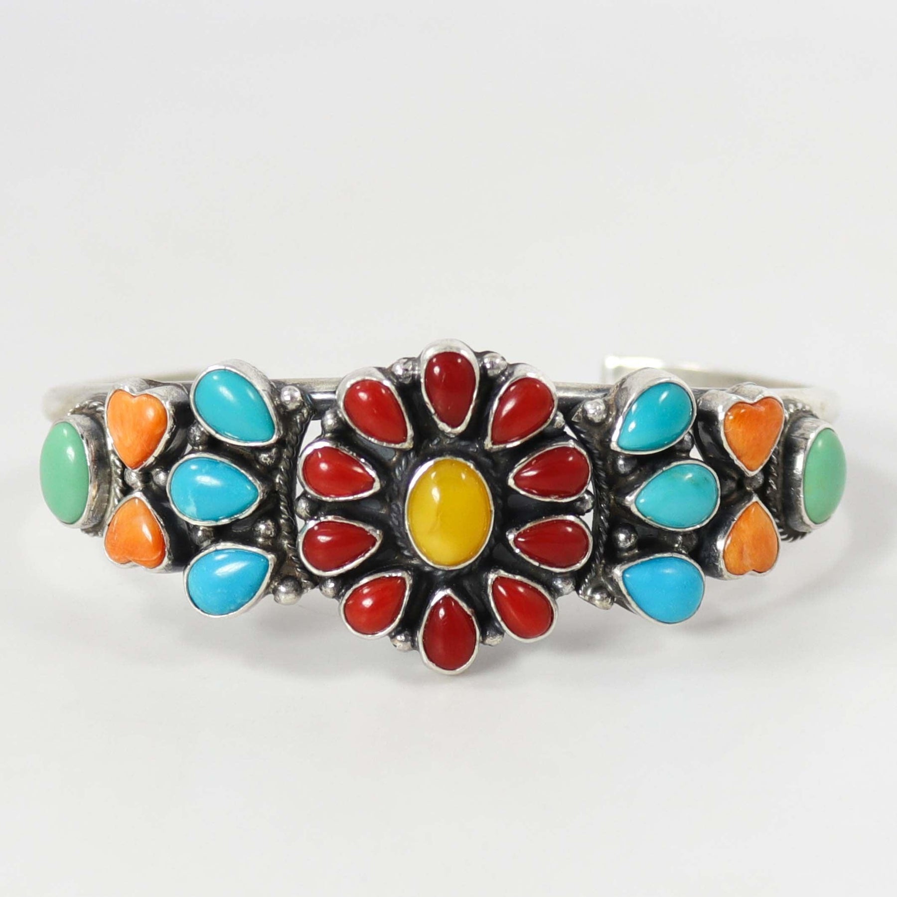 Sterling Silver Cluster Cuff Bracelet set with Variscite, Spiny Oyster Shell, Sleeping Beauty Turquoise, Coral, and Citrine.
