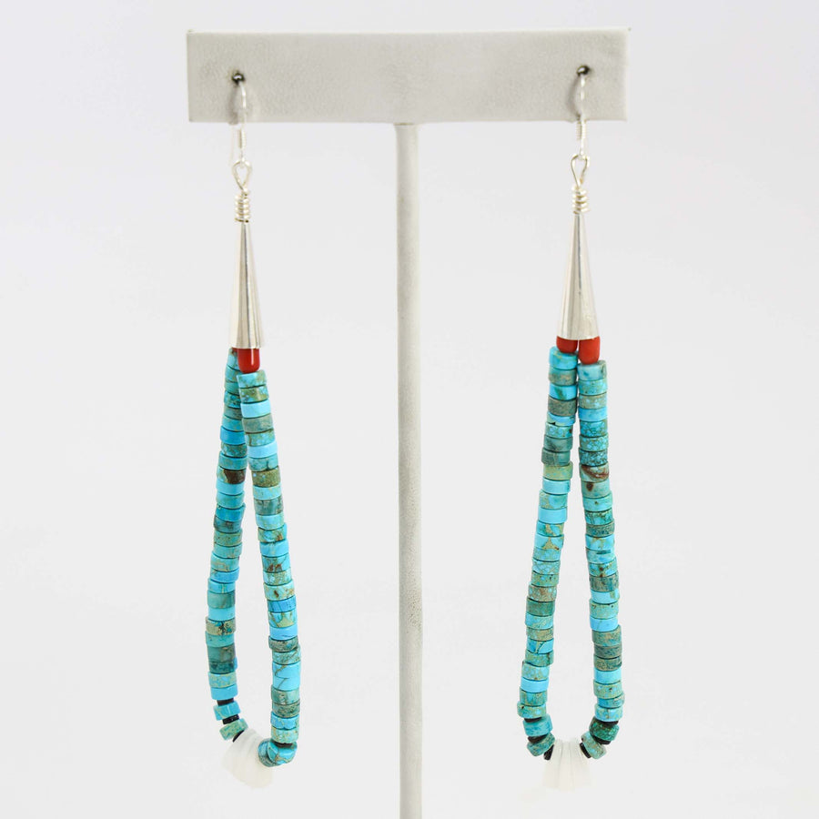 Sterling Silver French Hook Dangle Earrings with Mosaic Inlaid Turquoise, Melon Shell, Mother of Pearl, and Lapis on a Shell Backing.