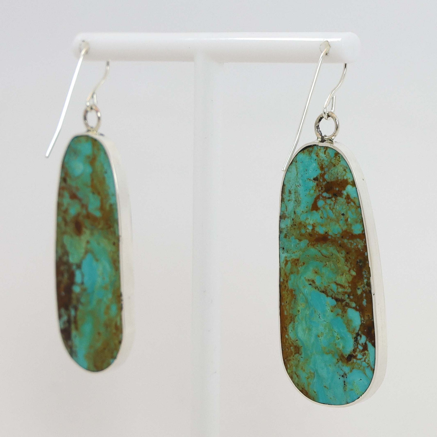 Sterling Silver French Hook Earrings with Hand-Cut Stabilized Turquoise Slabs and a Sterling Silver Border.