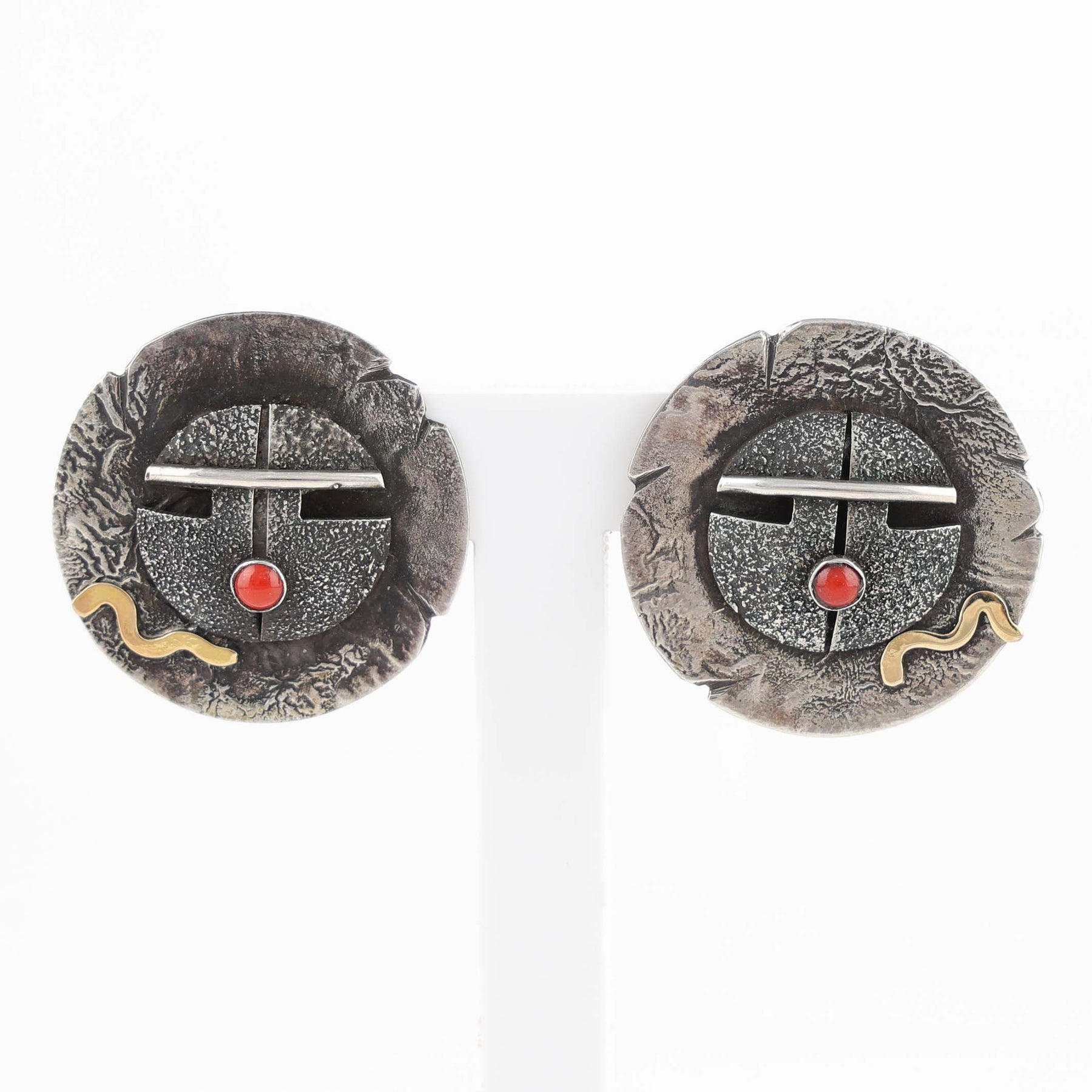 Sterling Silver Post Earrings with a Sunface Design and set with Coral and 14k Gold Snakes. Jolene Eustace is an award-winning jeweler. She is the daughter of Ben Eustace of Zuni Pueblo and Felicita Eustace of Cochiti Pueblo, both of whom were acclaimed potters.