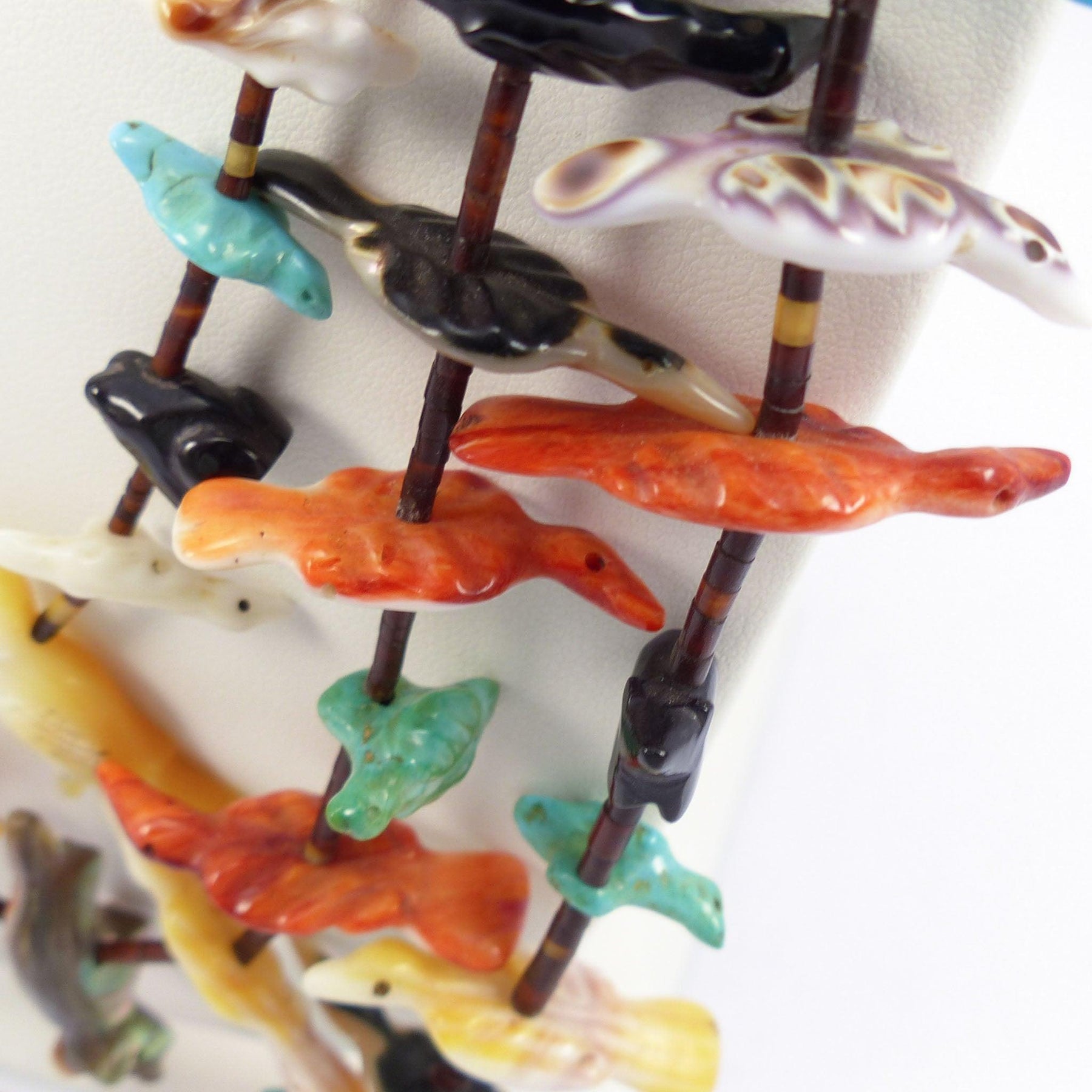Antique (1940s) Three Strand Zuni Fetish Necklace with Hand Rolled Tortoise Shell Heishi Beads and Hand Carved Zuni Fetishes made from Turquoise, Coral, Spiny Oyster Shell Abalone Shell, Mother of Pearl, and Jet. This fetish necklace comes with the original matching earrings featuring tortoise shell heishi beads and inlaid turquoise and jet flowers.
