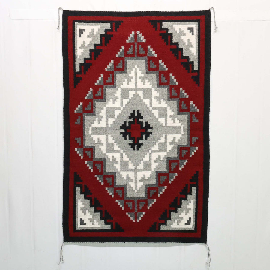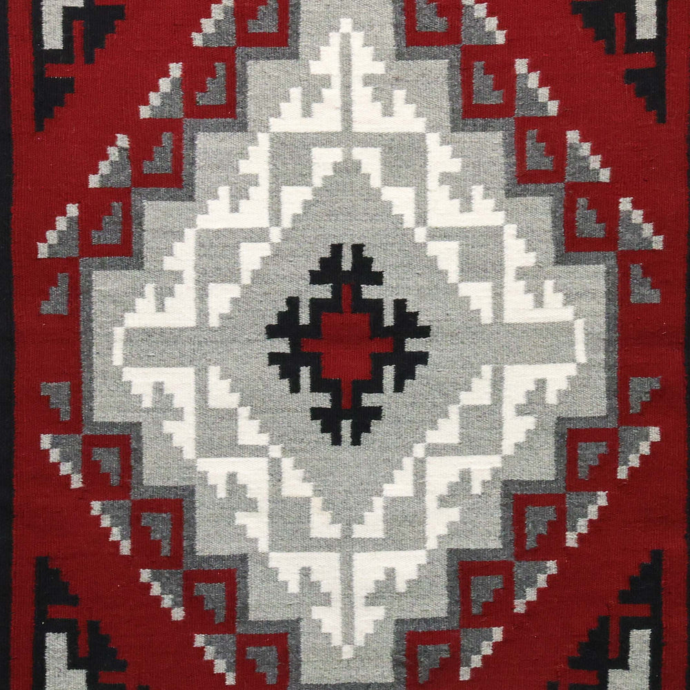 Today, Ganado rugs will have a red background with accent colors of black, grey, white, or brown. The central design features a single or double diamond and four triangles, one in each corner. Other design elements may include hook patterns, simple diagonals and cloud or stair design borders.