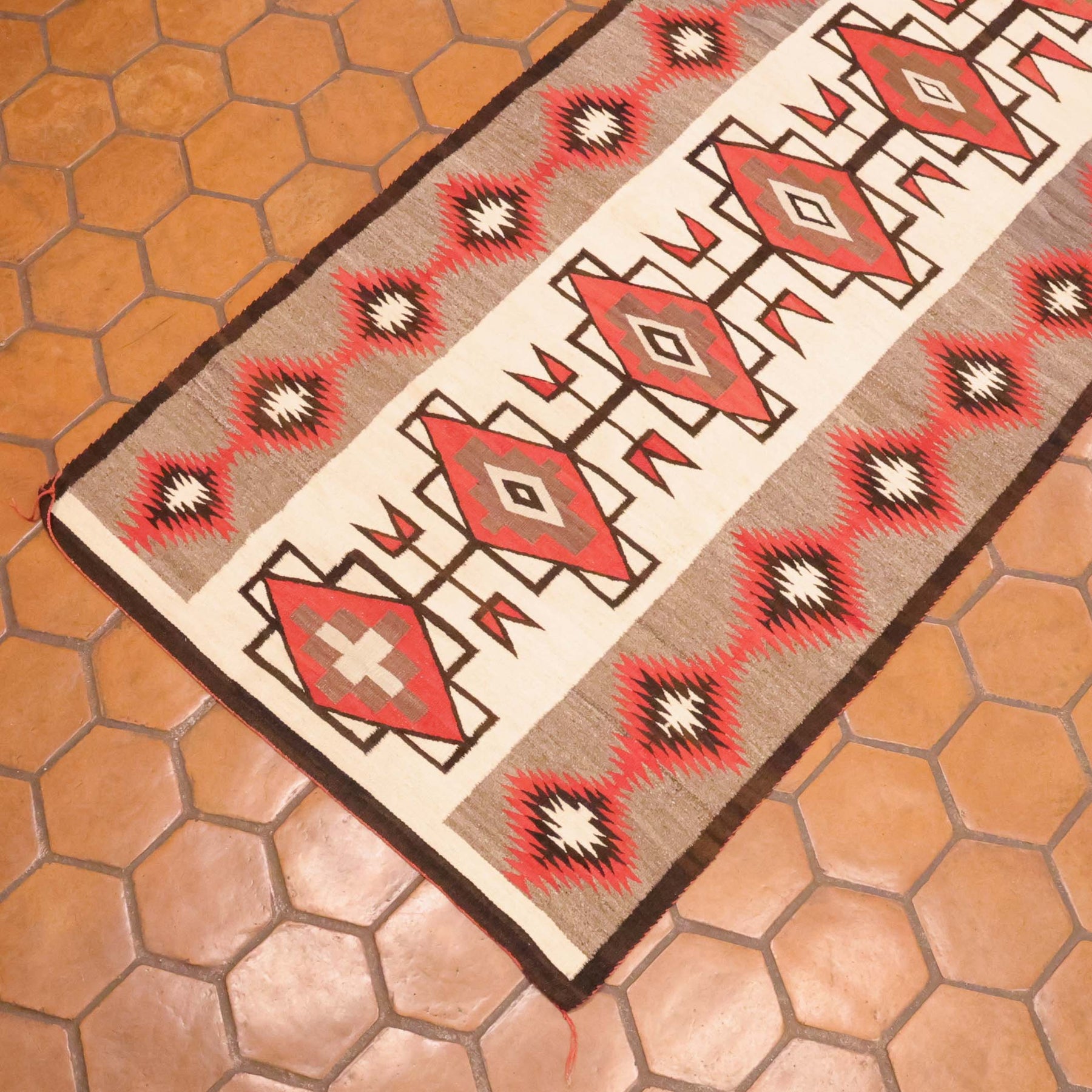 Handwoven 1930s Navajo Red Mesa Runner Weaving with Hand-Carded and Spun Wool Depicting a Central Yei Design Element. This weaving has one side with slight fading but otherwise in excellent overall condition.